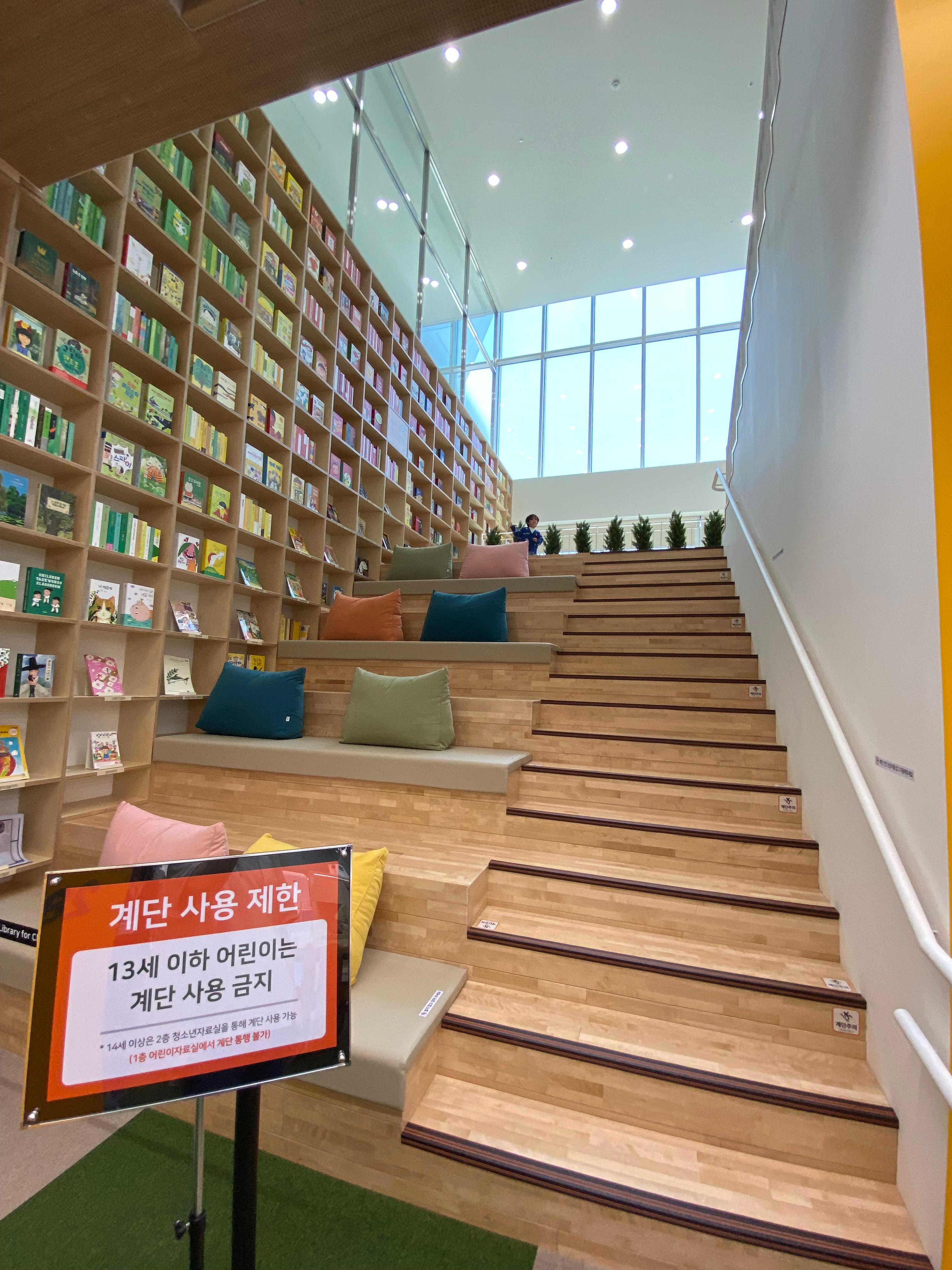 제가 울산도서관에서는 울산 올해의 책 읽기를 완전히 포기했는데 종갓집 도서관에서 올해의 책과 신상 책들을 자주 빌려보는데 울산어린이청소년도서관은 완전 전부 새삥 책들이 한가득이고 올해의 책도 많이 구비가 되어 있어서 서너 권 책을 빌렸더랬죠^^ 1층 실내에서 2층으로 올라가는 내부 계단이 있는데 여기를 이용해 올라가면 2층 청소년 도서관을 구경할 수 있습니다.
