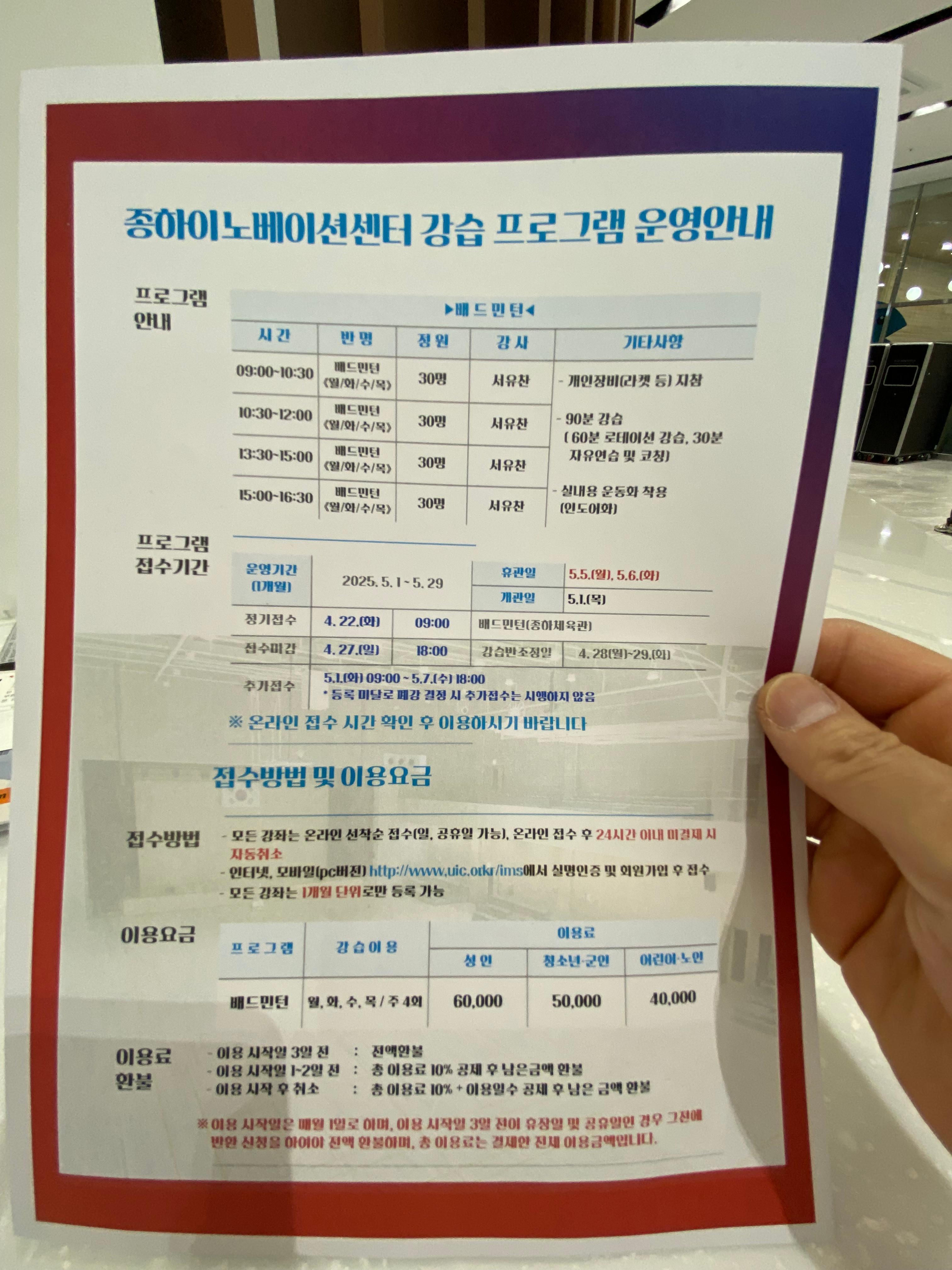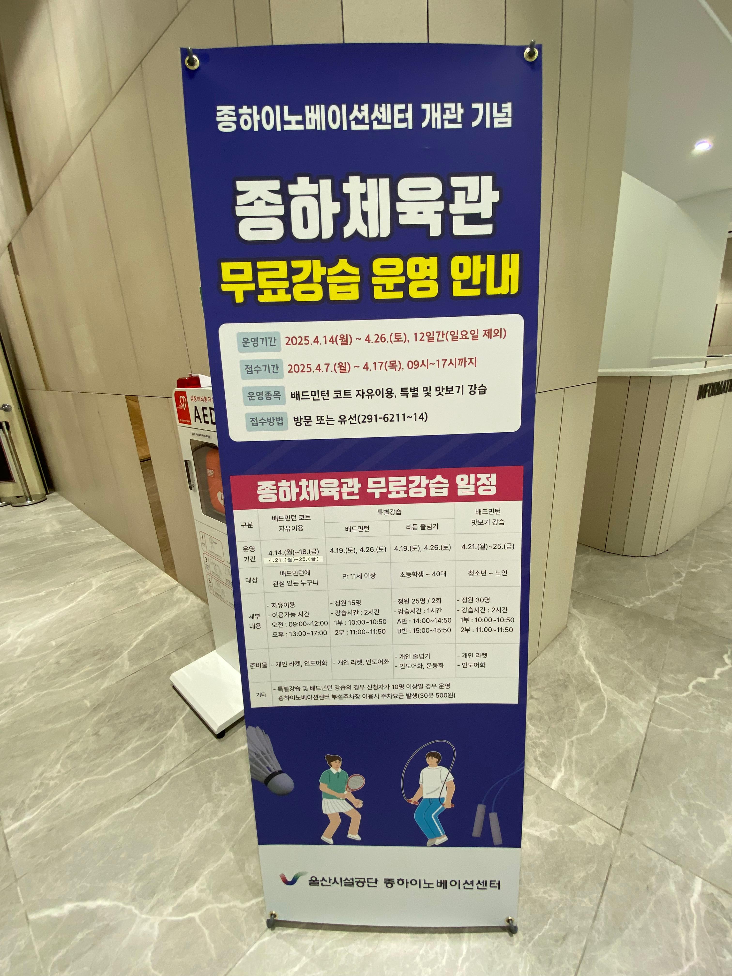 1층에는 종하체육관으로 운영되는 넓은 실내 체육관이 있습니다. 강습 프로그램은 일단 맛보기 수업으로 배드민턴, 줄넘기 수업이 진행되더군요.
