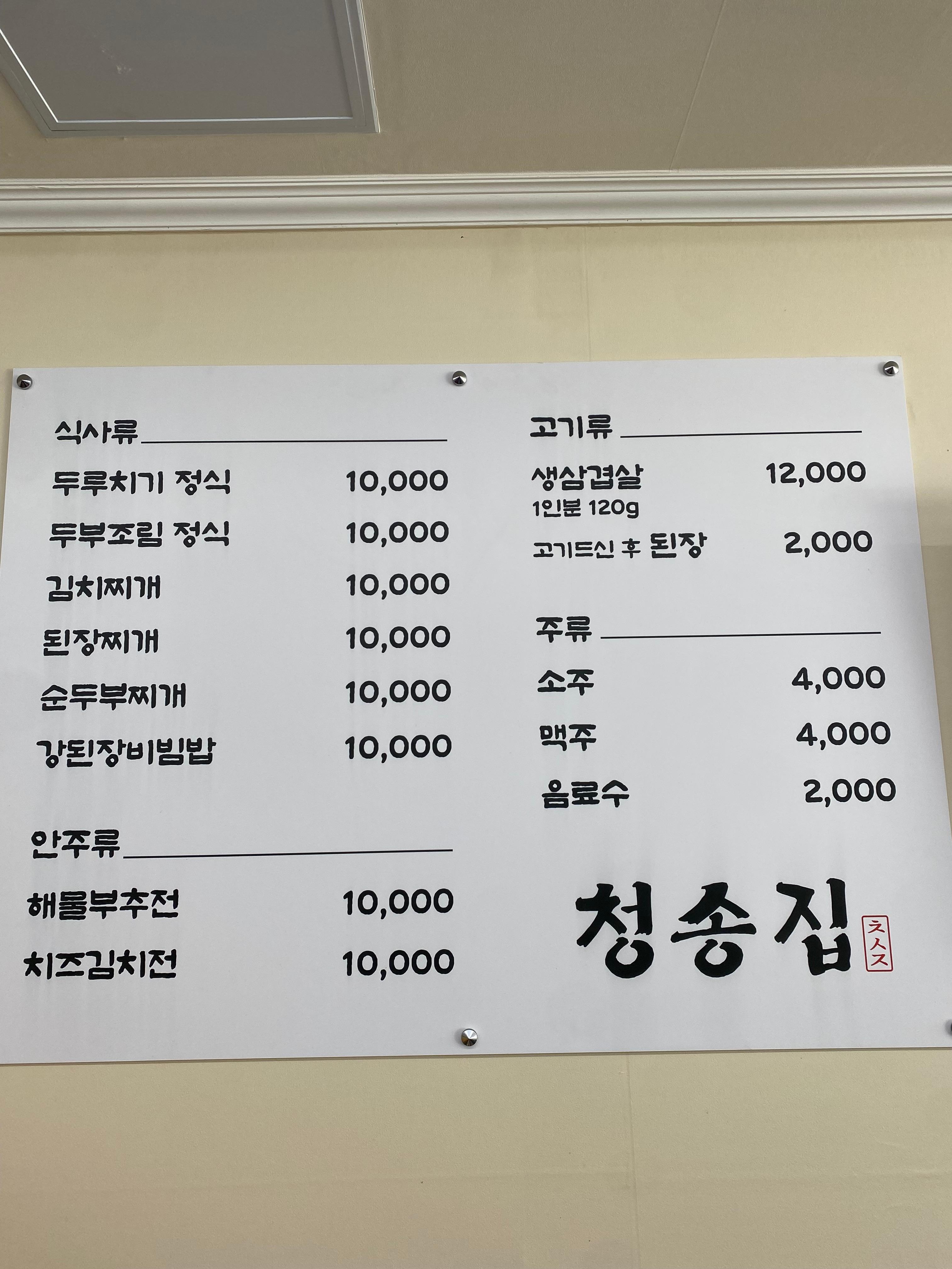 상호는 '청송집'이고 시청 뒤편 골목길에 있는데 입간판이 돌출간판이 아니라 한눈에 팍 뛰는 곳은 아니나 주변 건설 현장에서 인부들이 많이 찾기도 하고 시청 직원들도 많이 오가는 곳이니 점심시간은 잘 피해서 방문하시는 게 좋지 않을까 생각이 드네요.