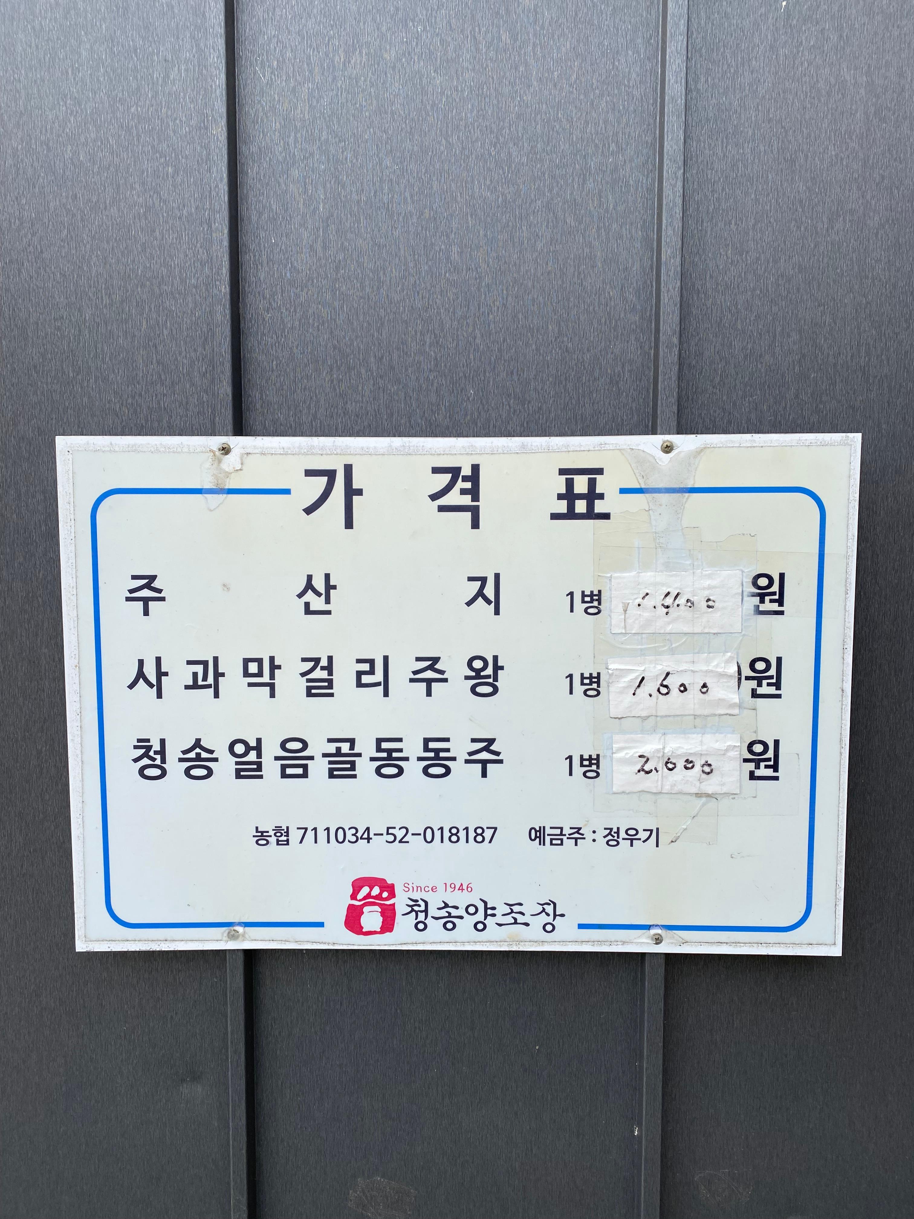 공장 사무실 앞에 붙여진 가격과 연락처가 막걸리 구경을 할 수 있는 유일한 방법입니다. 전화를 드렸더니 여긴 공장이니께 판매는 기본 10병부터 가능하다고 합니다. 낱개로 구입하려면 바로 앞 2분 거리에 있는 하나로마트에 가면 된다고 안내를 해주십니다. 10병은 너무 과하다는 생각이 들어 바로 하나로 마트로 이동을 했습니다.