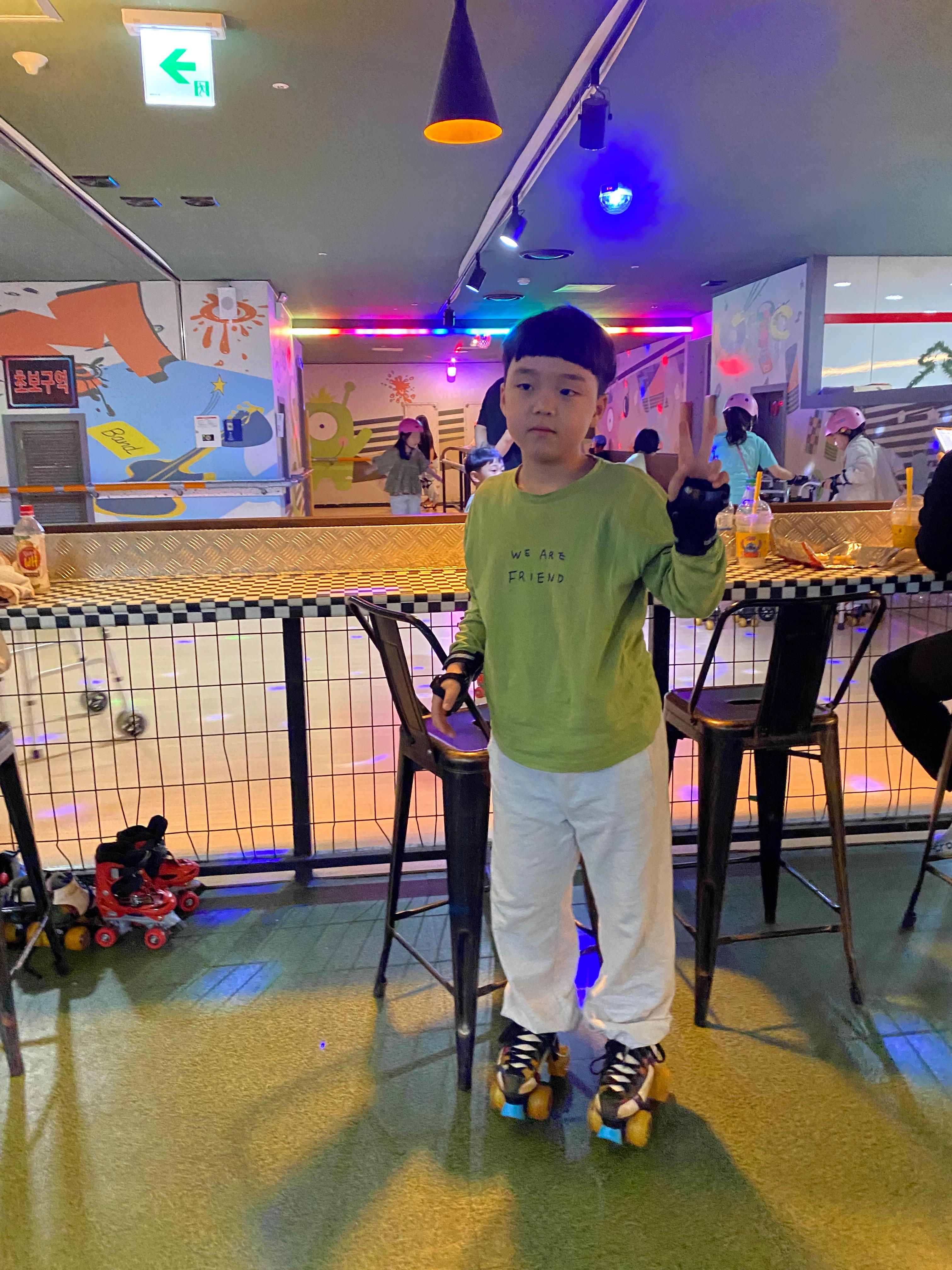 브이 한번 날려주고 본격적인 트랙으로 들어가서 롤러스케이트를 즐기는 시간을 가졌습니다. 아빠가 다녔던 그 시절엔 기본요금에 한 시간? 두 시간? 이용 시간제한이 있었는데 요즘은 시간제한 따윈 없어서 참 고마웠답니다. 다만 크로스롤러장을 이용하면서 가장 아쉬웠던 부분은 트랙이 좀 작다고 할까요? 직선 라인이 조금 더 긴 트랙이라면 스피드를 더 즐길 수 있었을 텐데.... 음악도 최신 케이팝 노래도 좋지만 런던 보이즈 같은 그 시절 팝 노래도 틀어주면 어땠을까...... 두 시간 금방 흘렀고 아들은 땀 범벅이, 아빠는 그 시절 폼을 찾느라 시간 가는 줄 몰랐답니다. 다음에 친구들과 같이 가보는 걸로 얘기를 마무리 지으면서 기분 좋게 크로스롤러장 후기를 끝내봅니다.