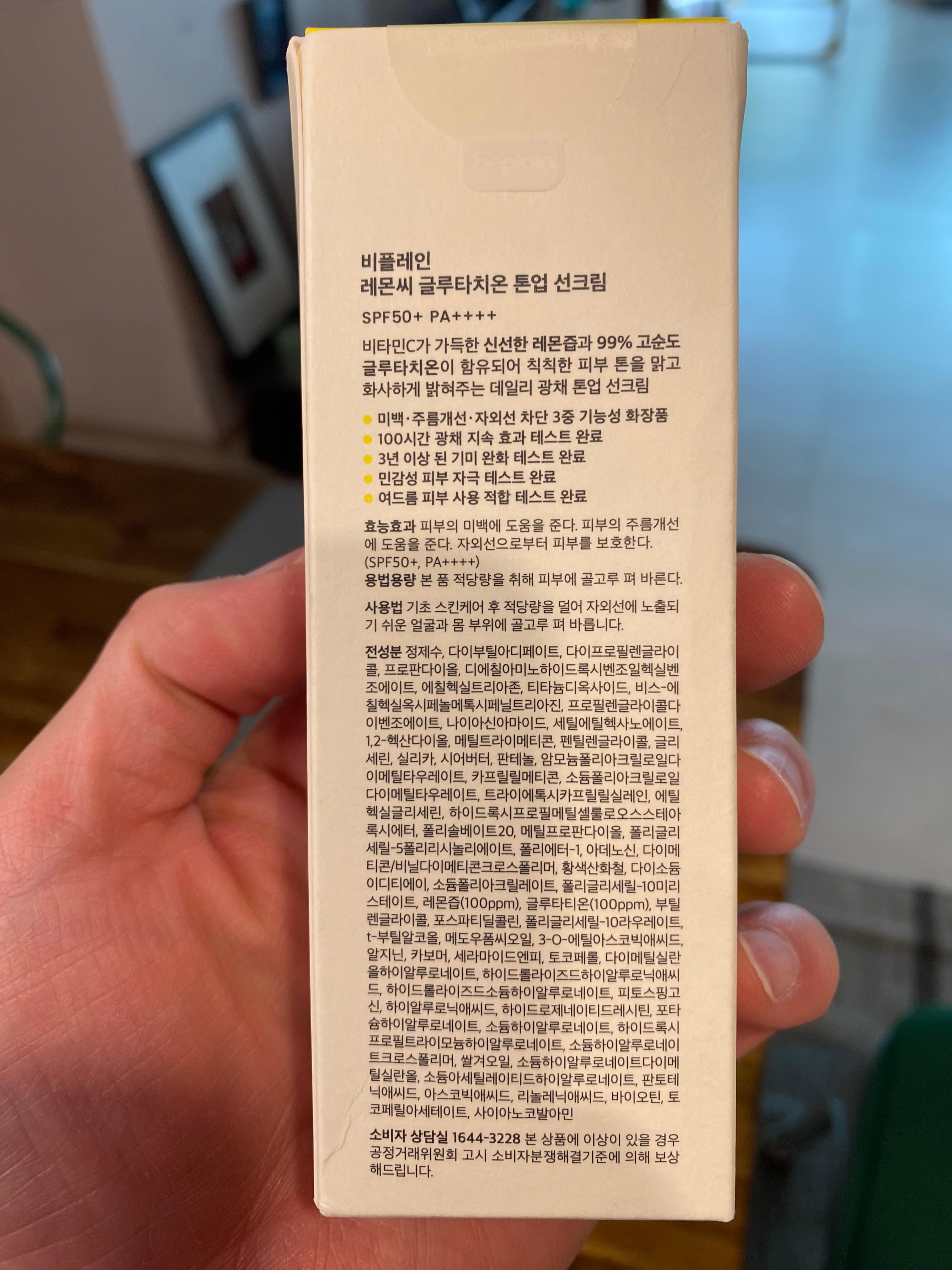 다음날 빠른 배송으로 집에 도착했고 서둘러 내용물을 확인해 봅니다. 뒷면을 보니 피부 미백, 주름개선에 도움을 주는 선크림이라고 안내되어 있습니다.