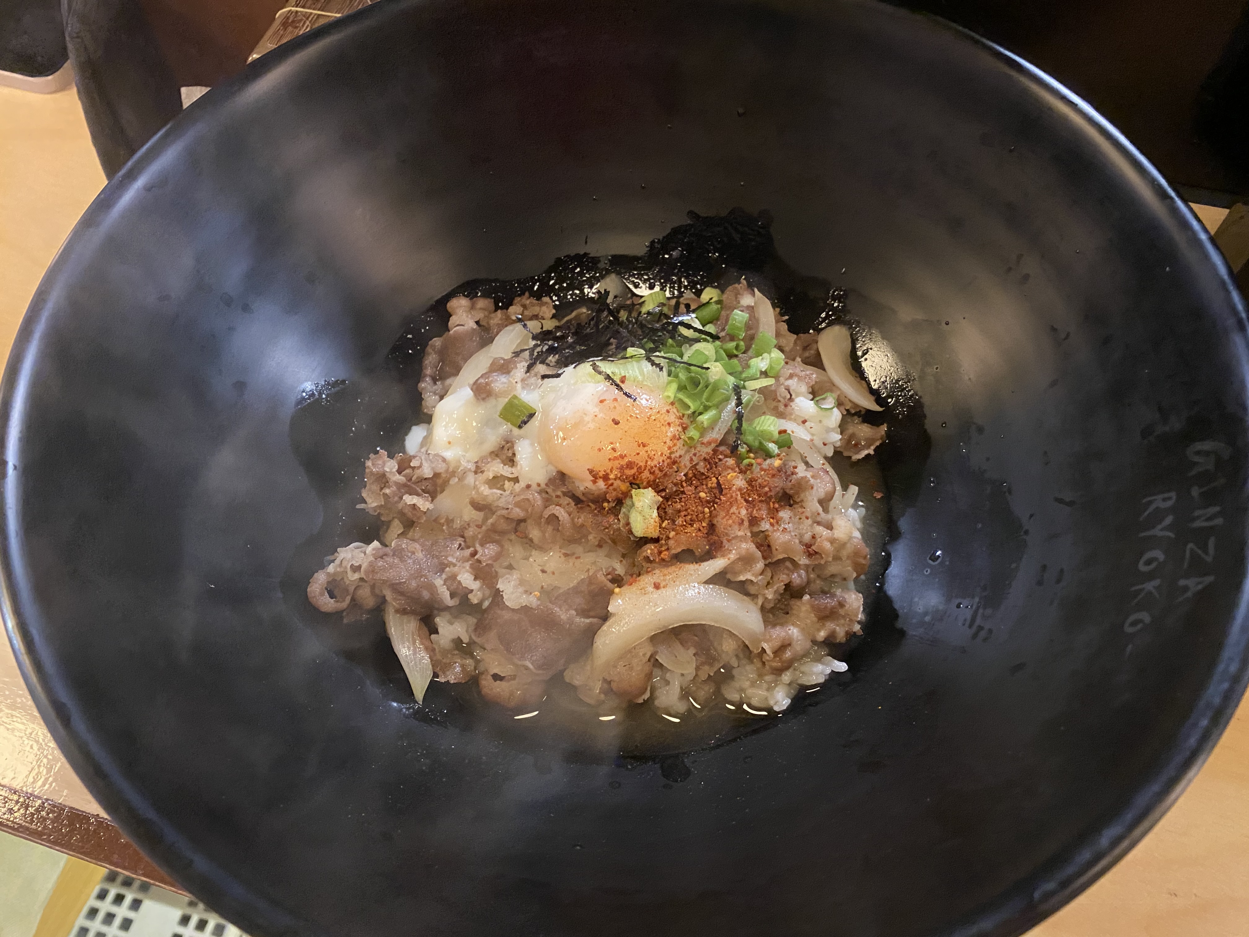 아빠는 밥이 먹고 파서 규동(소고기 덮밥)을 시켰습니다. 사진으로는 표시가 잘 안 났으나 규동 담은 접시가 어마어마하게 큰 사이즈입니다. 계란을 터뜨려 슥슥 비벼 먹으니 일단 제 입맛엔 합격!!! 그릇의 크기에 비해 내용물은 너무 작아서 몇 번 숟가락질에 금세 바닥이 나버리는 규동입니다.