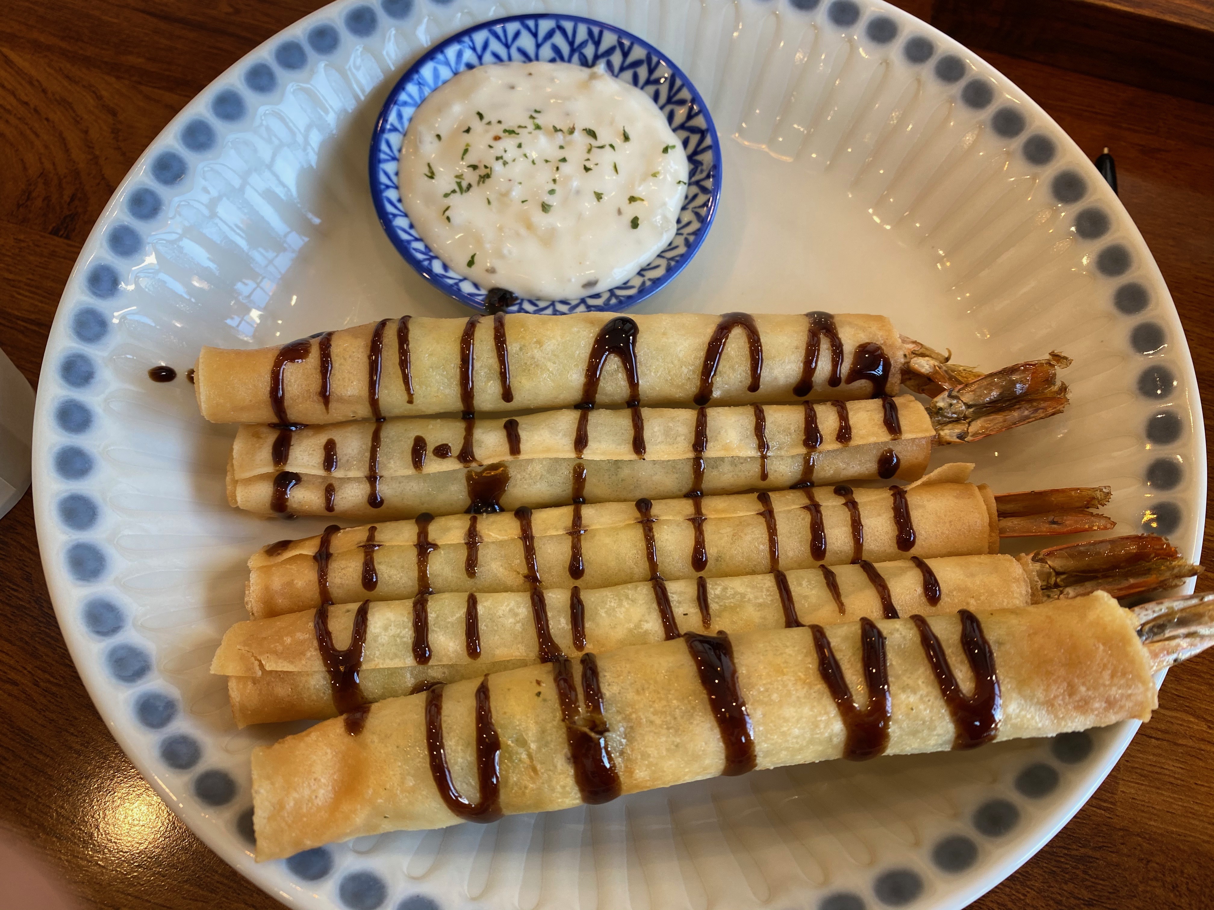 특이한 새우튀김 되겠습니다. 보통 튀김가루를 묻혀서 튀기는 새우가 아니라 라이스페이퍼 같은 걸로 감싸서 튀김을 했네요. 식감은 훨씬 더 바삭바삭한데 새우 맛이 많이 나지가 않았던 거 같습니다.
