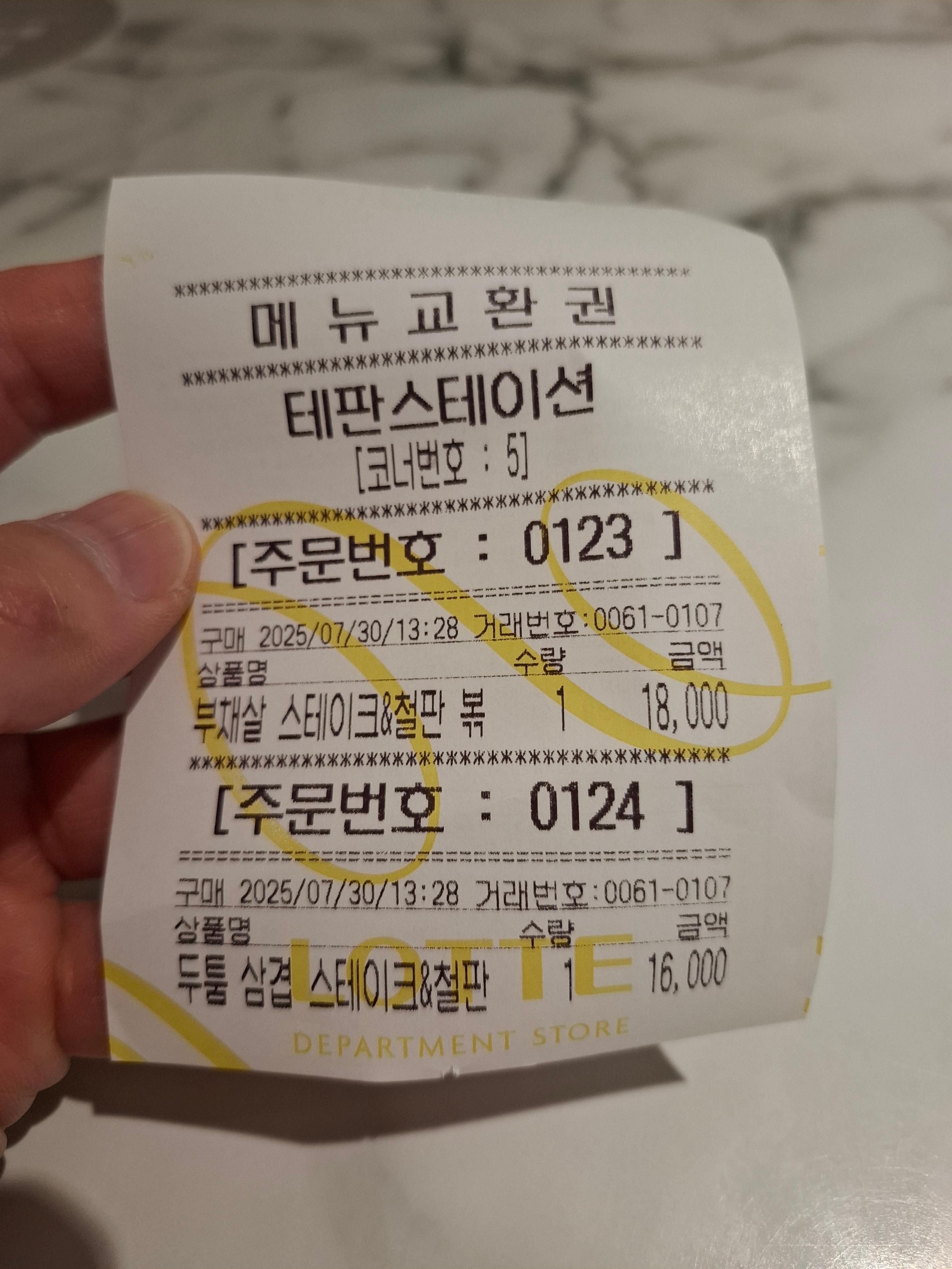 부채살 스테이크 철판볶음밥과 두툼 삼겹 스테이크 철판볶음밥을 하나씩 주문했습니다.