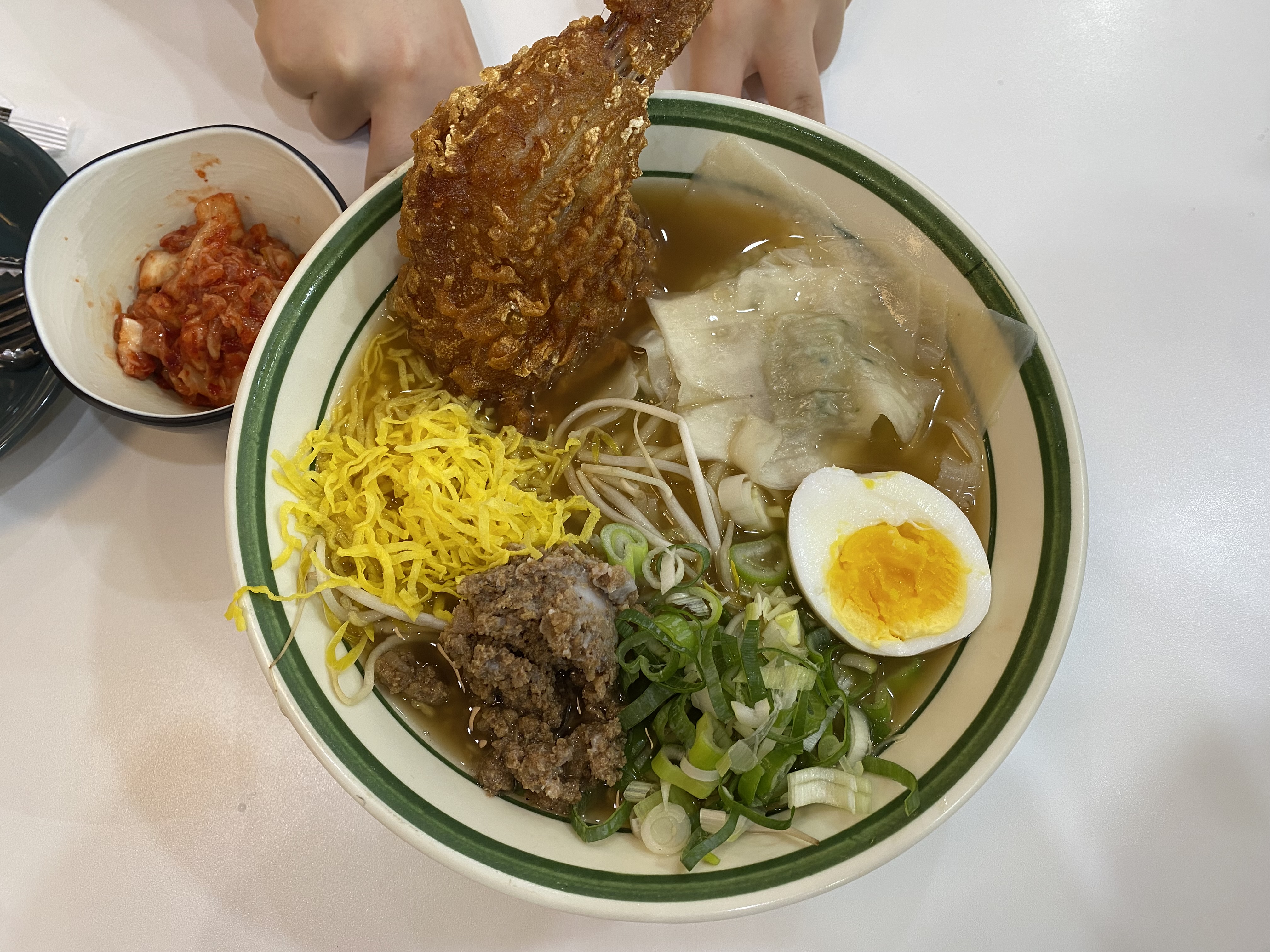 성수 완당면에 토핑이 치킨 + 반숙계란이 나왔습니다. 그리고 가지만두도 나왔고요.