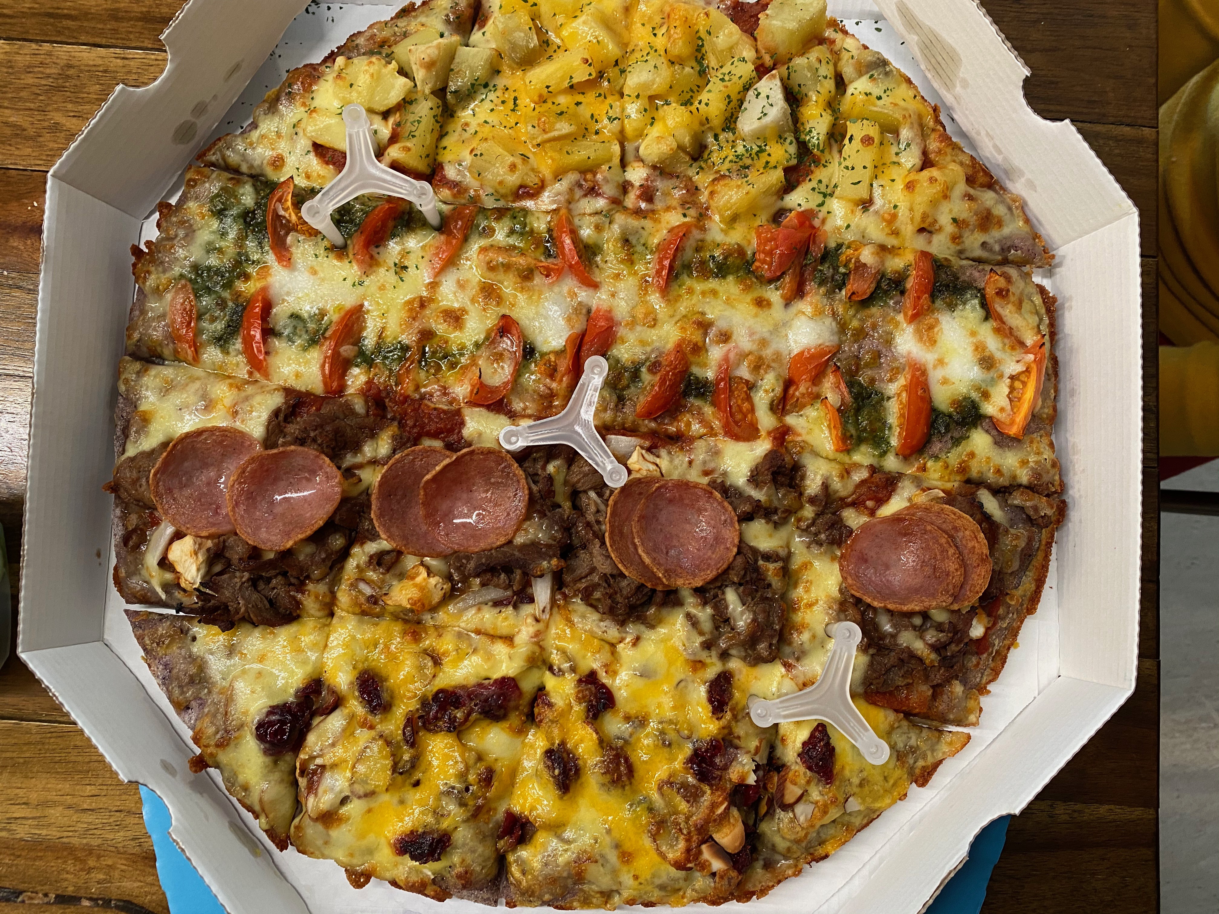 아들이 건포도 계열을 너무 좋아해서 일부러 꿈을피자 시켰는데 결과는 사진 기준으로 맨 윗 라인인 감자+파인애플 조합의 피자 한 줄을 클리어~ 하는 먹성을 보여줬습니다. 아무리 맛있다고 해도 맨 아랫줄의 크린베리가 들어가 있는 피자는~~ 그 덕에 엄빠는 나머지 3/4 영역의 피자를 전부 먹어야 했지요. 중간 라인의 토마토가 들어간 피자와 불고기 피자는 맛이 완전 극과 극인 대칭점에 서있는 피자였는데 둘 다 참 맛있었습니다. 슴슴하니 토마토 피자 한입 먹다가 짭짜리한 불고기 피자 한입 먹고~~ 달콤 고소한 크린베리 피자도 곁들여서 캬~~ !!