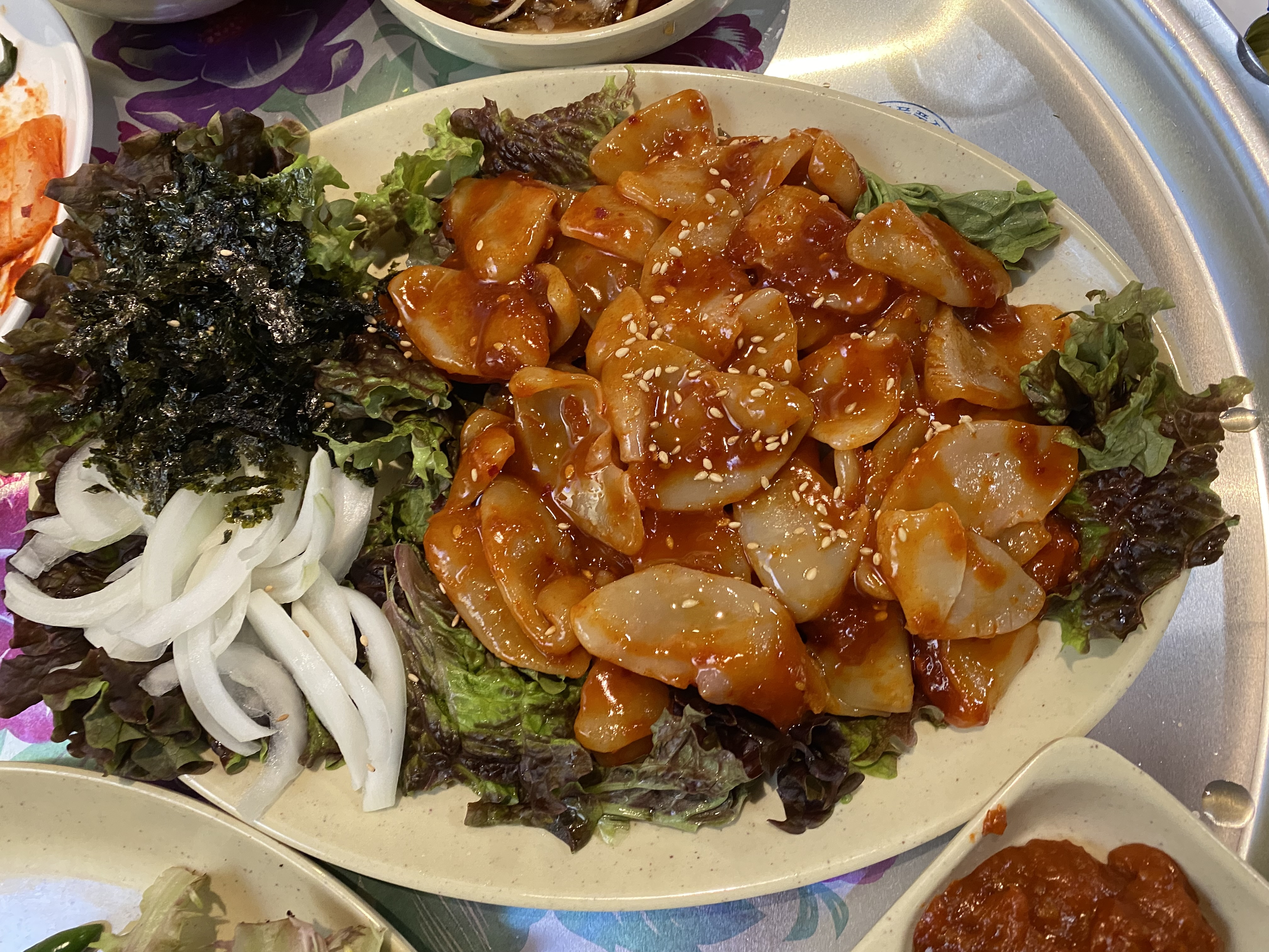 새콤 매콤하면서 쫀득한 식감이 살아있어 배가 터질 거 같은데도 자꾸 손이 가는 메뉴였습니다.