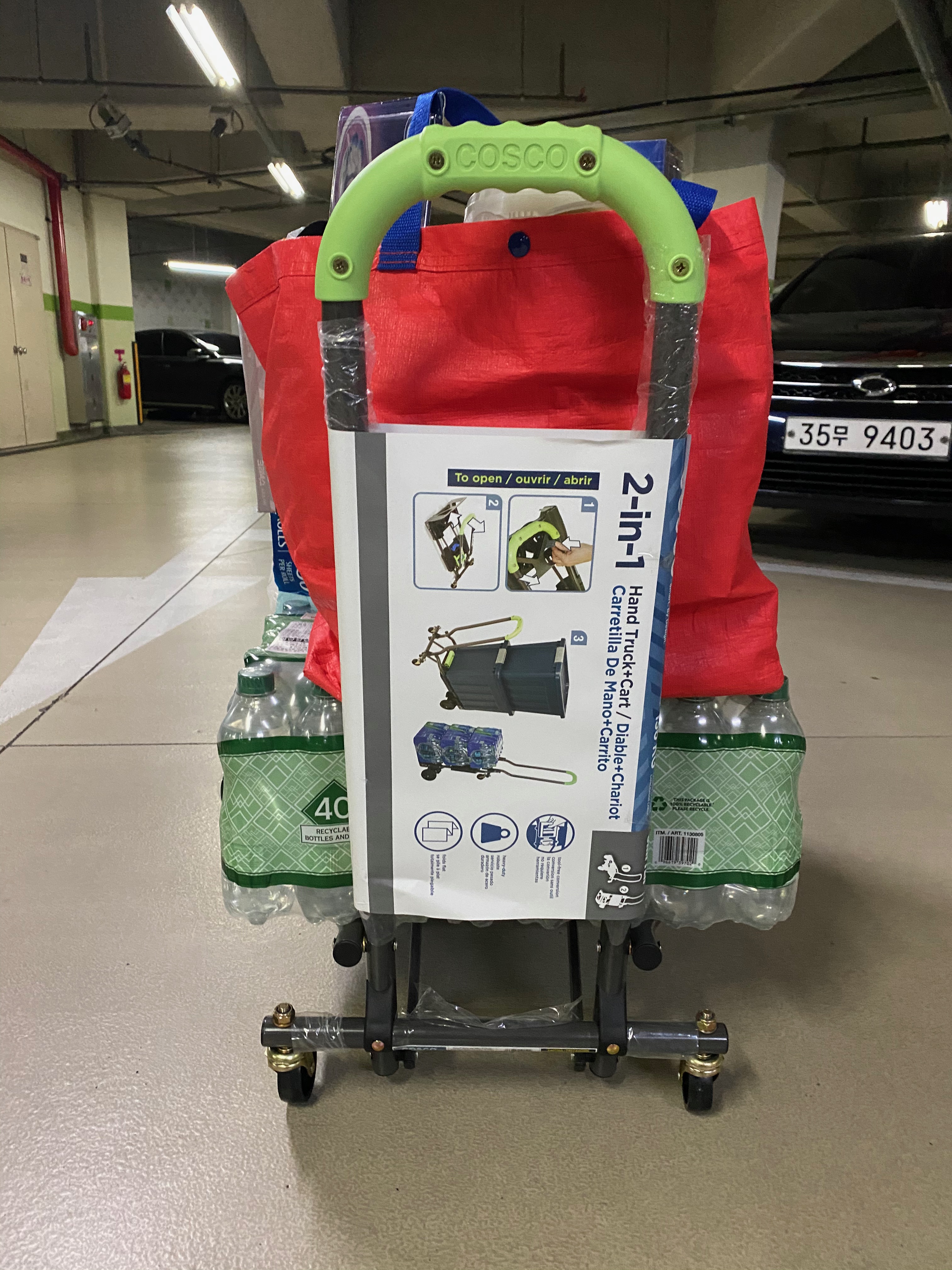 3개월에 한 번씩 코스트코에 가서 필요한 생필품을 한가득 사 오는 게 하나의 생활 패턴으로 자리 잡았습니다. 갈 때마다 꼭 사 오는 생필품은 코스트코 자체 브랜드로 나오는 3겹 화장지, 갑 티슈, 생수, 스파클링 워터 등이 있습니다. 벌써부터 한짐이지요? 얼마 전에 코스트코에 가보니 훨씬 다양한 제품들로 소비자를 유혹하던데요 오늘은 큰맘 먹고 구입한 코스코 접이식 2in1 핸드 트럭+카트에 대해 소개해 볼까 합니다.