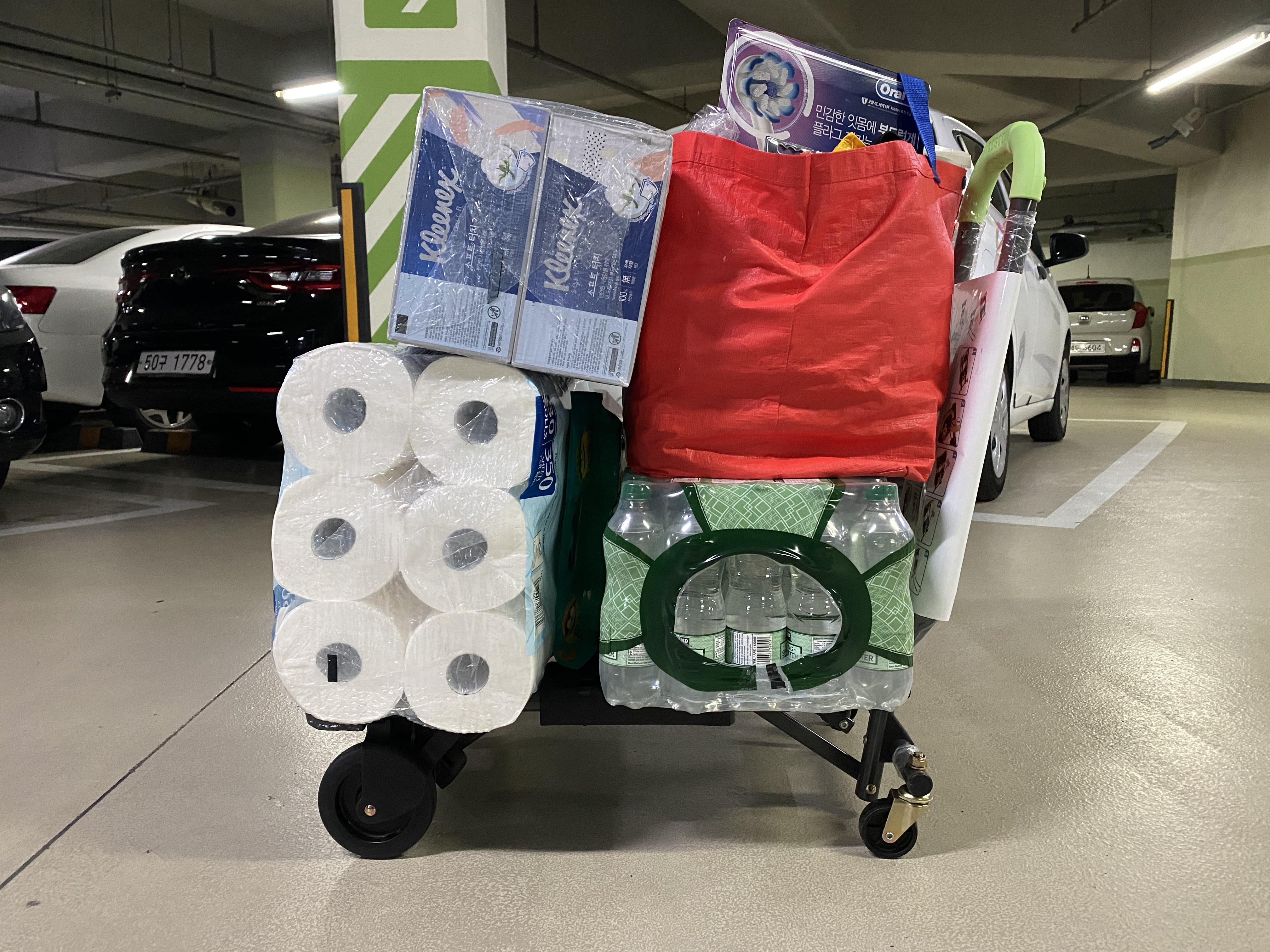 구입 당시 세로로 수직으로 쌓아서 옮기는 카트도 판매를 하고 있었는데 두 가지 제품을 고민 끝에 요 제품으로 구입을 했었답니다. 가격은 세로 모드 카트 제품보다는 1.5배 정도 비싼 4만 원 후반대에 구입을 했고 무게는 30퍼 정도 더 나가는 제법 묵직한 카트입니다. 아쉽게도 세로 모드의 사진은 사용을 안 해서 담지는 못했는데 아무래도 손수레 모드를 주로 사용하지 싶습니다. 참고로 그날 장본 물건들은 집에 있는 접이식 소형 핸드카트를 사용했었더라면 기본 세 번은 왔다 갔다 했었는데 한방에 클리어했답니다^^