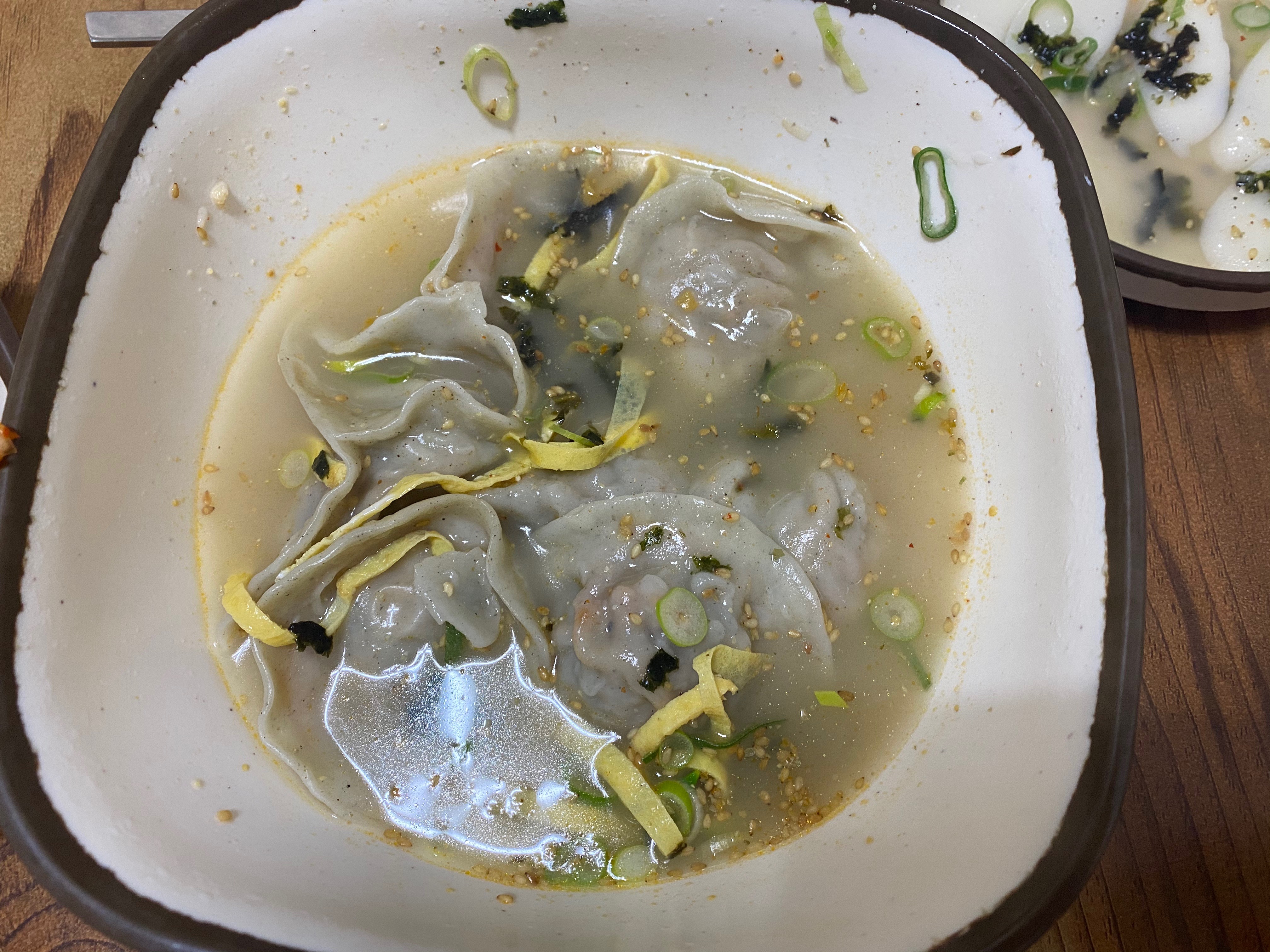 아직 매운 걸 못 먹는 아들을 위해 만둣국을 시켰건만...ㅠㅠ 만둣국이라 방심했나 봅니다. 만두소에 땡초가 들어가 있어서 국물 맛이 조금 매콤한 것이.. 아들 결국 숟가락을 놓으며 강하게 도리도리~ 매워서 안 먹겠다고 합니다.