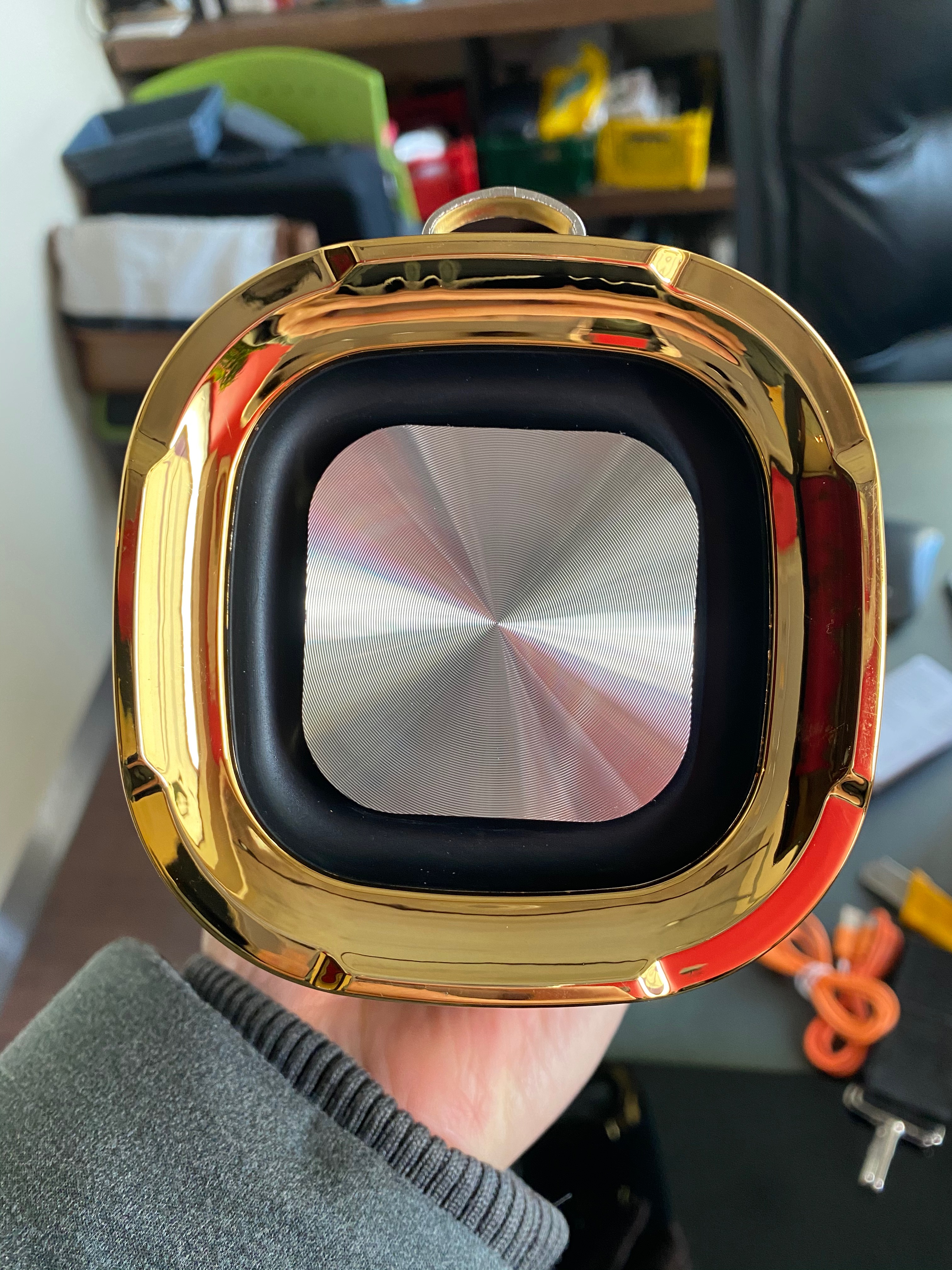 크기는 앞번에 사용하던 스피커보다 두 배 정도 큰 녀석입니다. 마크 표시된 앞면에 스피커가 있고 양측면에 우퍼 스피커가 있습니다.