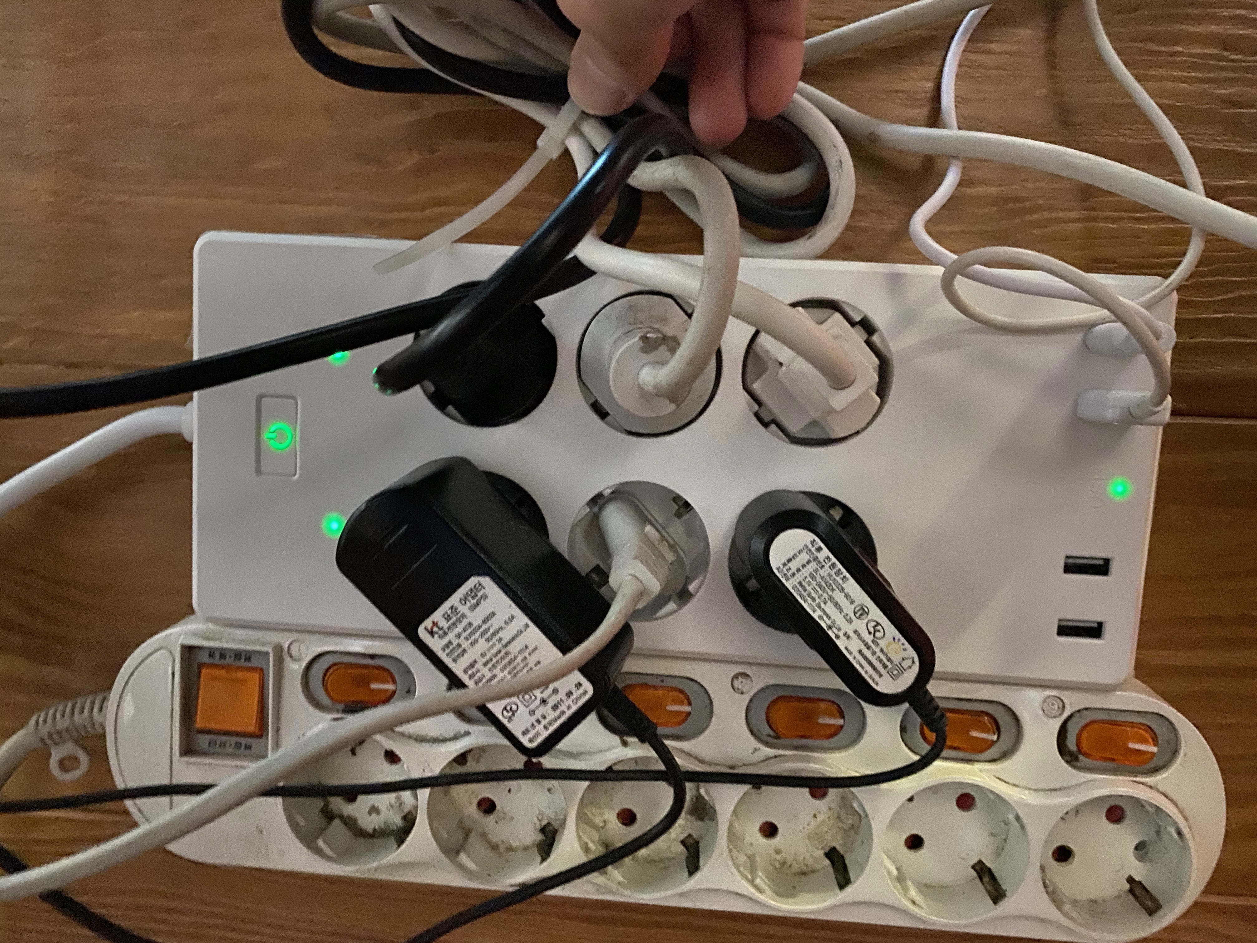 아래는 기존 6구짜리 멀티탭인데 개별 전원을 관리할 수 있는데 허리를 숙여 일일이 켜줘야 하는 불편함 때문에 잘 .... 위에 신형 스마트 플러그로 싹 갈아타줬습니다. 파워 버튼 녹색 불과 총 세 군데 녹색불이 들어온 거 보이시죠? 그룹별로 220볼트 전원은 3+3 그룹 지어 파워 조절을 할 수 있고 usb 포트는 4채널 하나로 묶여있습니다.