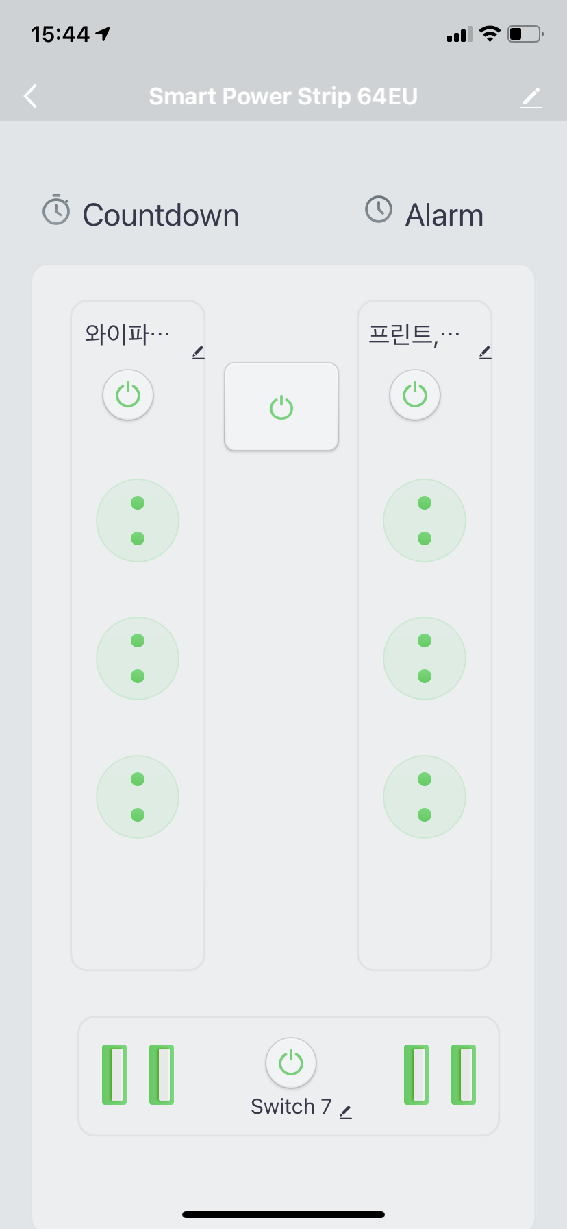 연동된 앱에 나와있는 모습을 캡처해 봤습니다. 보시다시피 전원 버튼이 총 네 개 보이죠? 세 그룹으로 전원관리를 하고 메인 하나로 통합 관리를 해주는 시스템입니다. 그래서 저는 220볼트 1채널에 상시로 전력이 들어와야 하는 세 개의 콘센트를 꼽아줬고 두 번째 채널에 나머지 세 개는 하루 반나절만 전력이 들어와도 되는 제품으로 콘센트를 꼽았고요, usb 전력지원 채널은 진짜 이 제품 강추하는 신의 한수인거 같습니다. 책상에 지저분한 usb 연결선들을 아래로 싹~~!! 속이 시원 해집니다^^