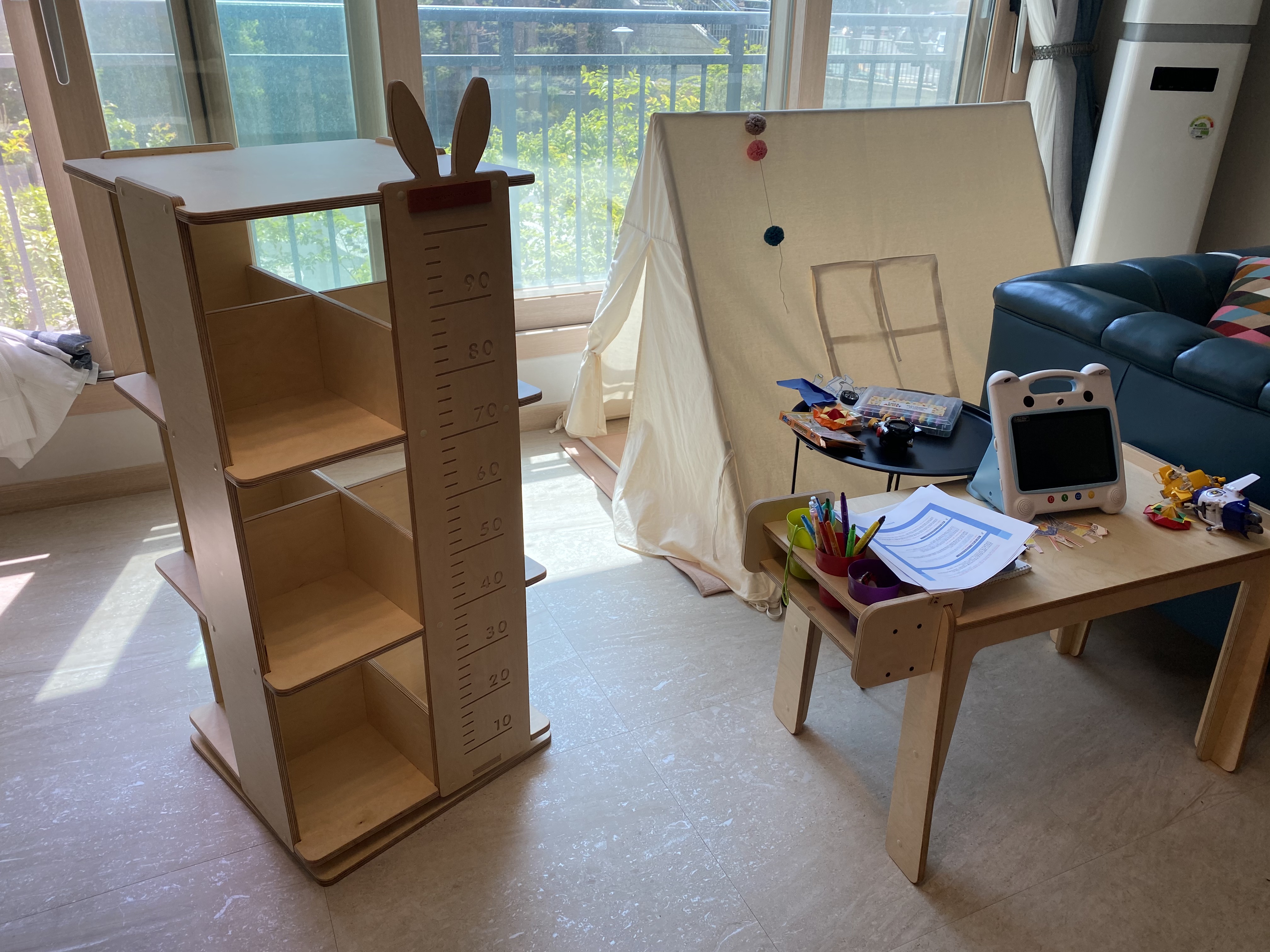 아이 방이 있지만 윙크 학습기 덕에 요즘 거실 학습이 굳어진 상태라 거실에 책장을 놓았고 인디언 텐트에 책상에 책장까지... 햇살 가득 들어오는 거실 유리창 쪽이 꽉 차버렸습니다.