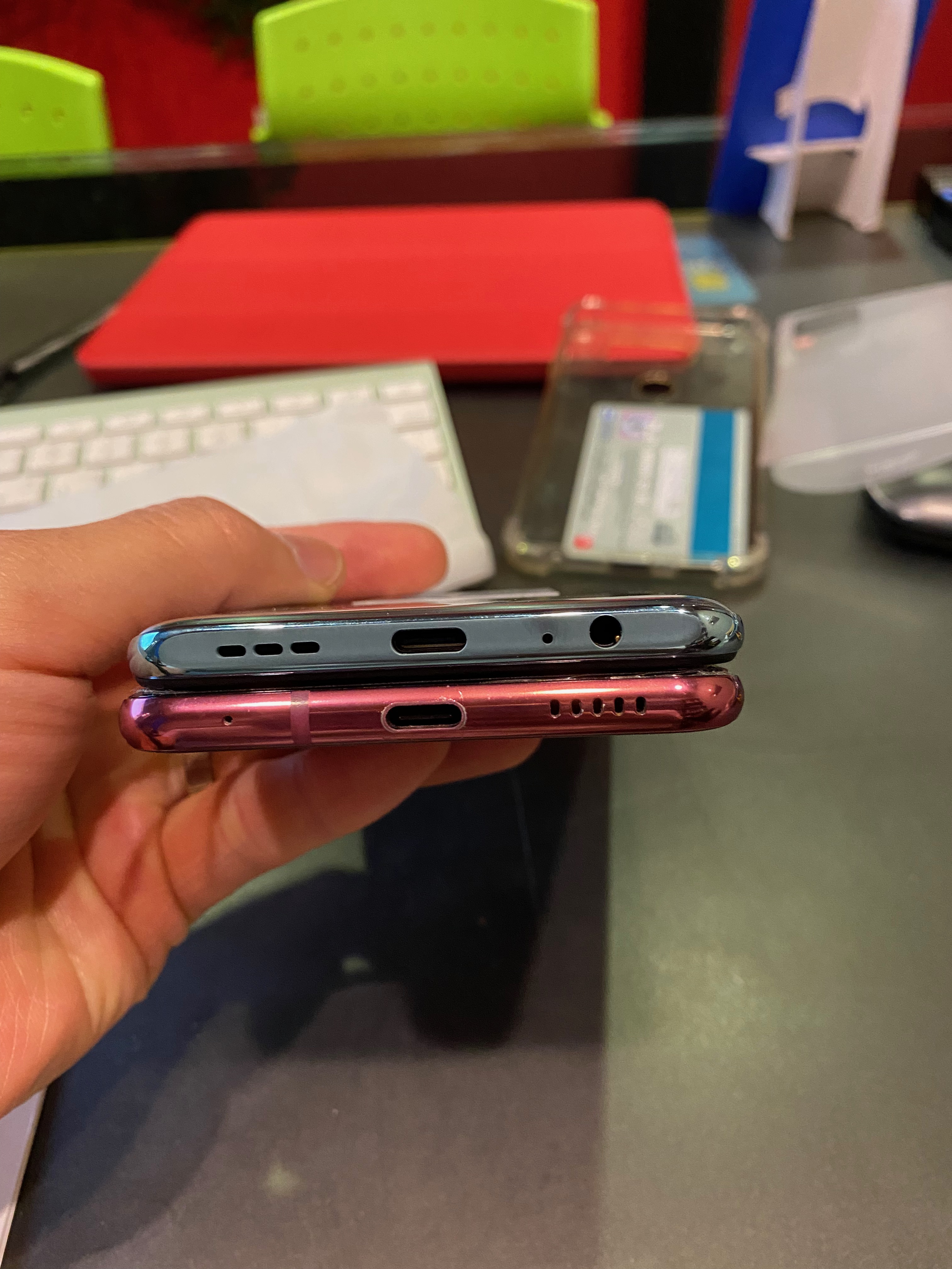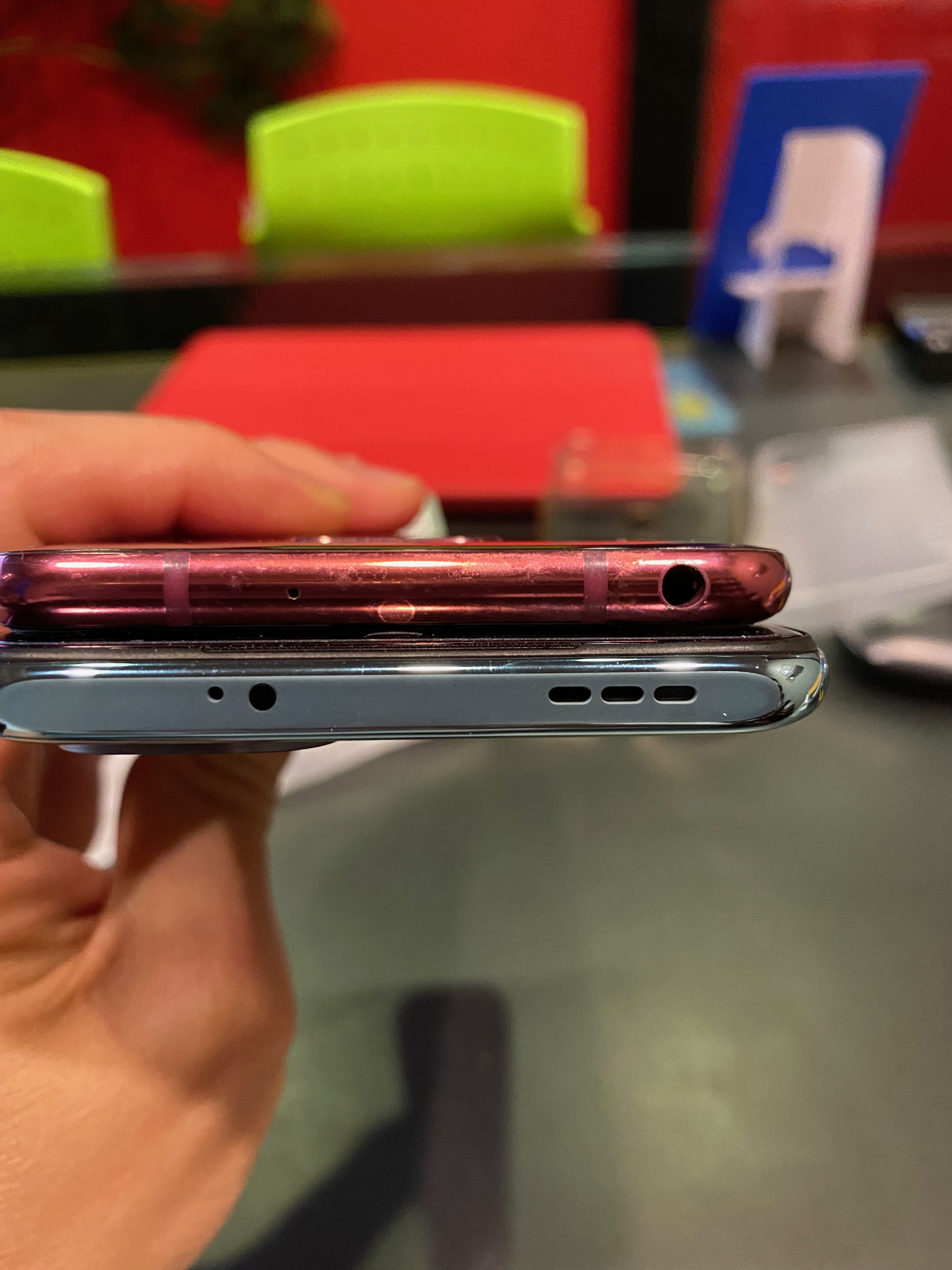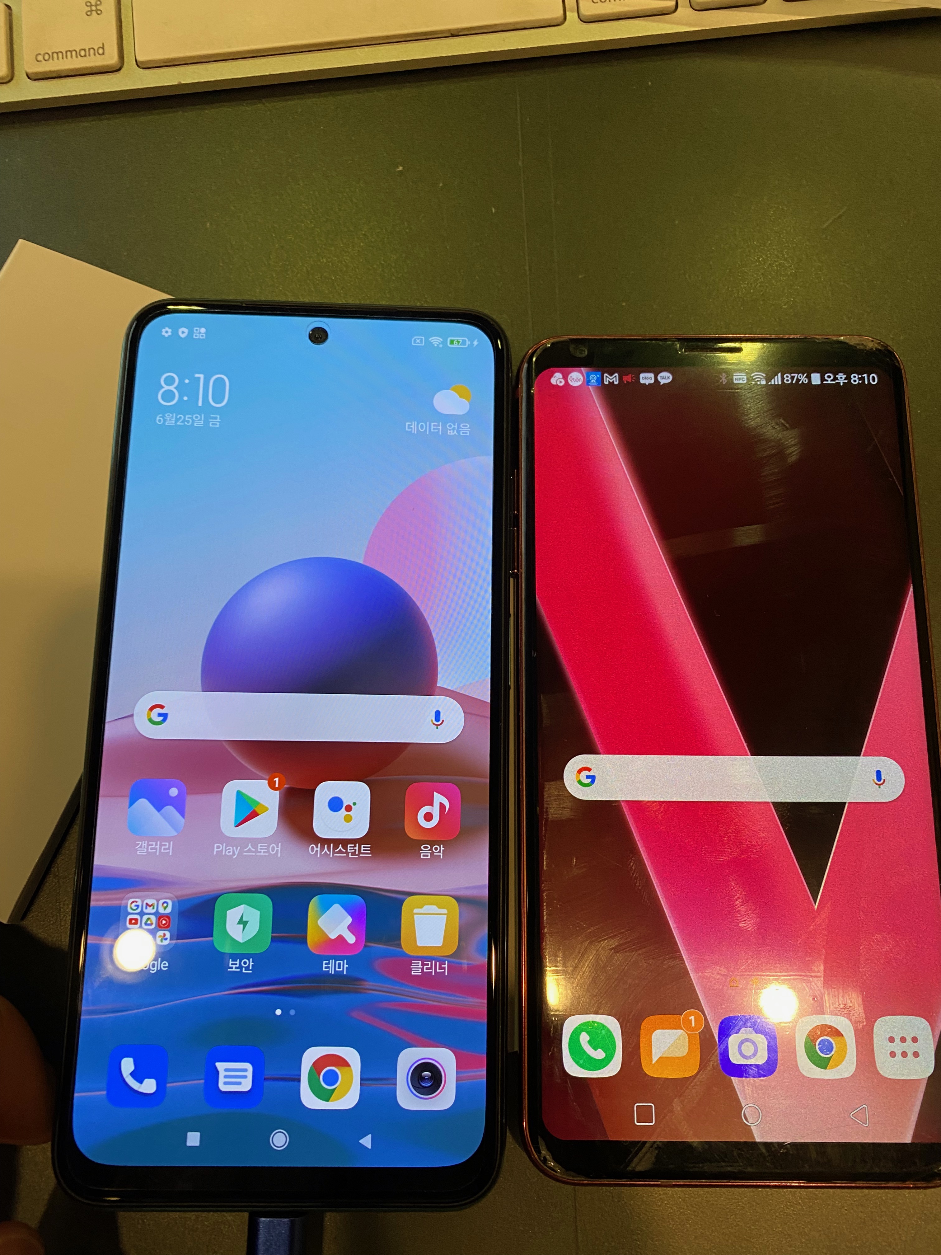 기존 v30 제품과 비교 인증샷을 올려봅니다. 가로폭은 거의 비슷해서 차이를 못 느끼고 세로로 길이가 홍미 노트 10이 더 깁니다.