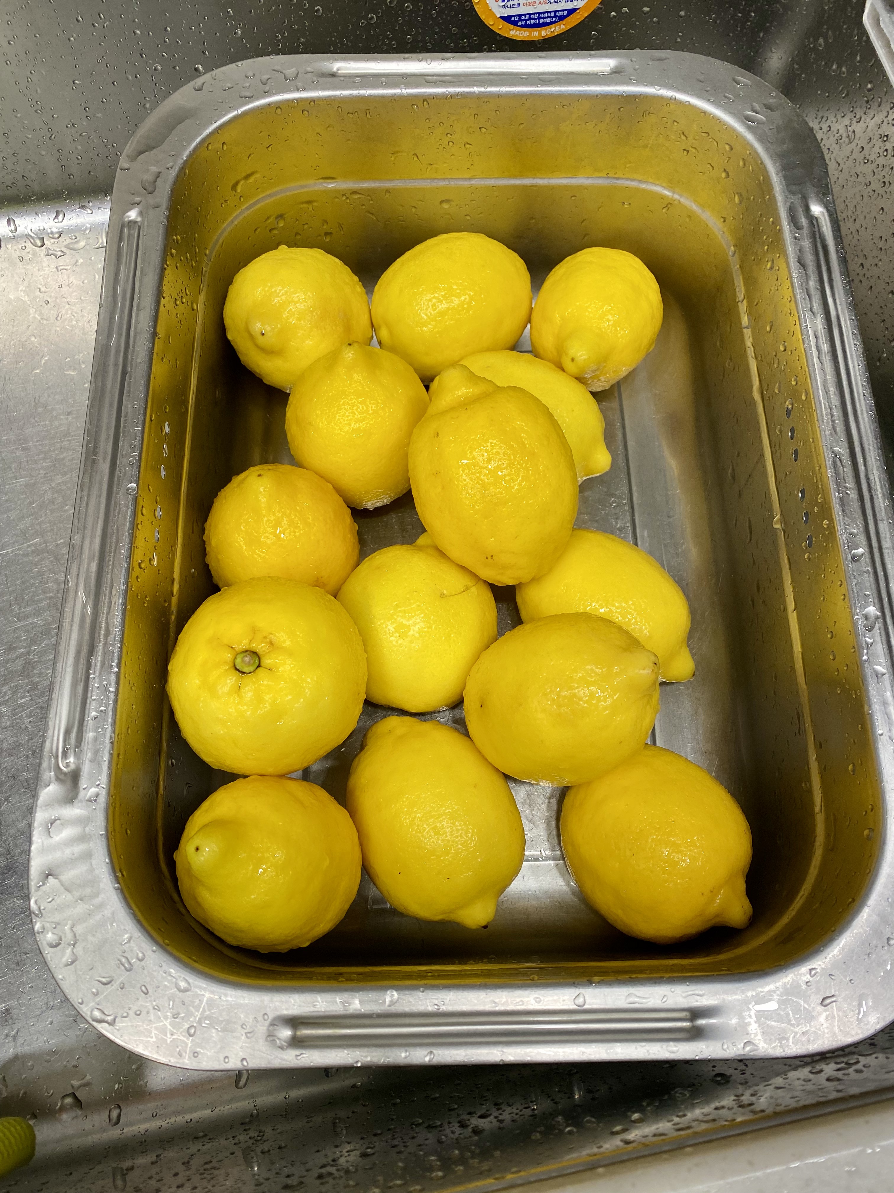 올해 봄에 코스트코에 들렀다가 사 온 레몬을 김치냉장고에 잘 보관했다가 6월이 되어서야 꺼내서 레몬청을 담아봤습니다. 6살 아들의 레몬 홀릭에 한겨울에 따듯한 레몬차를~ 한여름엔 스파클링 워터와 함께 믹서기에 갈아서 레모네이드를~ 시중에 파는 레몬청으로는 아들의 식성에 비해 양이 너무 적어서 작년 가을에 레몬청 담기에 나섰다가 과도한 설탕 투입으로 달아도 너무 달다리한 레몬청 만들기가 된 경험이 있습니다. 그때 채칼 함부러 사용했다가 손가락 날라갈뻔한... 아찔한 경험도 있었죠. 그때의 실패와 경험을 토대로 이번에는 반드시 성공하리라 맘먹고 레몬 다듬기에 집중해 봅니다.