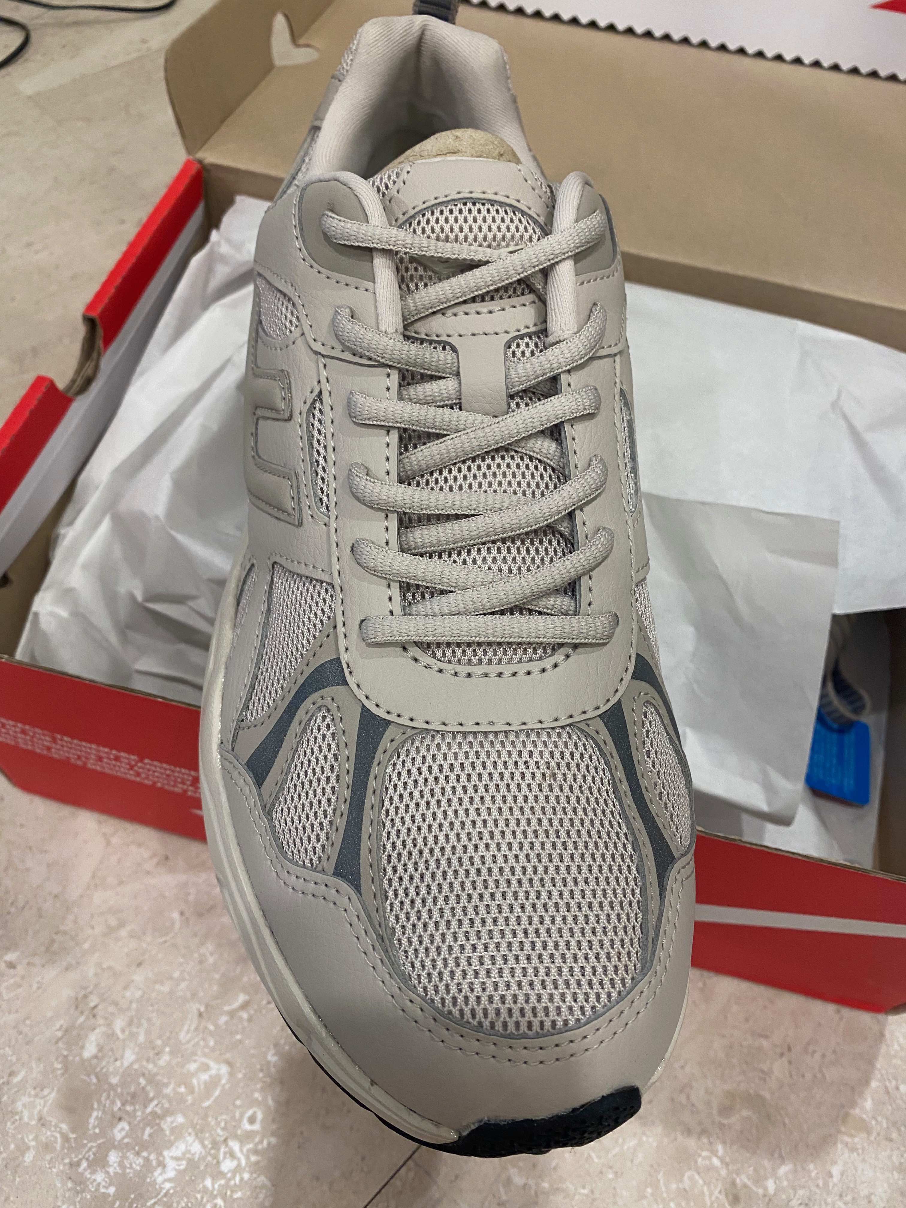 눈에는 아이보리 색상으로 보였는데 사진에는 회색빛깔 운동화처럼 찍혔습니다. 노란색 조명이라 아이보리 색이 회색으로 나온 듯....