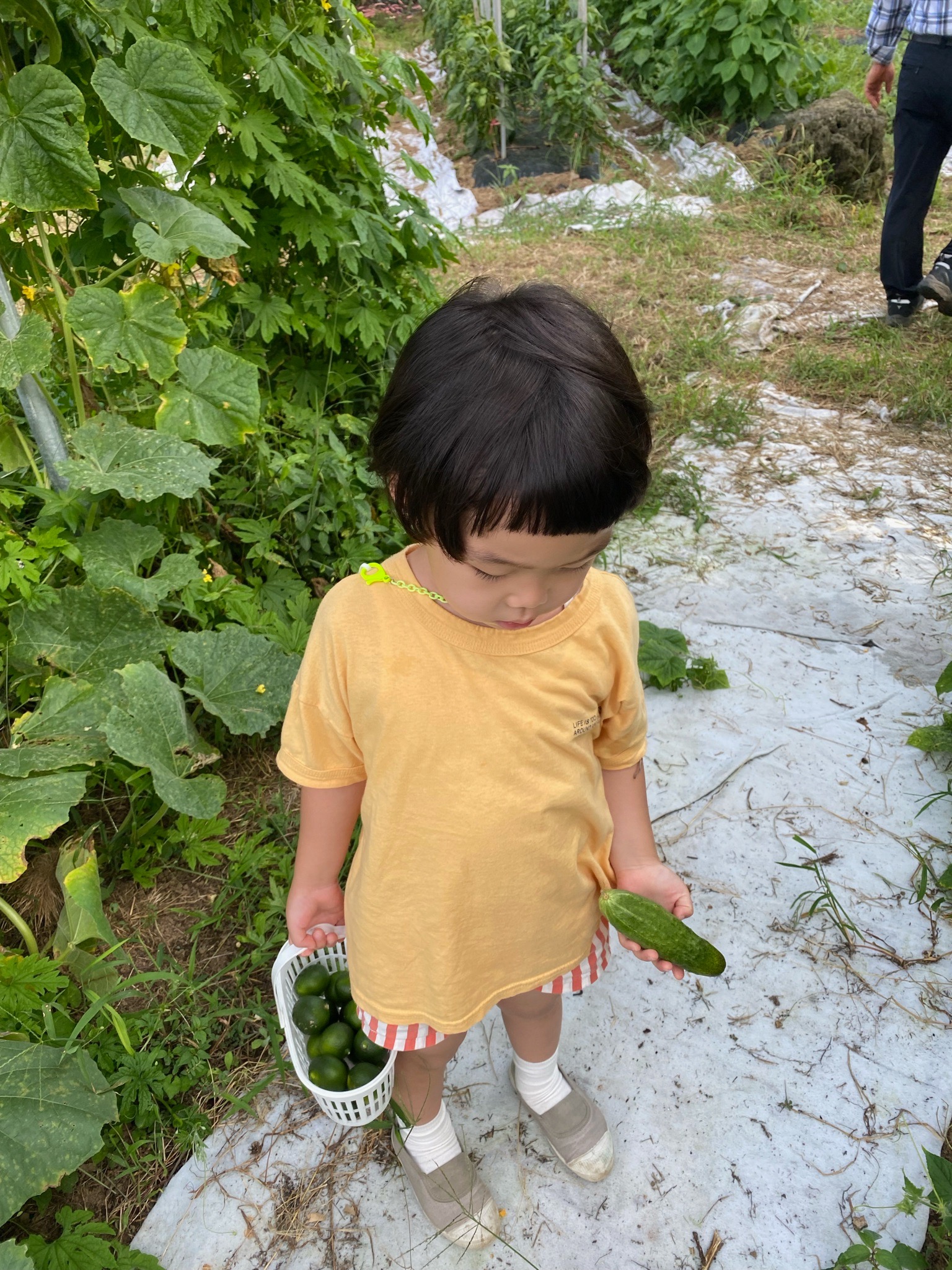 각각 소 바구니 하나씩과 가위를 주는데요, 한 바구니 가득이 1kg이고 청귤청 담을 땐 2/3 정도만 채우면 된다고 합니다. 저희들이 마지막 체험 손님이었는데 친절한 사장님께서 농장 텃밭에서 키우는 오이와 옥수수를 아들에게 선물로 주셨어요^^