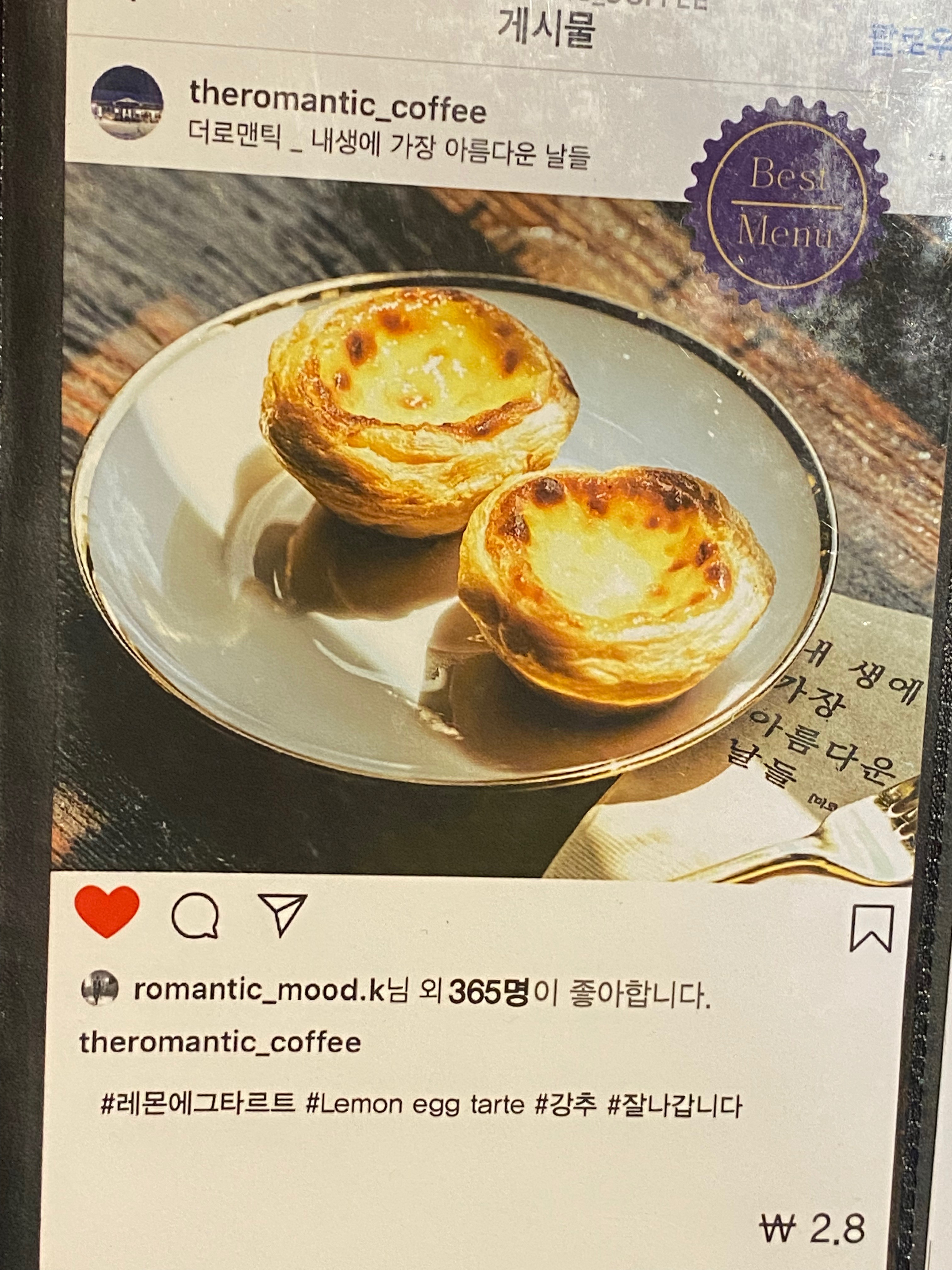 메뉴판을 보니 인스타 올려놓은 사진을 그대로 메뉴판으로 활용하고 계신데요, 베스트 메뉴인 에그타르트, 아인슈페너 커피, 쇼콜라라떼, 아들을 위한 유자에이드 요렇게 주문을 했습니다.