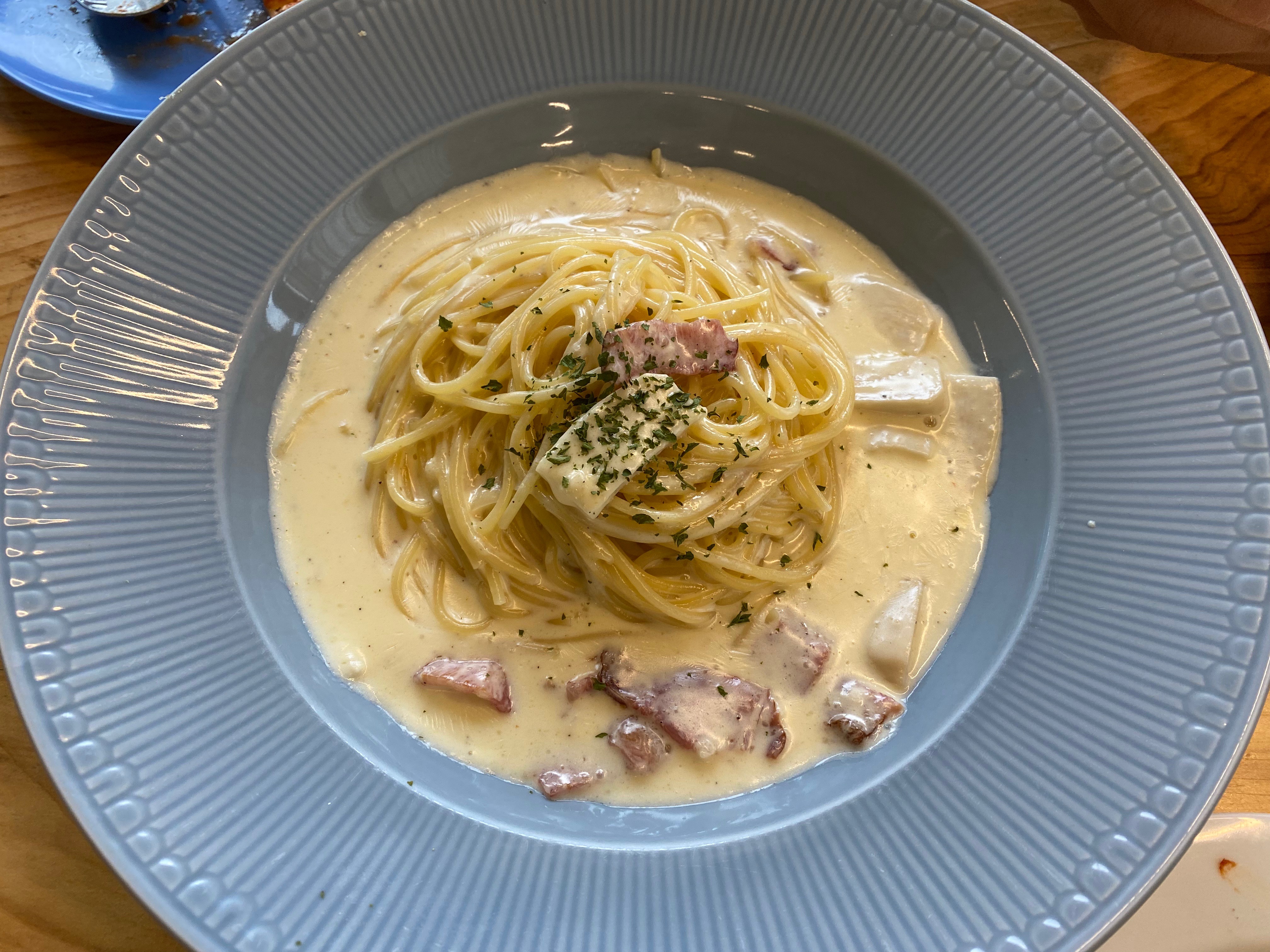 두 번째 무난한 맛으로 아들 먹으라고 시킨 까르보나라 파스타가 나왔습니다. 맛이 이때까지 맛본 까르보나라 파스타와는 좀 다릅니다. 이게 참 애매한 게 맛이 기본 베이스는 까르보나라인데 특이한 맛이 납니다. 어른들은 그닥인데 우쨌든 아들이 맛있다고 하니 입맛에 잘 맞는 모양입니다. 요건 진짜 어린이들을 위한 파스타입니다.