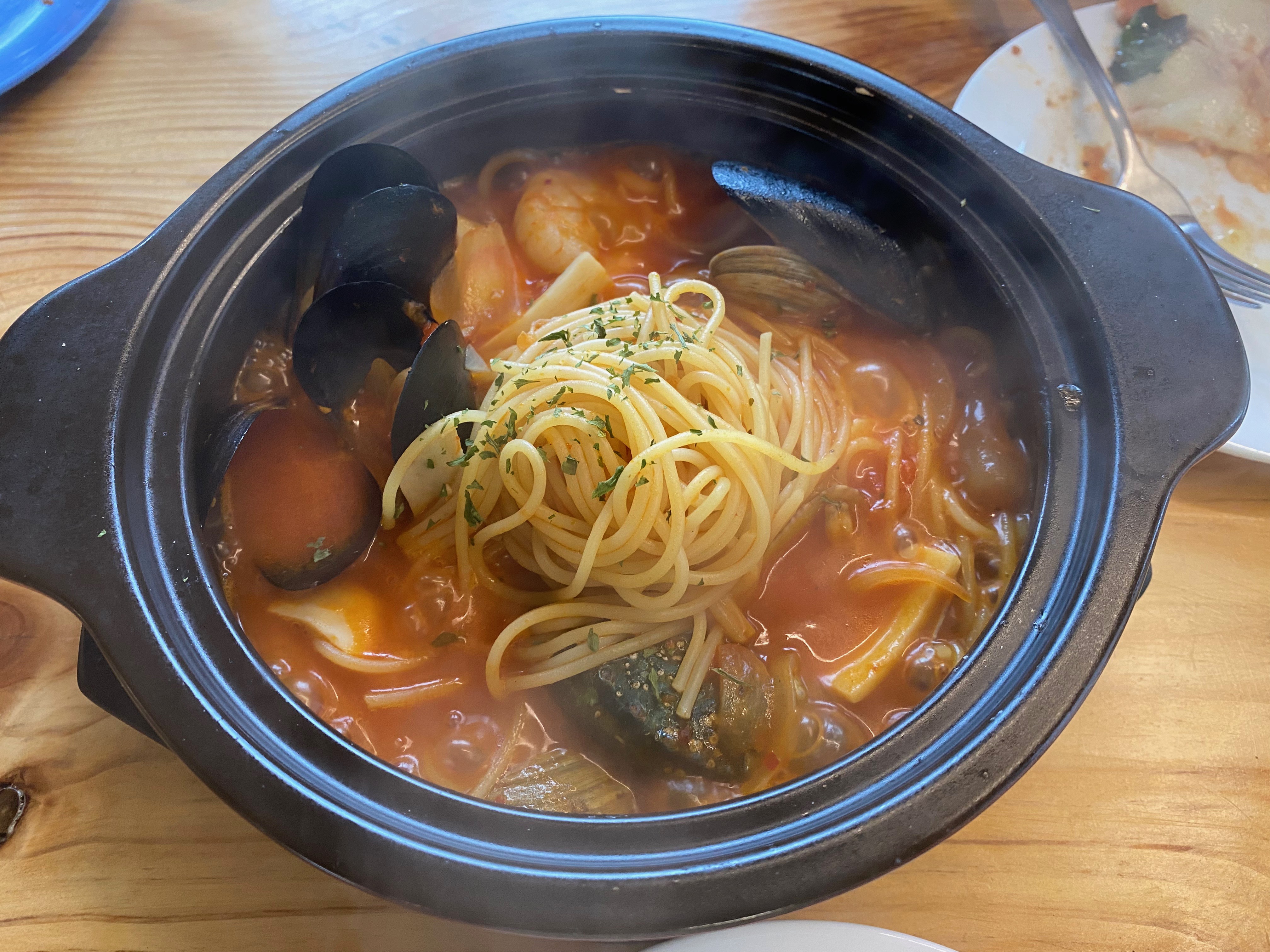 크게 기대를 안한 퓨전 파스타를 맛보는 순간 이집 무조건 포스팅 각이다~ 생각이 들었습니다. 마지막 여행 장소에서 즐기는 저녁 식사였는데 파스타 국물이 햐~~ 살짝 매콤하니 여행에서 쌓인 피로를 풀어주는 보신하는 듯한 느낌 또는 시원하게 속을 풀어주는 해장각 파스타였습니다. 해산물이 들어갔고 토마토소스가 베이스인데 마치 달콤 살짝 매운 짬뽕 국물을 마시는 듯한 느낌이랄까요? 넘넘 맛있어서 바닥까지 싹싹~ 긁어서 국물 한 스푼까지 ~~^^ 뚝배기 그릇이랄까요? 암튼 열이 오랜 시간 지속되는 그릇에 담겨 있어서 더 맛있었던 거 같습니다. 세화 해수욕장에 물놀이 즐기러 오시는 분들께 초초초강추 해드릴 수 있는 OZZO 퓨전 파스타입니다.
