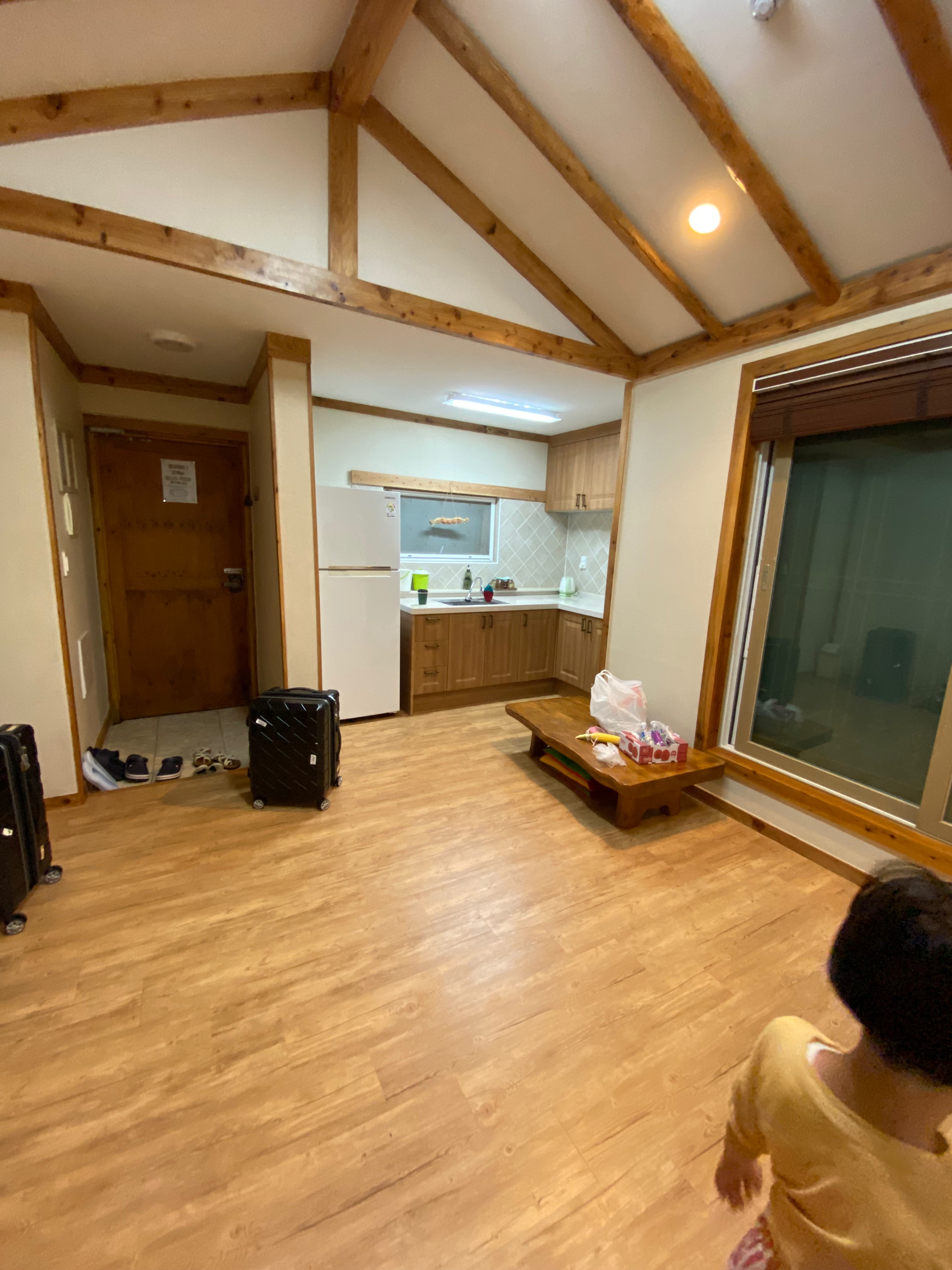 숙소는 두 가지 타입이 있는데 5인 가족 이상 사용이 가능한 넓은 숙소와 저희 같이 세 식구 소규모 가족이 사용하는 숙소가 있습니다. 기본 투룸 형태로 거실&부엌과 안방, 화장실이 갖춰져 있습니다.