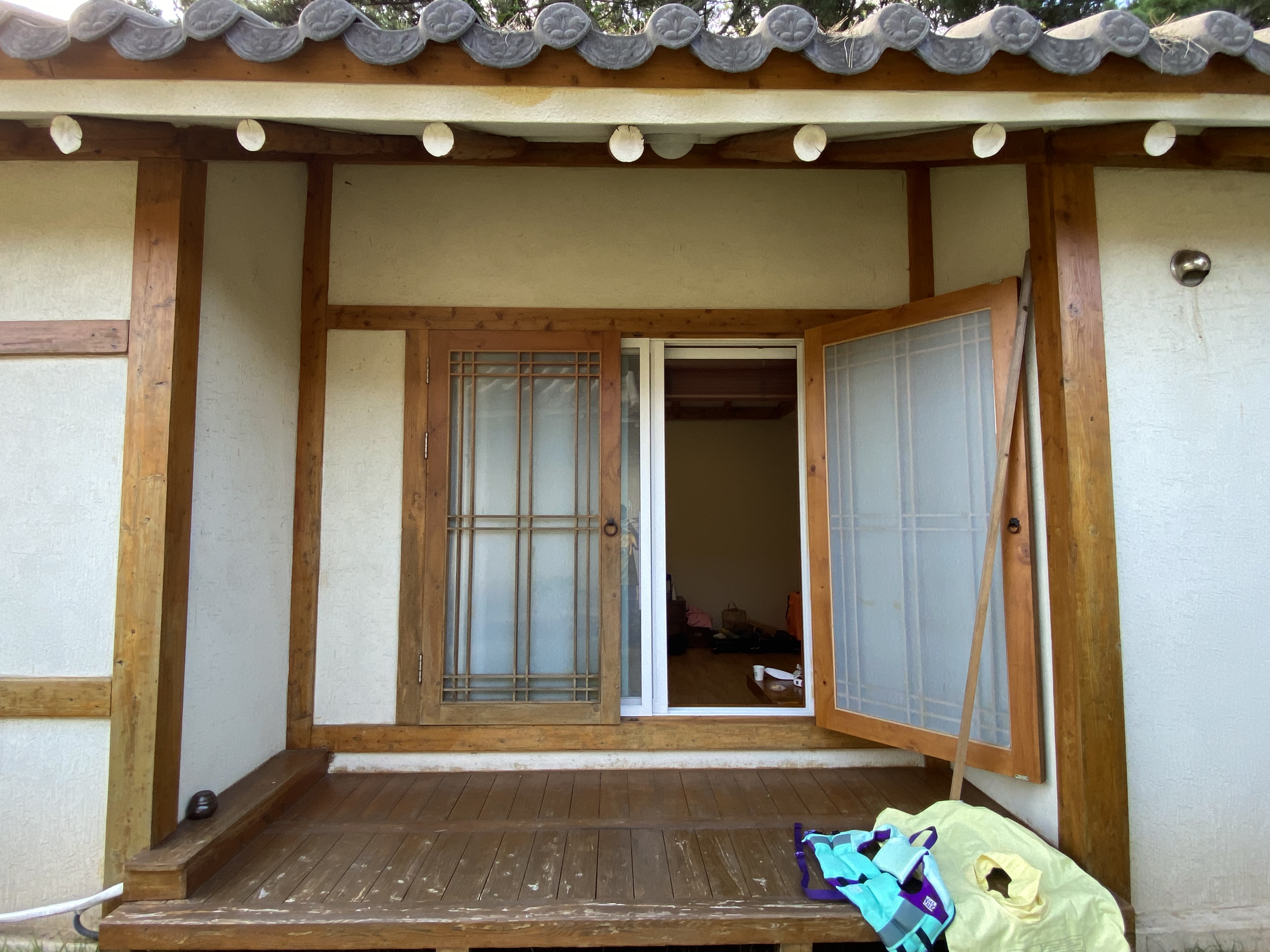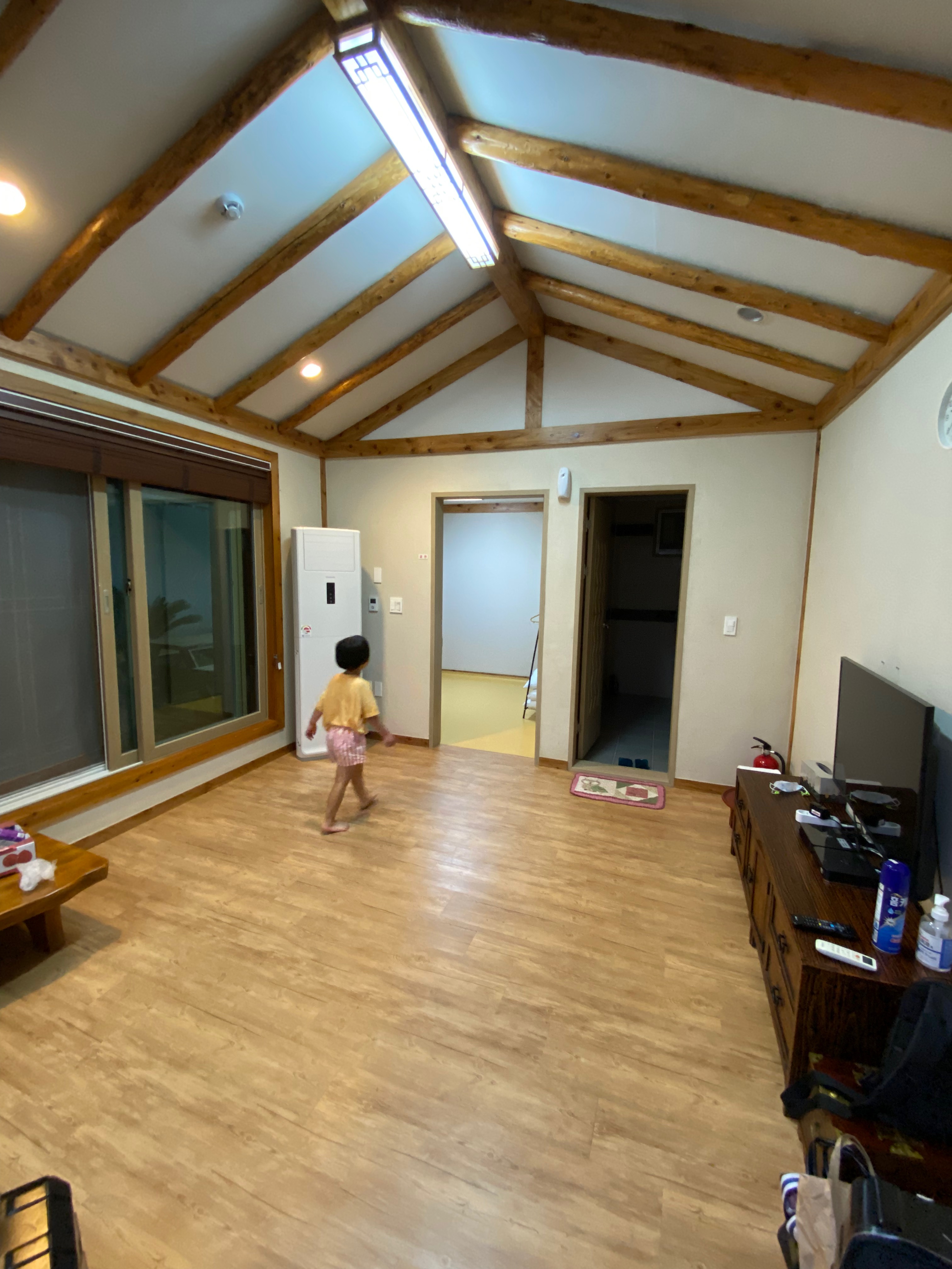 거실이 넓고 좋습니다. 한옥 스타일인데 거실 통창으로 이어지는 마루도 있고 참 정감이 갑니다. 안방은 아쉽게도 에어컨이 없어서 아들과 아빠는 이틀 동안 거실에서 ~ 엄마는 방에서 취침을~^^