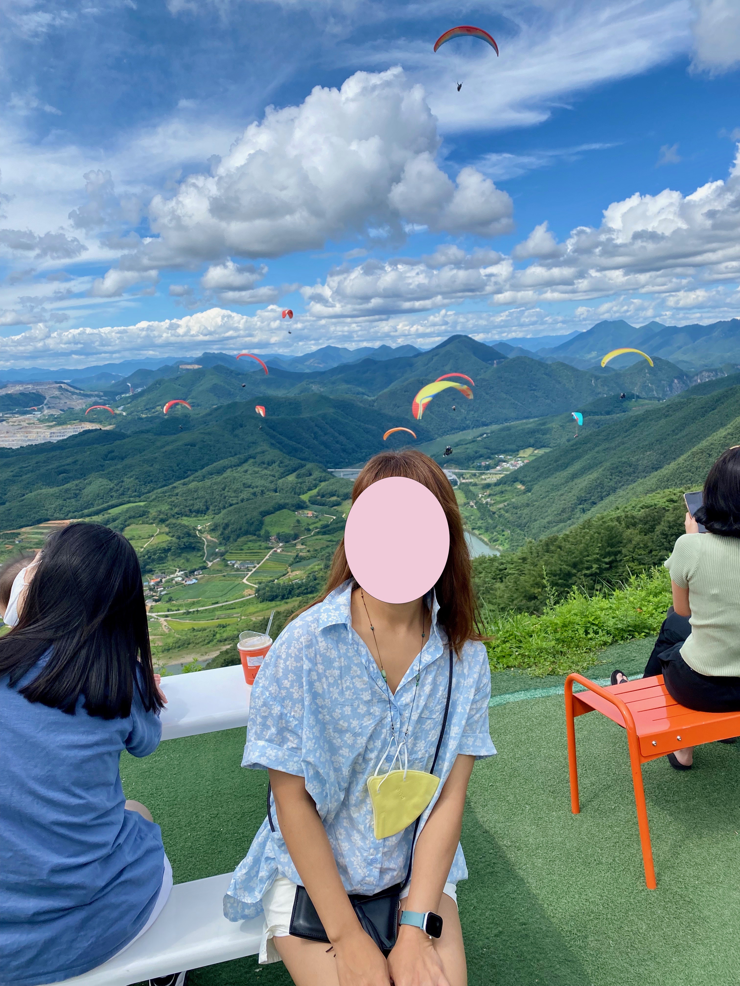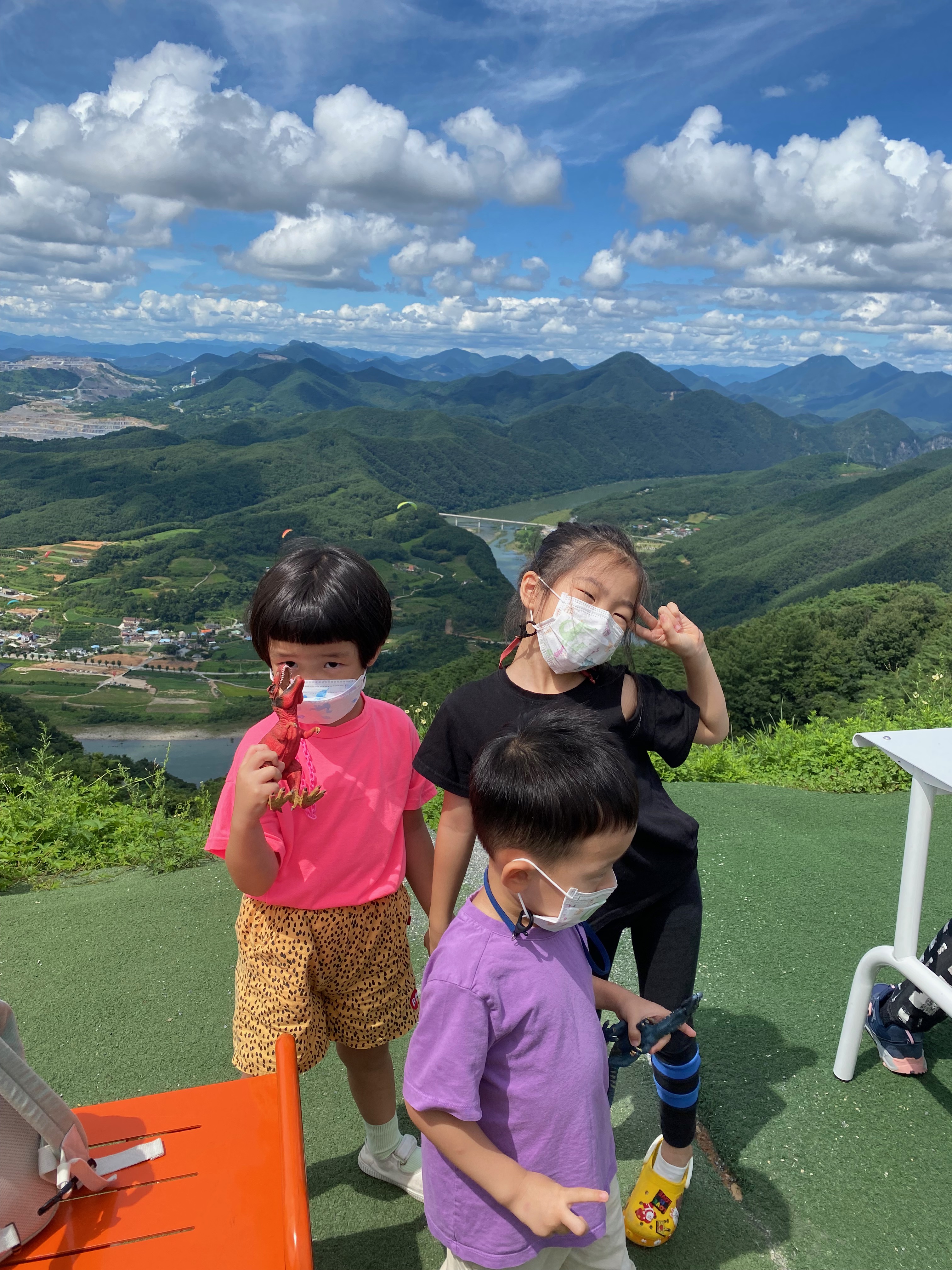 멋진 뷰를 남기기 위해 빠른 자리 선점이 중요한데요, 적당히 사진 찍고 다음 사람을 위해 비켜주는 것도 센스~! 그러나 테이블이 있는 좌석은 포기하면 안 됩니다. 느긋하게 커피 한 잔 즐겨야겠지요? 아이들은 사진 한 장 서비스로 찍어주시고 어른들은 그 뒤로도 한참을 탁 트인 단양 뷰를 즐기며 패러글라이딩을 배경 삼아 열심히 사진을 찍었답니닼ㅋㅋ 여기 카페산은 커피 가격이 비싸다고, 커피 맛이 별로라고 불평하면 안 되는 곳입니다. 그만큼 뷰가 모든 걸 용서해 주는 곳이죠. 시간도 야외에서 그냥 커피만 마셨을 뿐인데 한 시간 금방 가더군요. 단양의 매력에 흠뻑 빠지는 시간이었습니다. 봄, 가을로 나들이 오면 좋겠다는 생각이~~ 단양여행하실 분들 커피 한 잔이 땡긴다면 무조건 '카페산' 강추합니다!!!