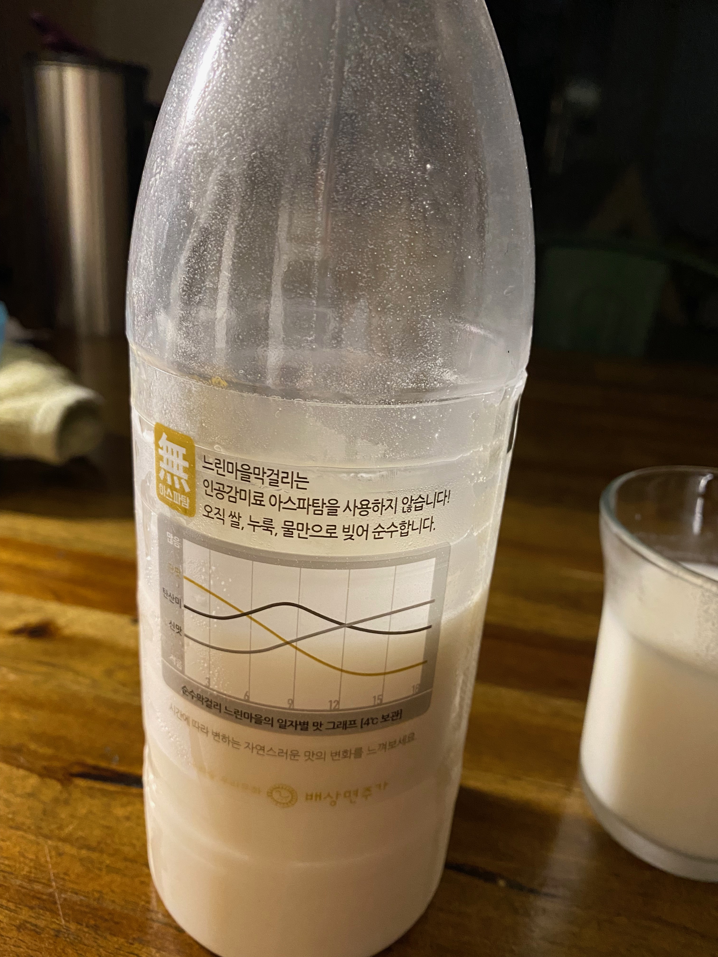 느린마을 막걸리는 인공감미료를 사용하지 않는다고 되어 있는데요, 시중에 파는 막걸리들은 대부분 인공감미료인 아스파탐을 사용하고 있는 거 아시죠? 특별히 오래된 전통이 있는 막걸리는 특유의 독특한 맛이 있는데 시중에 파는 막걸리는 인공감미료 때문에 엇비슷한 맛이 거의 거기서 거긴 맛이 납니다. 적어도 제 입에는 말이죠. 그런데 느린마을 막걸리는 맛을 보는 순간 억지로 단맛을 낸 그런 맛이 아닌 진짜 순한 막걸리 맛이 납니다. 막걸리 특유의 탄산도 거의 없고 기존 막걸리 맛을 좋아하는 분들이라면 이게 뭐꼬~ 닝닝한 게 암맛도 안 나네~ 하실 거 같다는 생각도 드는데요, 한 병 가지고 와이프님과 나눠마시는데 순하디순한 맛입니다. 담백하고~ 덜 달고~ 덜 톡 쏘고~ 두병까지 마셔봤는데 담날 숙취는 당연히 없었죠. 부어라 마셔야 하는데~ ㅋㅋ