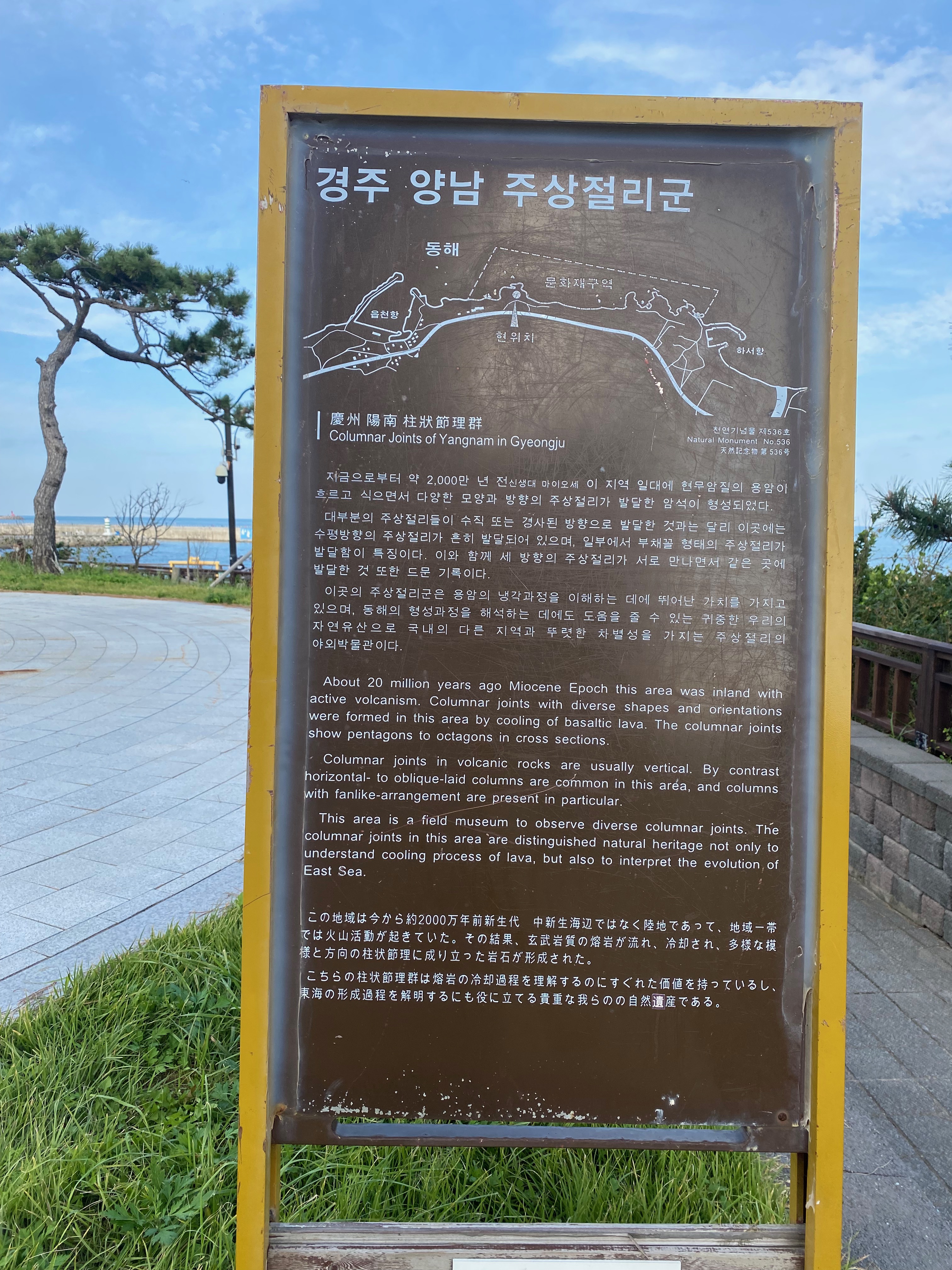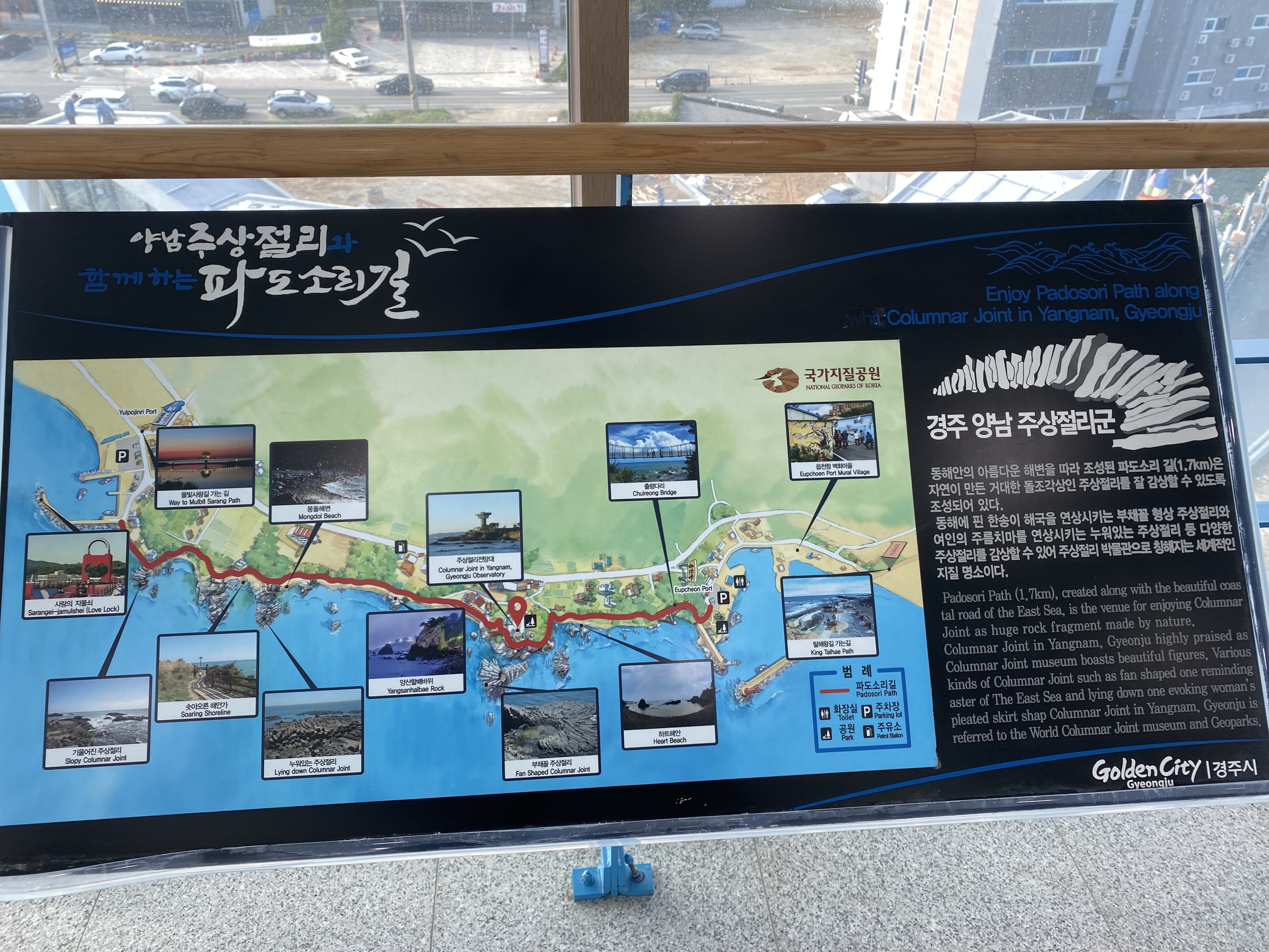 여기가 몰랐는데 지질 국립공원으로 되어 있는 곳이더군요. 긴 해안을 따라 다양한 모양의 주상절리를 즐길 수 있었는데 6살 아들과는 절대 불가능한 걸 알기에 전망대를 중심으로 우측 해안 길을 따라 읍천항까지 가보기로 했습니다. 파도소리길 사진을 보시면 중앙에 전망대가 위치해 있고 우측에 읍천항이 있습니다.