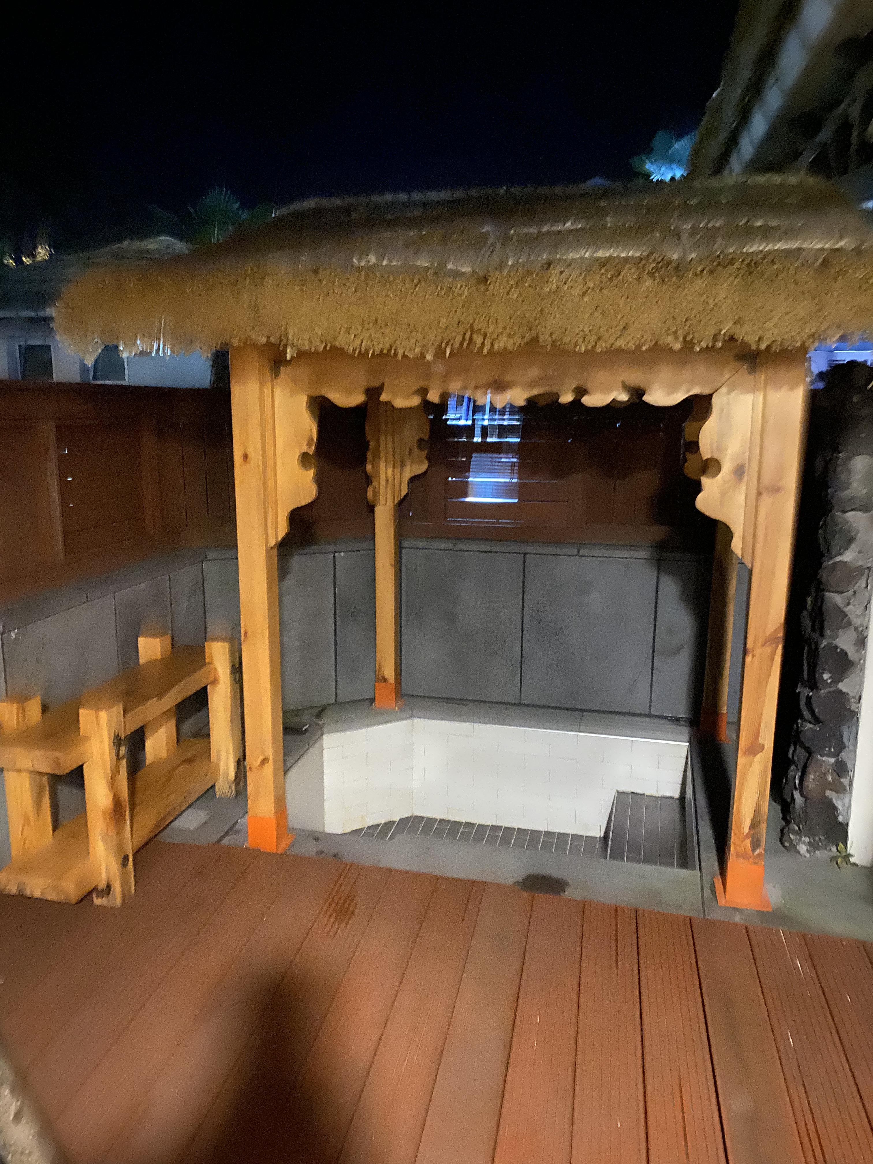 숙소가 매우 특이한데 외관은 그냥 딱 봐도 일반 가정집 같습니다. 문을 열고 들어가면 외부에 월풀 욕조가 딱(마치 히노끼 탕 같은)!!!