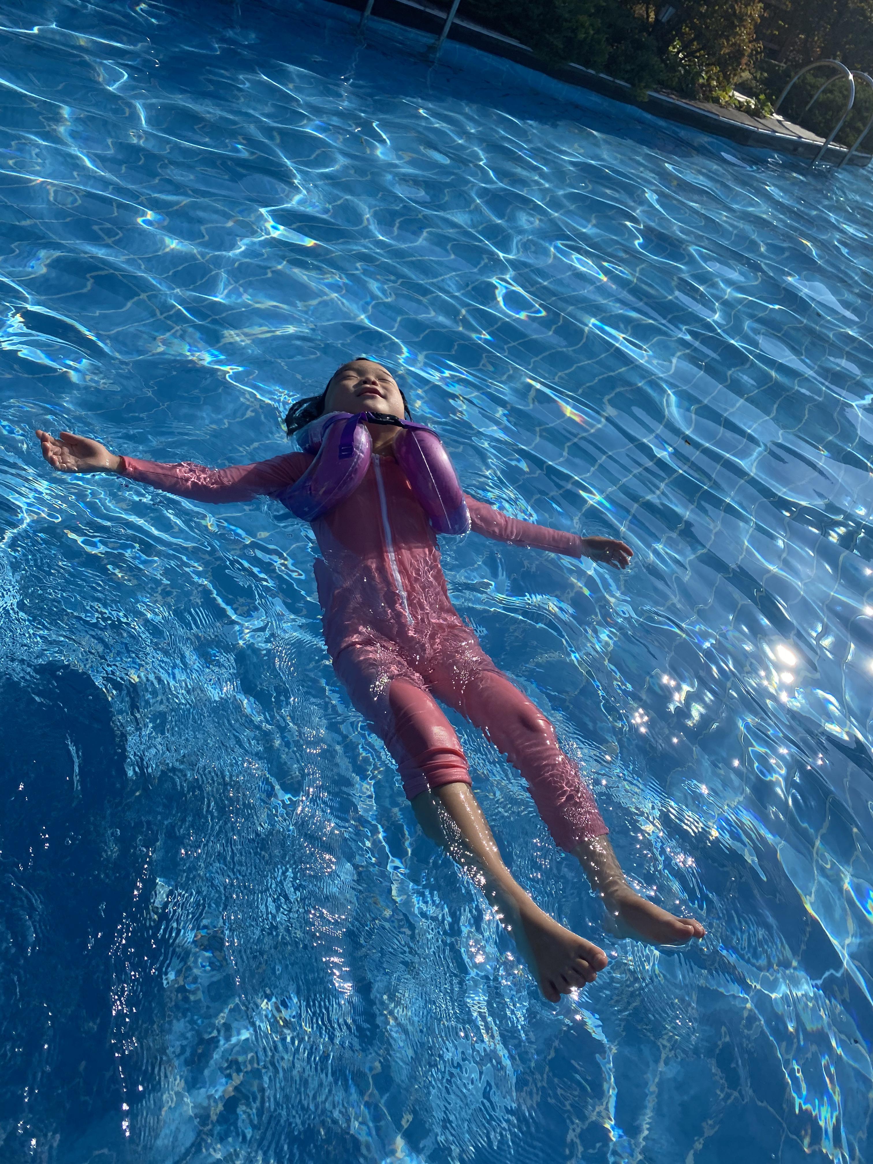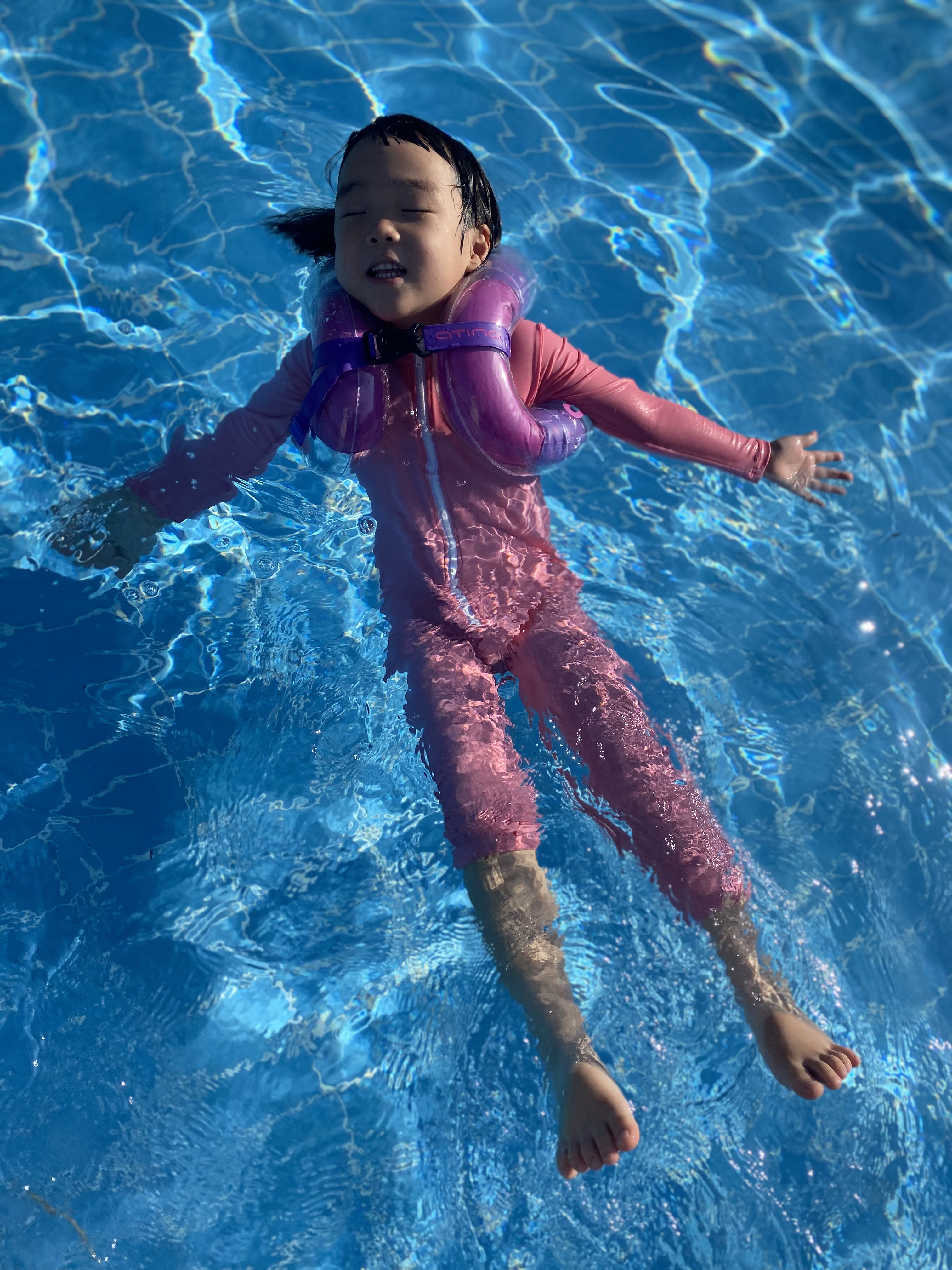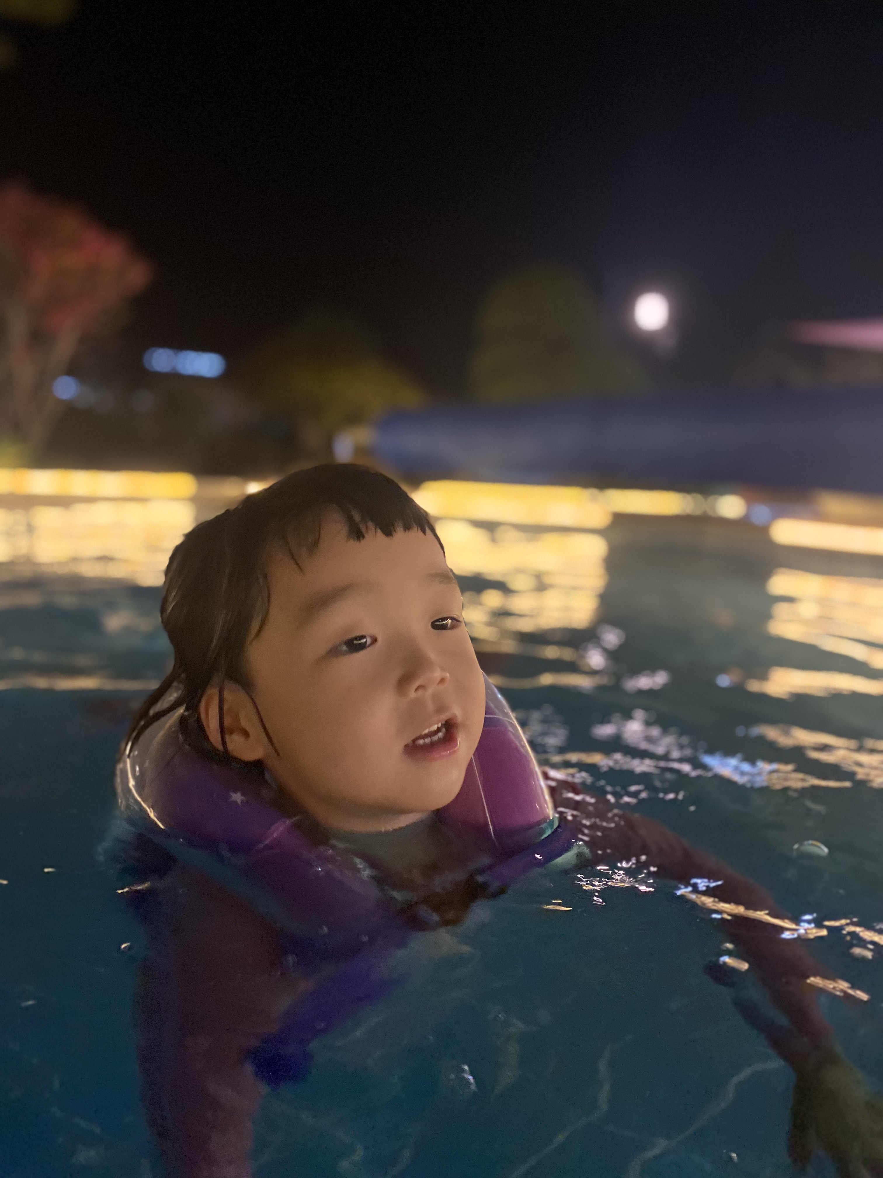밤에 짐 풀고 바로 뛰어든 녀석인데 아침에 눈뜨자마자 또 수영장 타령에 부랴부랴 뛰어들었더니 배영 스킬을 습득해 버렸네요^^