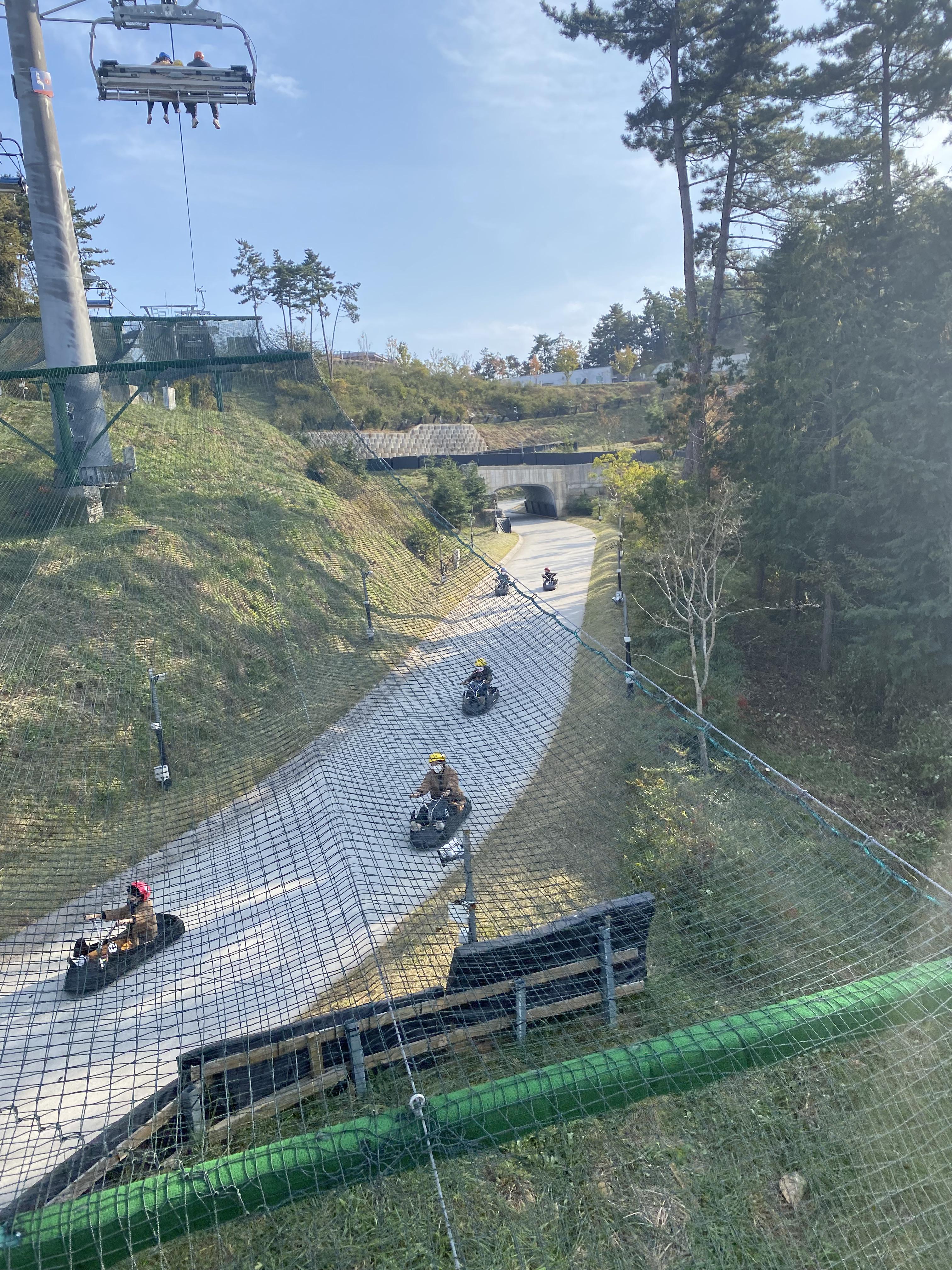 스키장 슬로프처럼 루지를 타기 위해선 슬로프를 이용하는데요 올라가는 길에 루지를 즐기는 사람들의 모습을 한 컷 담아봤습니다.