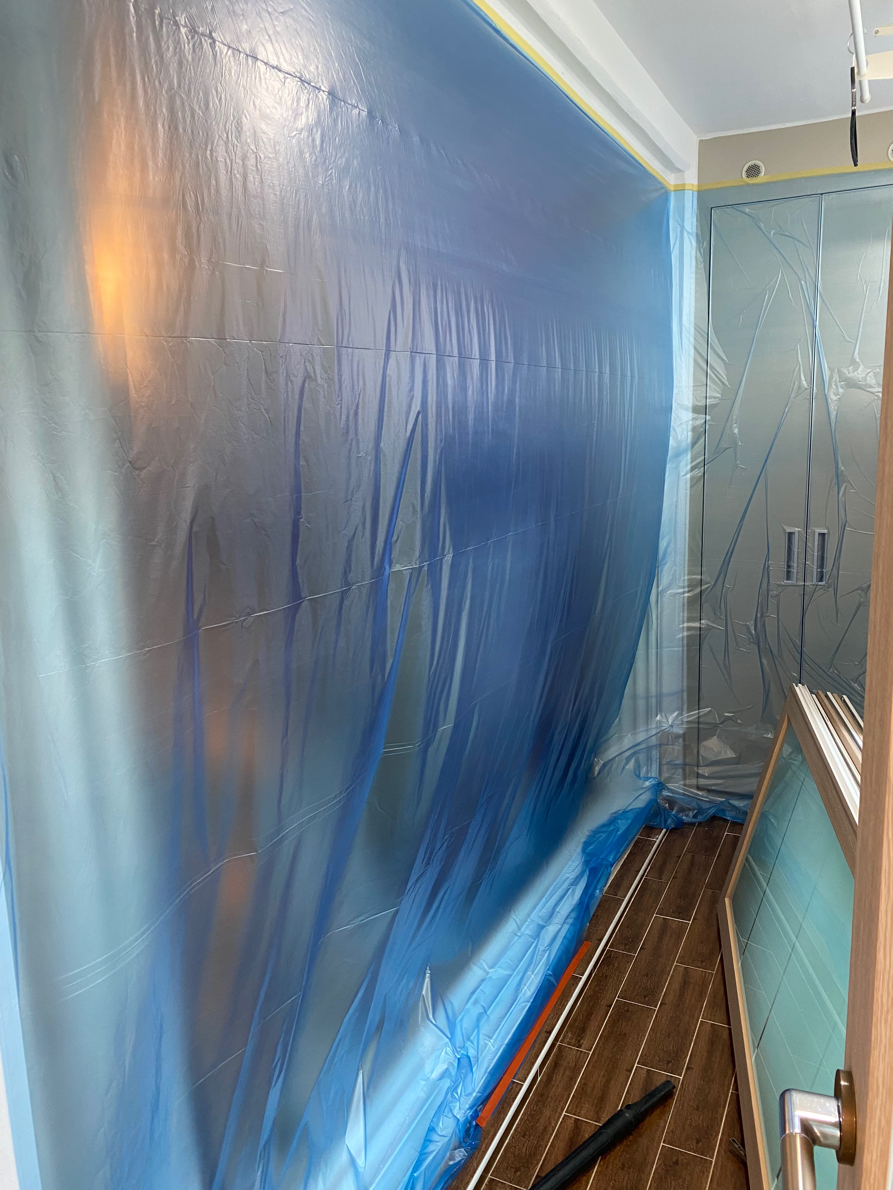 다 들어낸 섀시 외관을 비닐로 싹 카바 쳐줍니다. 교체 작업 시 안방으로 먼지가 들어가지 않기 위해서 말이죠. 센스 짱!!!