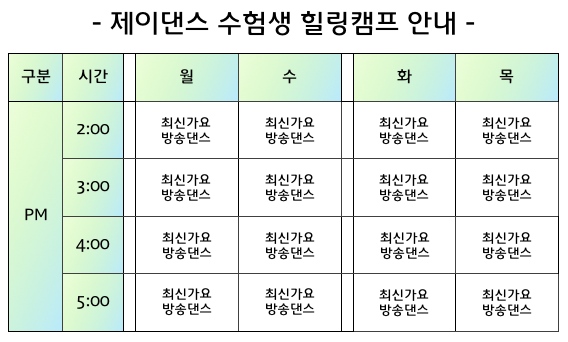 제이댄스 학원에서 수험생들 맞춤 수업을 준비하고 있습니다. 그동안 수능 준비하느라 쌓인 스트레스와 떨어진 체력을 하루빨리 보강해야 하는데 말이죠~ 즐겁게 K-POP 커버댄스를 배우다 보면 스트레스는 풀리고 체력은 업 되는 걸 느낄 수 있답니다. 거기다 수험생 할인은 덤으로다가~~^^ 해당 할인 이벤트는 수험생 전용 반에만 적용되니 양해 바랍니다. 논술 시험을 준비하는 학생들이 많던데 미리미리 댄스 스케줄 잘 체크해서 적극 참여해 주시기 바랍니다!!!