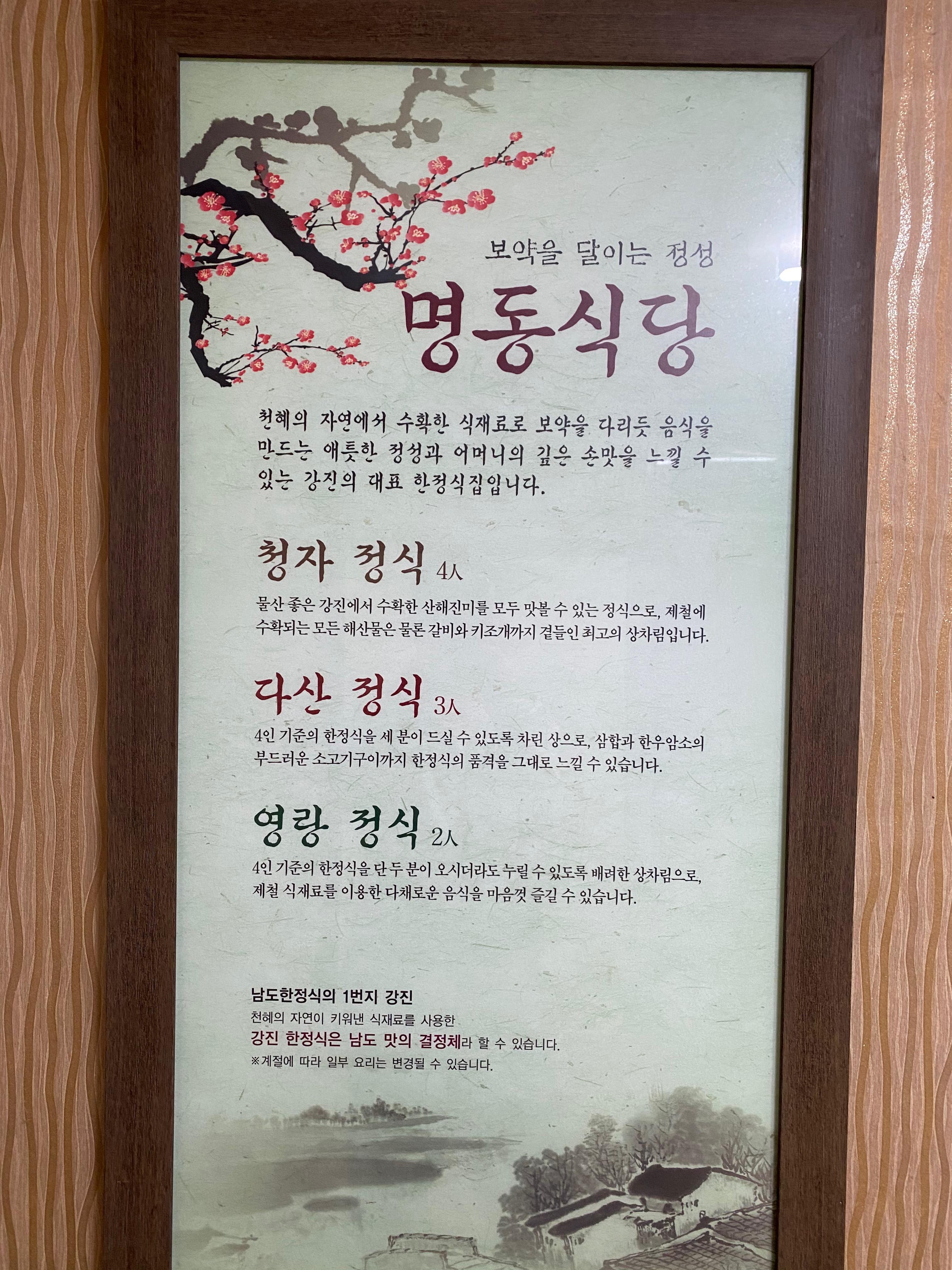 진도 여행 마지막 날의 진수성찬 맛보기 끝판왕 식당을 소개해 드릴까 합니다. 3박 4일간의 강진&진도 여행 중 그 마지막 날 드디어 집으로 돌아가는 길에 강진의 유명한 한정식집 명동식당을 들리게 되었습니다. 지난 2박 3일간 일일 한 끼 외식으로 들렀던 식당은 여전히 저희 부부에겐 남도음식의 갈증이 해결되지 못한 그런 찝찝함을 남겨줬었는데요, 명동식당의 여러 블로그 후기들을 읽어보면 그 기대는 충분히 하고도 남음이 됩니다.