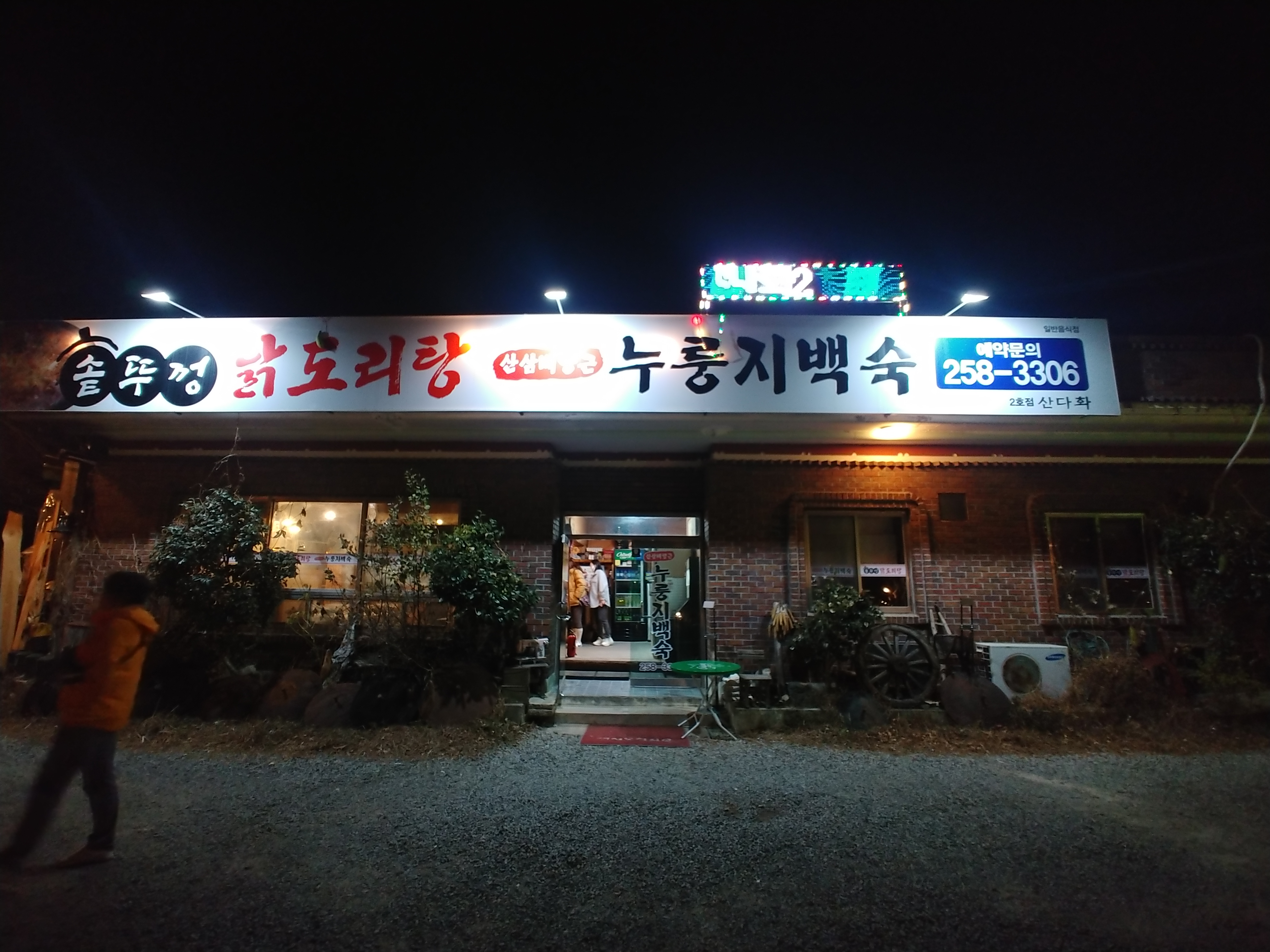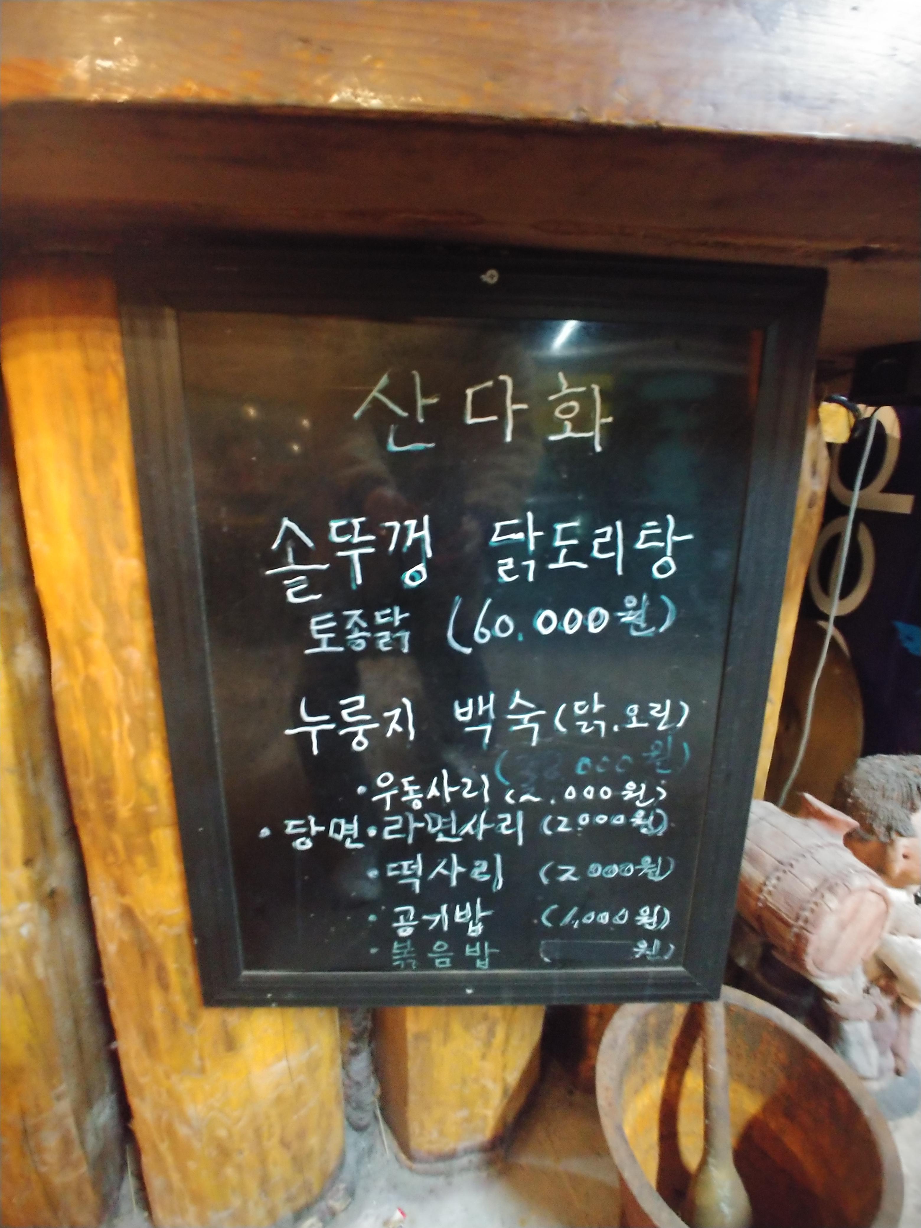 밀양이 일교차가 큰 동네라고 한천 박물관 설명을 들었는데 진짜 해 떨어지기 무섭게 산기슭에서 싸늘한 공기가 무지막지하게 살을 파고들더군요. 날은 저물고 날씨는 춥고 6살 아이들이 먹을 음식은 찾기가 힘들고 부랴부랴 어딜 갈까 찾다가 '산다화'라는 솥뚜껑 닭도리탕 전문점을 알게 되었습니다. 밀양서 작천정까지 30분 정도 가야 하는데 일단 급한 마음에 출발하고 봤지요.
