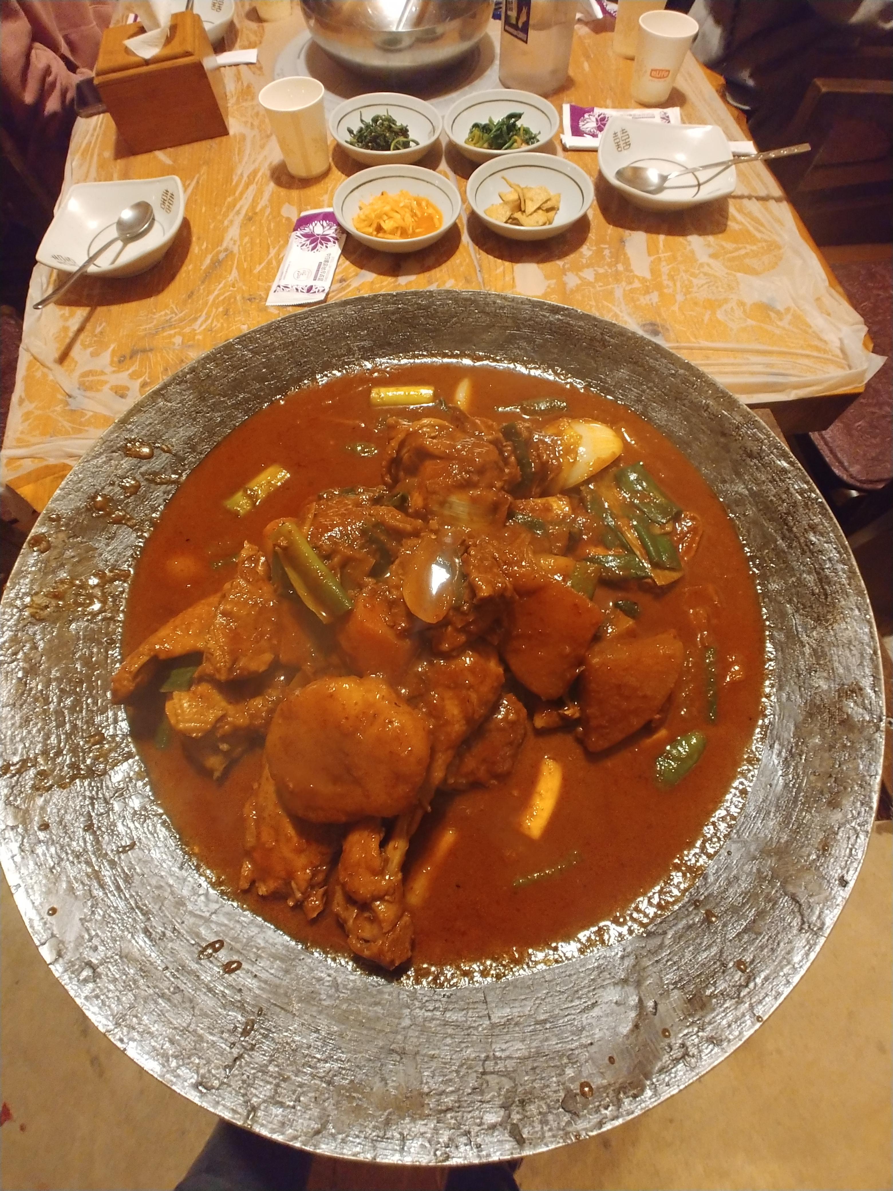 아이들 먹기 좋으라고 누룽지 닭백숙 메뉴를 보고 왔건만... 주말엔 오직 단일 요리로 솥뚜껑 닭도리탕만 가능하다는....