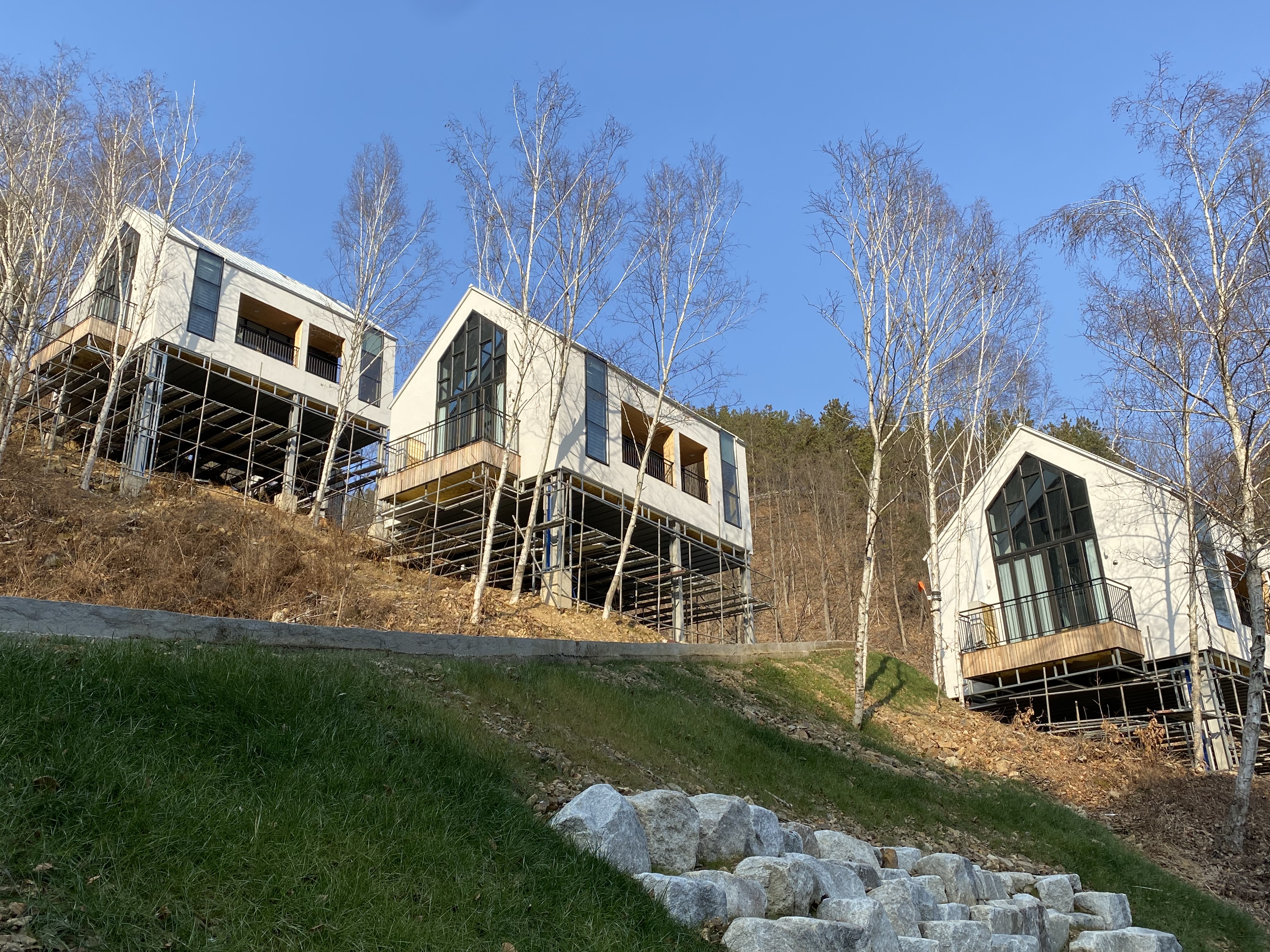 향로산 자연휴양림은 숙소마다 테마가 있는듯했습니다. 아래 좌측은 숲속집과 쌍벽을 이루는 인기의 동굴집입니다. 우측은 새로 지어지고 있는 집인데 창이 널찍해서 외풍 걱정이 살짝 되나 그래도 저긴 다음 여행 때 무조건 픽 해놓은 숙소가 되겠습니다.