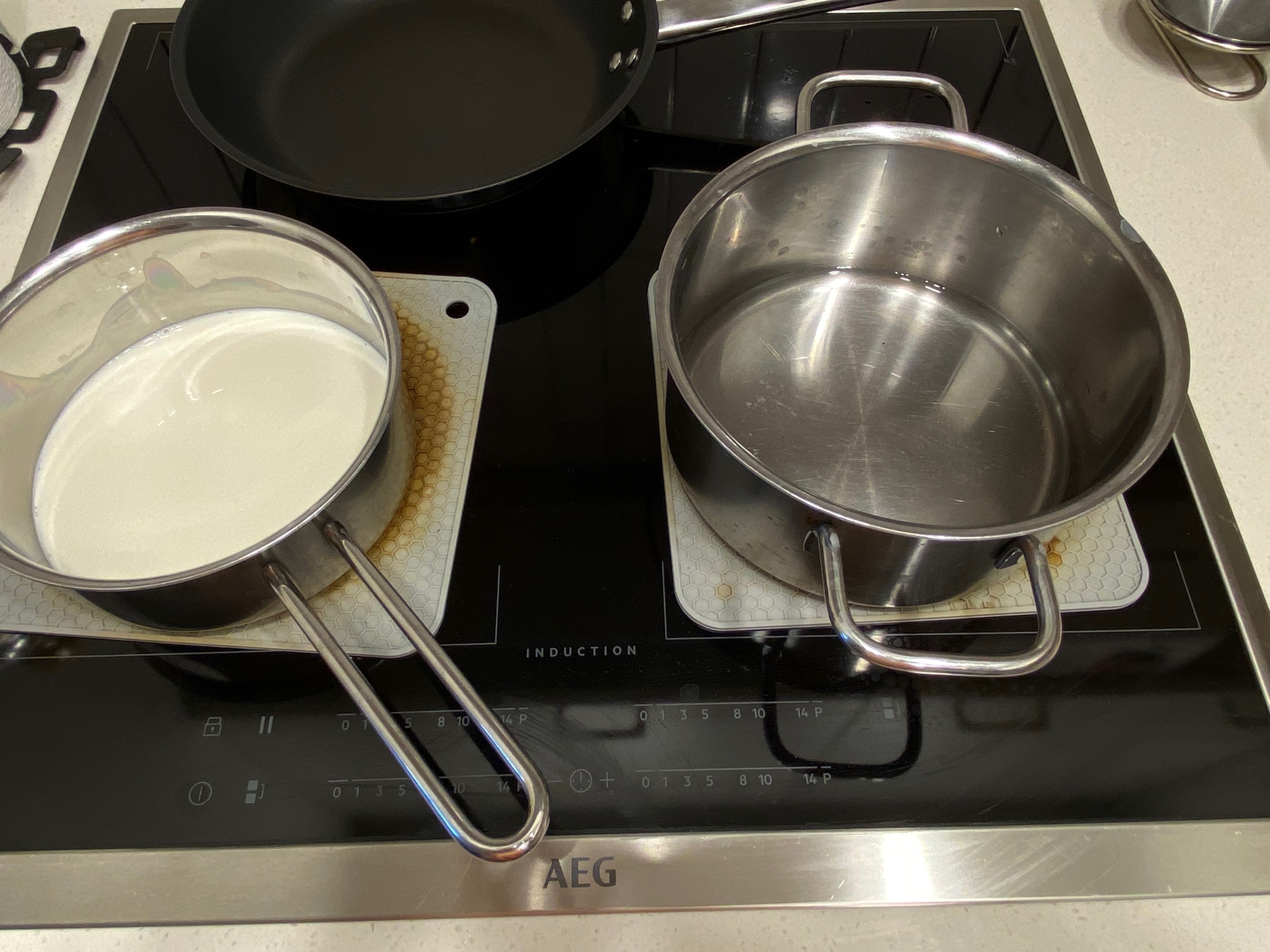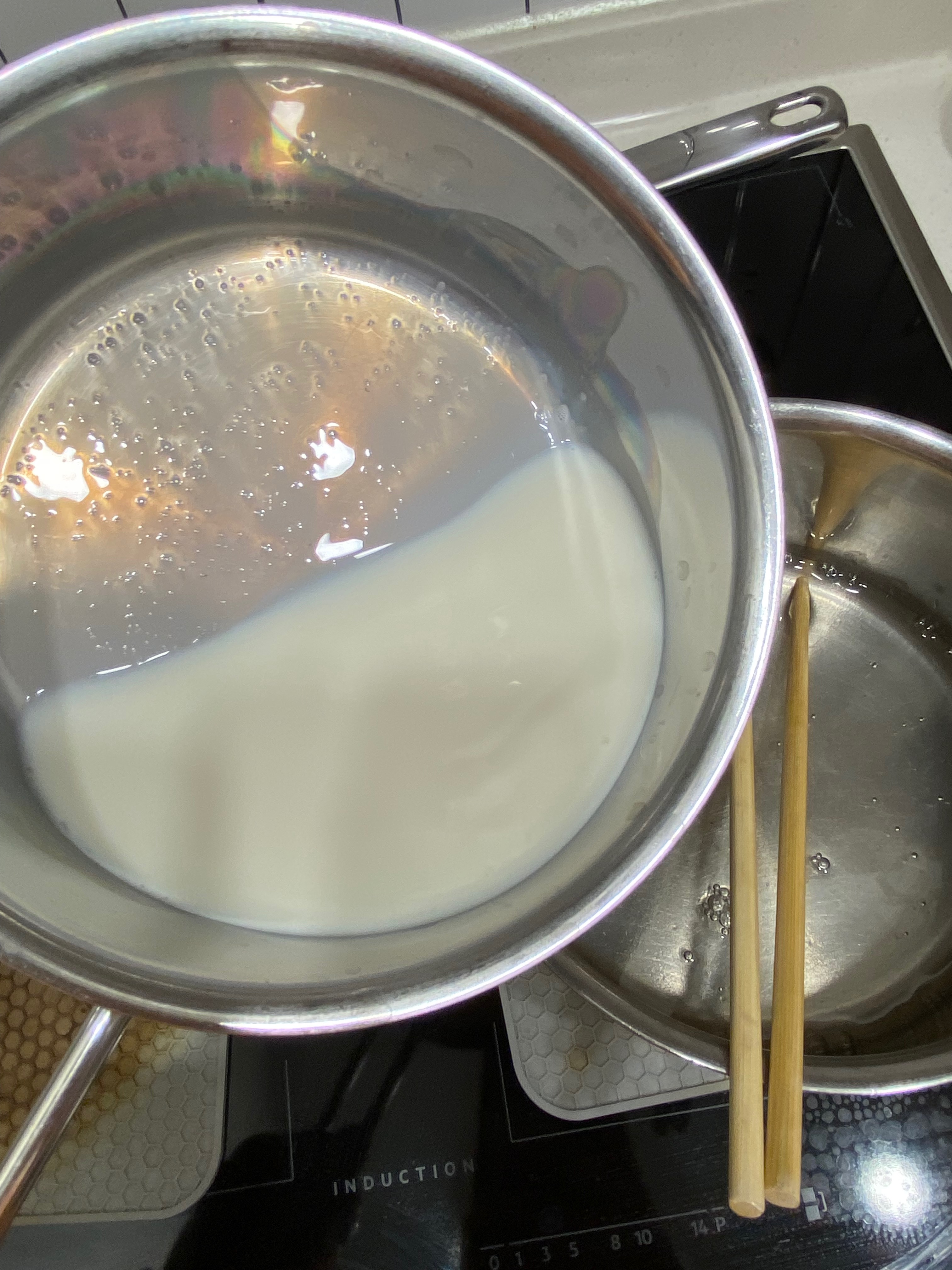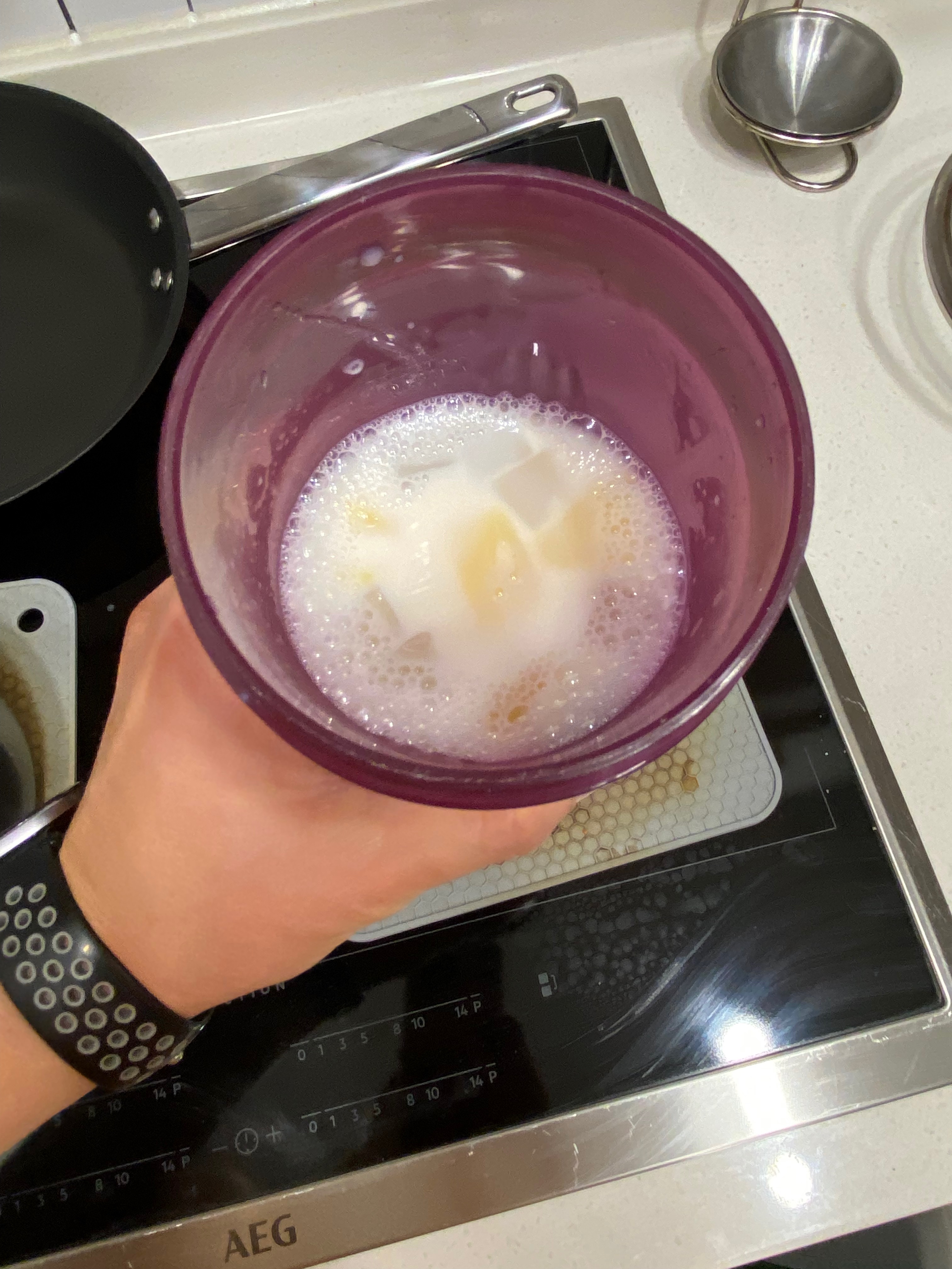 다 녹았으면 따듯한 우유를 믹스 용액에 섞어줍니다. 그러고 나서 거품 안 나게 잘 저어주고요~