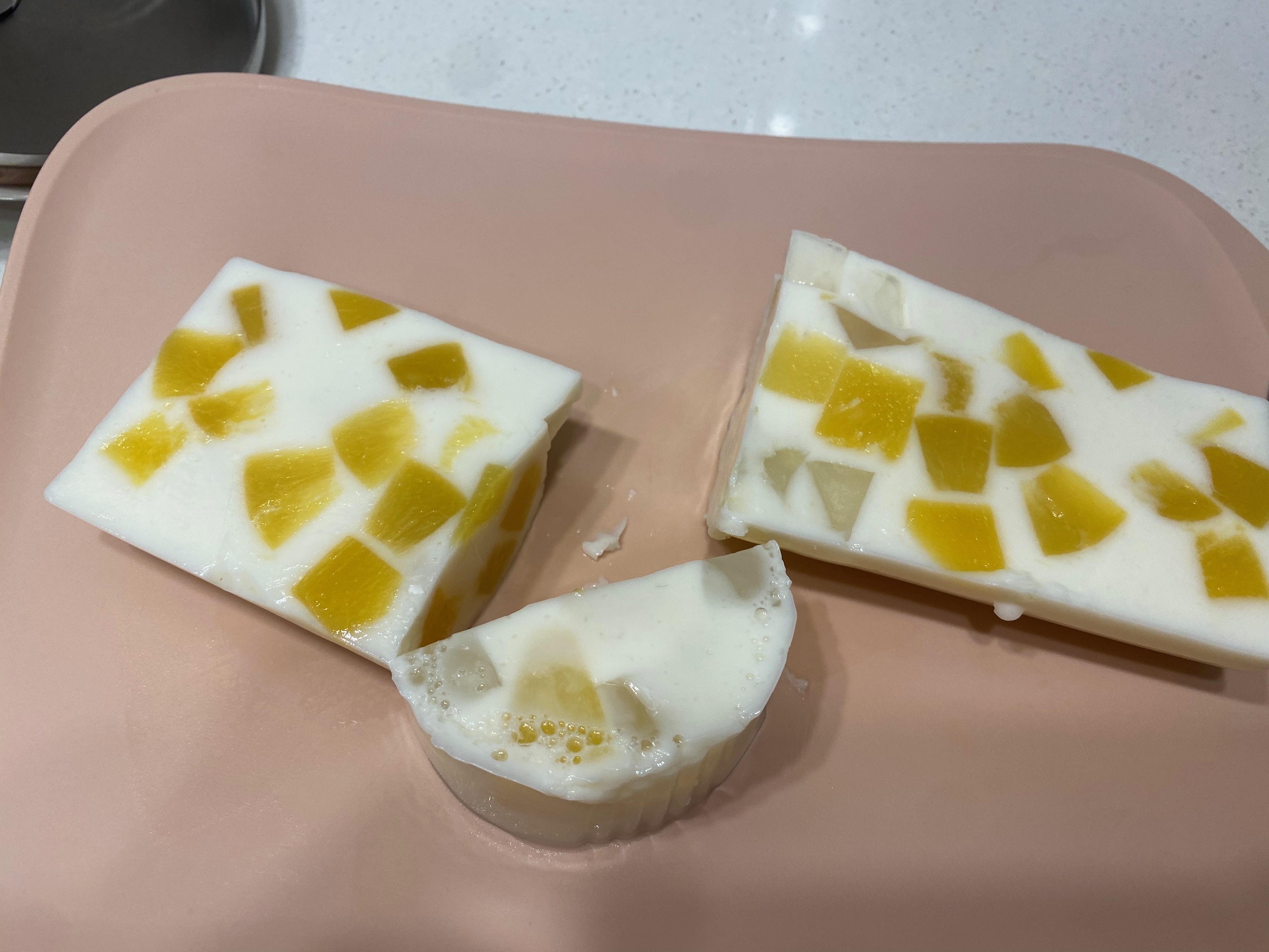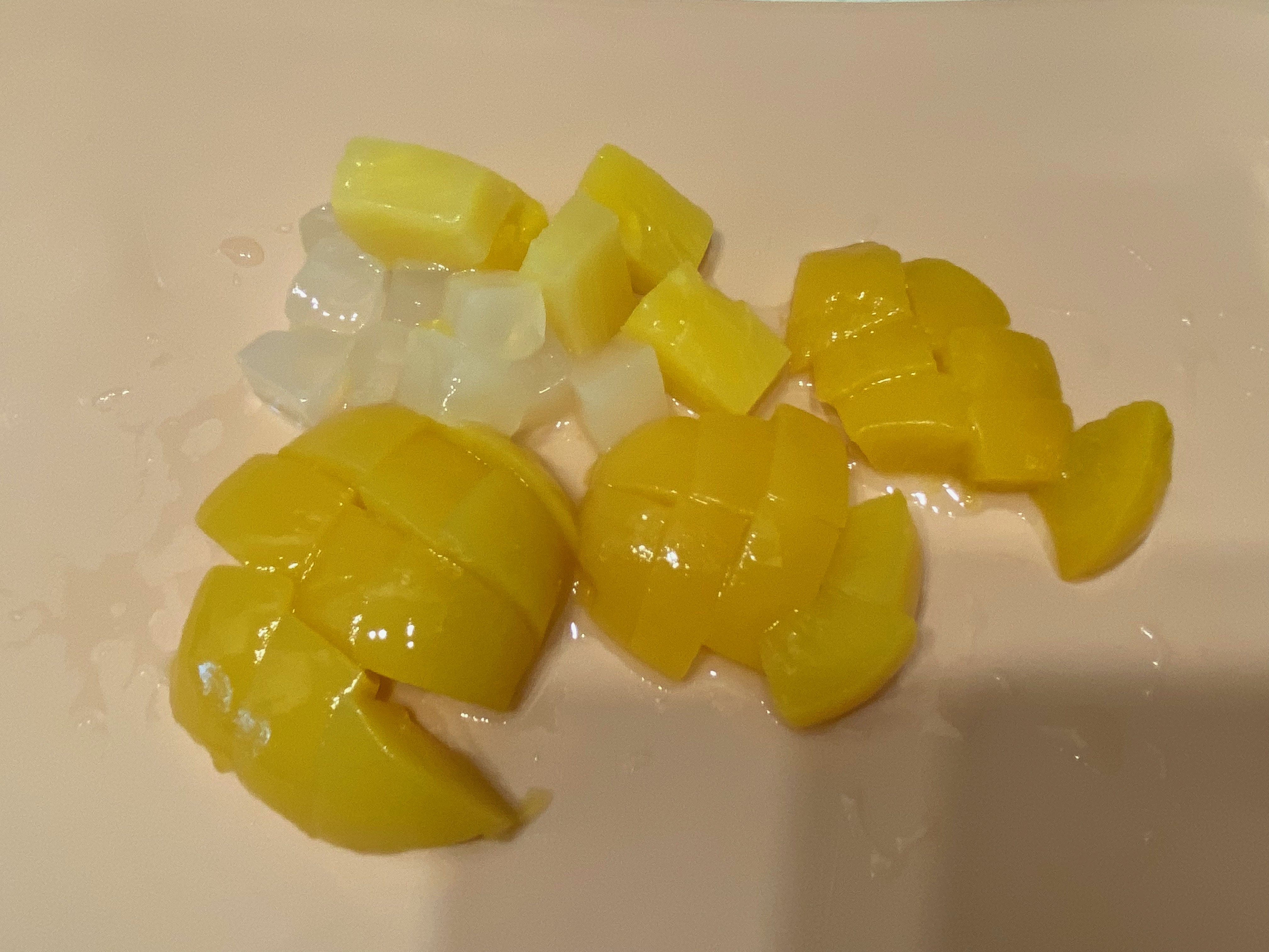 통조림을 까서 적당량 크기로 미리 손질을 해뒀고요, 너무 잘게 썰어두진 마세요. 막상 해보니 과일은 좀 큼직한 게 좋더군요. 후르츠 믹스 제품을 사용해 보니 푸딩을 자를 때 잘 부서집니다.
