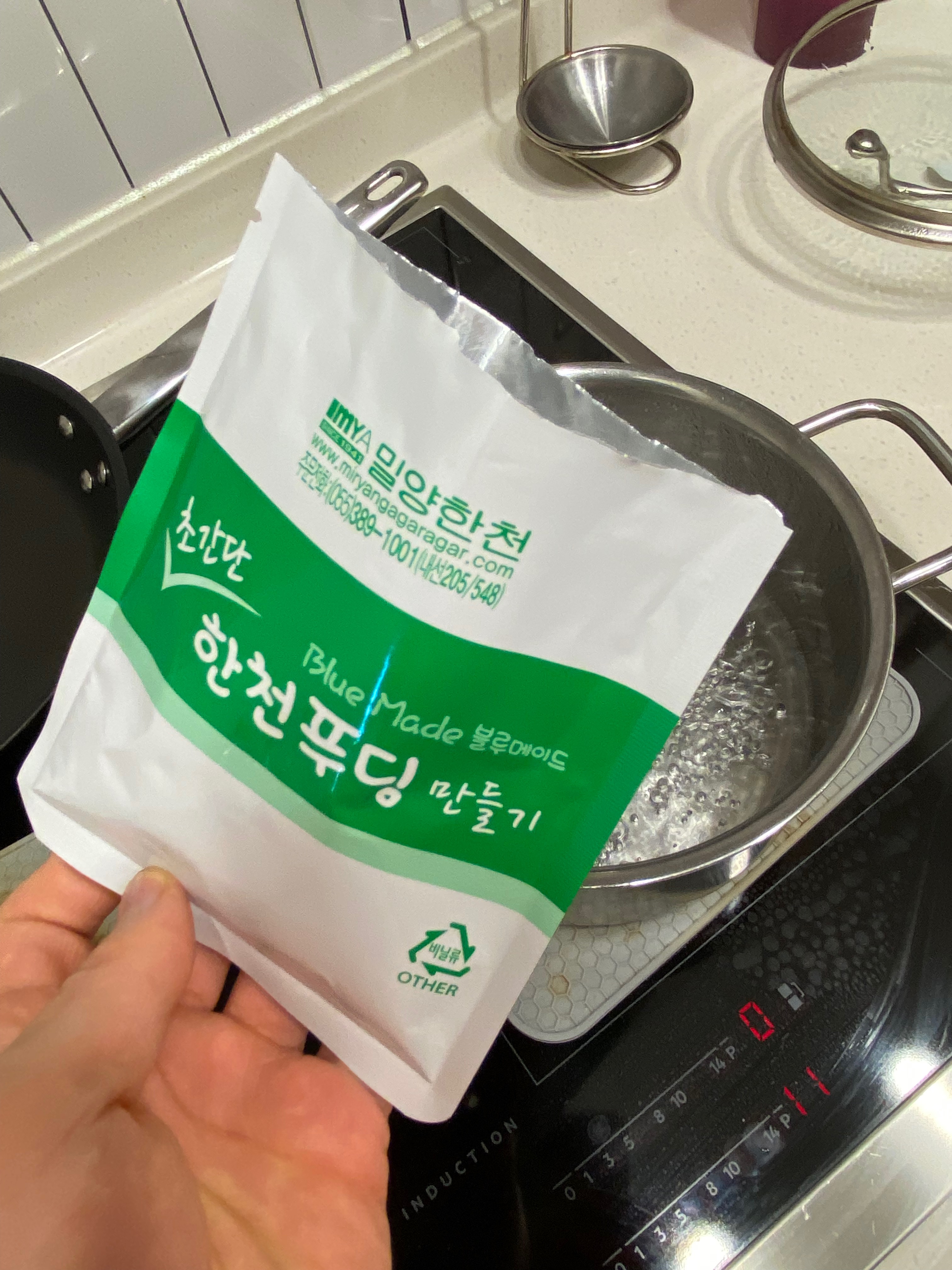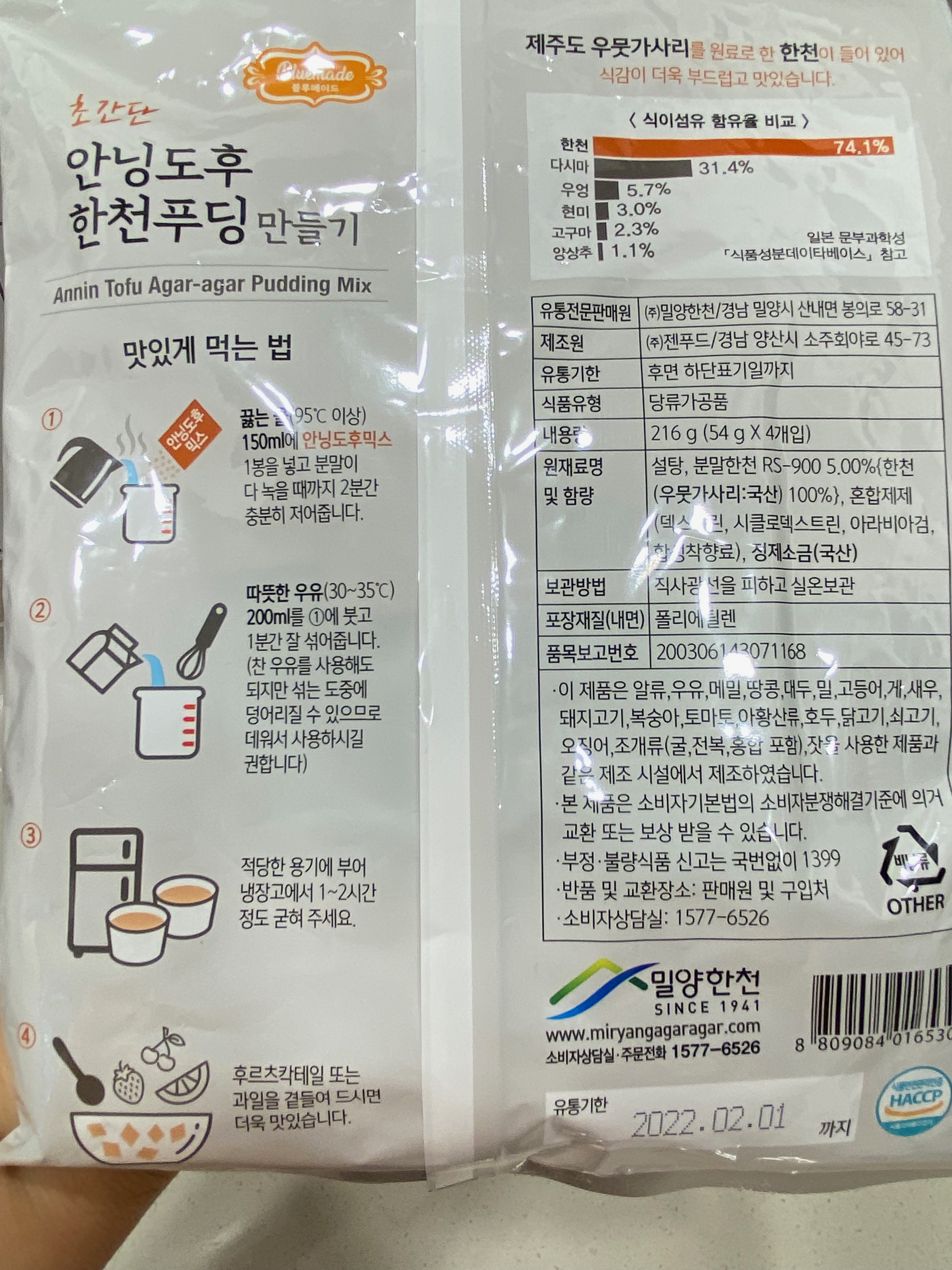 밀양 한천 박물관에서 푸딩 만들기 체험을 하고 나서 뭔가 좀 아쉬운 감이 들었답니다. 그래서 이번엔 아이랑 함께 홈쿠킹에 도전해 봤습니다. 푸딩 만들기 세트가 한천 쇼핑몰에 팔더라고요. 체험장에서 만들어봤던 망고 푸딩도 있던데 그걸 살까 하다 우유랑 만들어서 먹는 푸딩 세트를 구입했습니다. 흰 우유를 집에선 거의 먹질 않아서 겸사겸사했지요. 한 봉에 4번 푸딩을 만들어 먹을 수 있는 안닝도후 믹스가 들어가 있고, 그 외 기호에 맞게 먹을 수 있게 과일 통조림을 복숭아, 파인애플, 코코아 요렇게 구입을 했습니다. 흰 우유는 당연히 필수고요.
