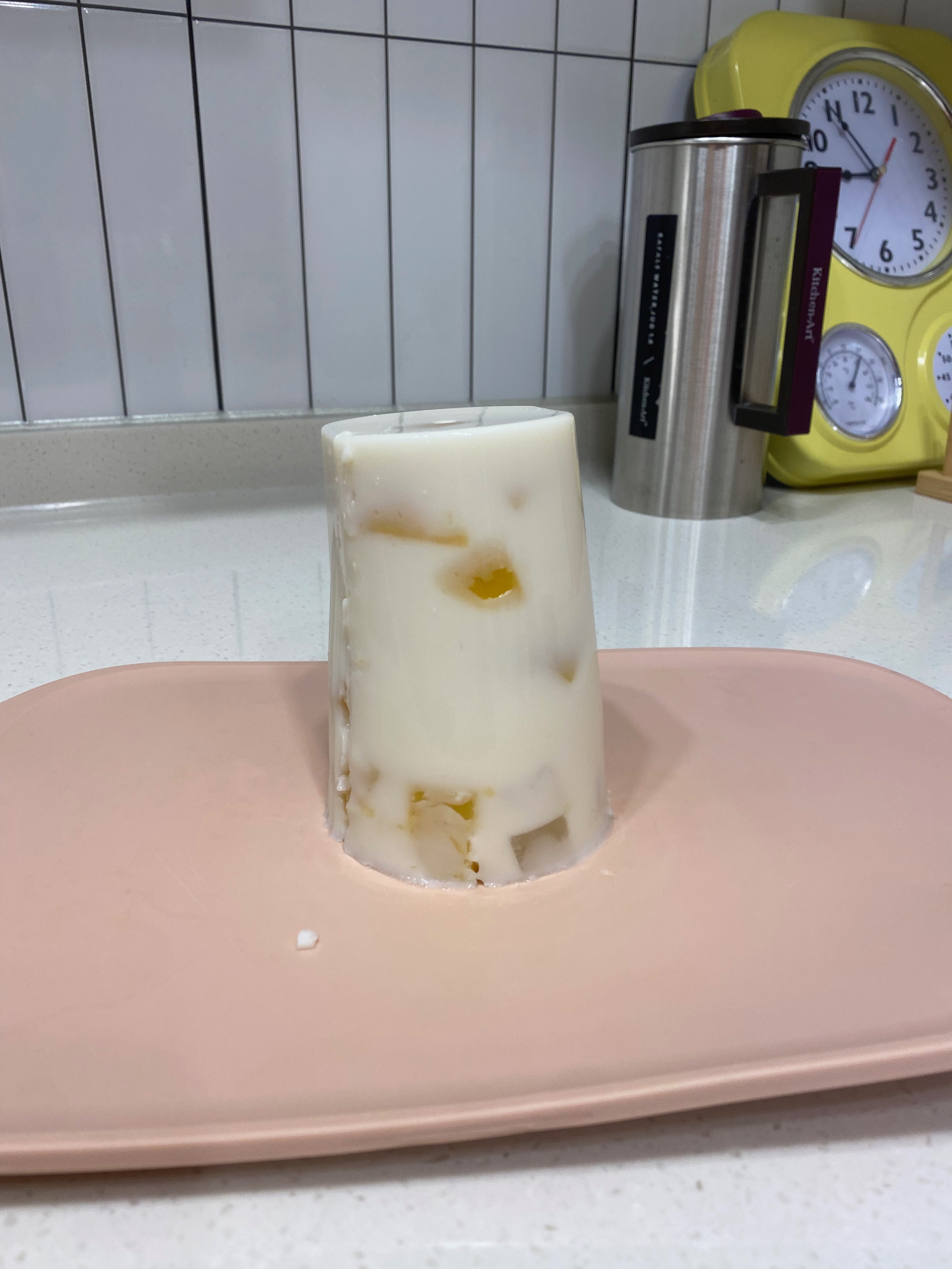 용기가 마땅히 없어서 제가 사용하는 텀블러에다 담아봤습니다. 잘 썰어놓은 통조림 표 과일을 미리 컵에다 담아둬야 하는 거 잊지 마세요!! 그 담에 안도닝후 믹스와 우유가 섞여있는 푸딩 용액을 텀블러에 부어주고 다시 한번 조심히 젓가락으로 휘~ 저어서 식을 때까지 두면 초간단 푸딩 만들기 체험은 끝이 납니다. 식으면 굳어지고 다 식은 푸딩은 하루 정도 냉장고에 넣어서 한 번 더 차갑게 해주면 탱글탱글 맛있는 푸딩이 됩니다.