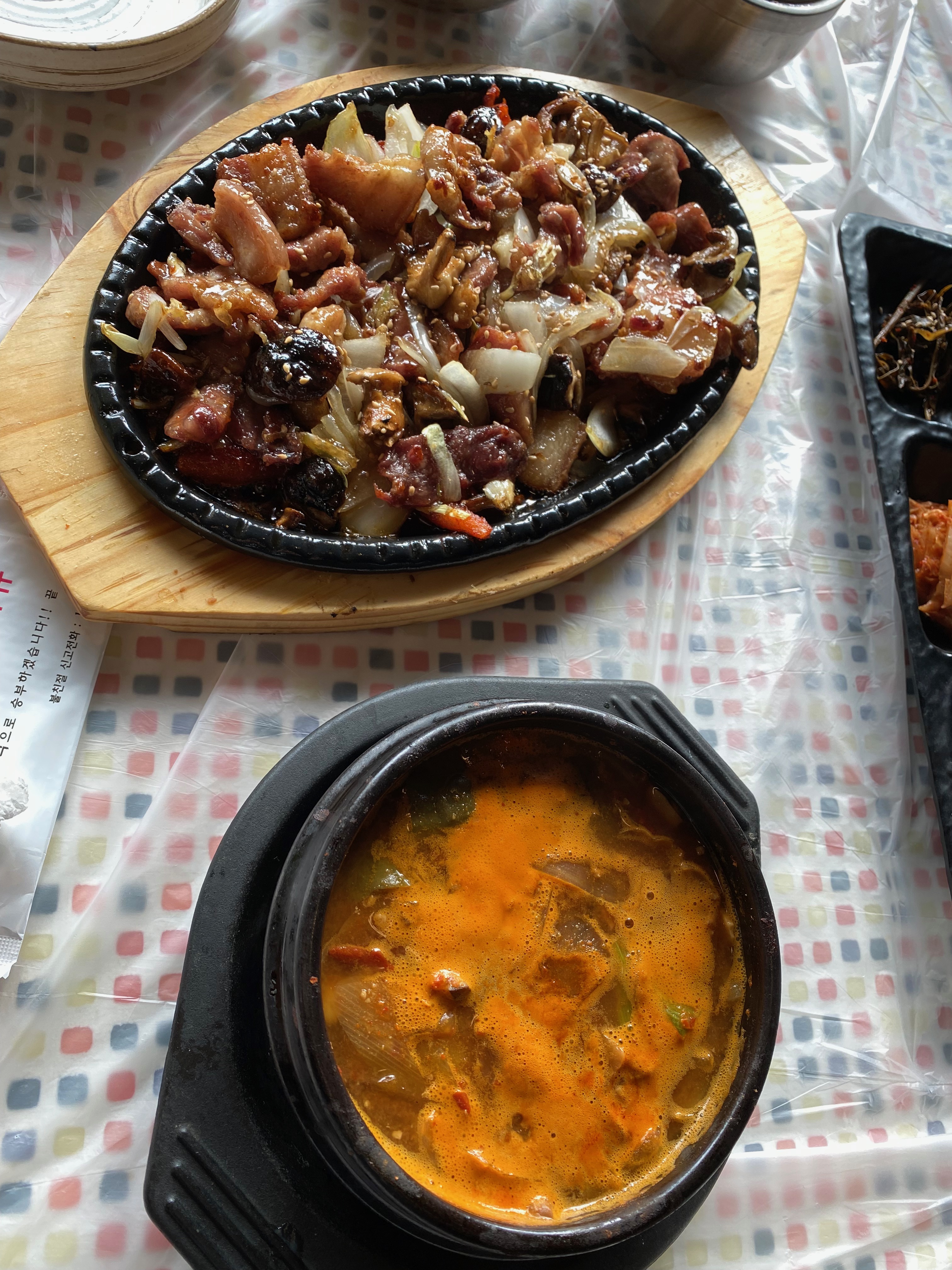 마무리로 누룽지까지~~ 한상 깔끔하게 2인분 나왔는데요, 확실히 무주는 전라도라도 전라남도 음식과는 맛이 차이가 나더군요. 지극히 개인적 입맛은 음... 깔끔한 평타 수준의 맛이랄까요? 특색 있는 맛은 아니고 밑반찬도 그렇고 직접 담은 음식이라 정성은 있는데요, 제 입맛을 화~ㄱ!! 사로잡는 맛은 아니었습니다. 메인 메뉴인 더덕 석 목살 구이는 고기가 두툼하니 씹는 맛이 있고 더덕구이에 사용된 양념장과 고기가 조화로운 맛은 아닌데 제법 먹을만합니다. 더덕은 밑에 석쇠에 찰싹 달라붙어 잘 구워져 있는데 양념 간이 너무 많이 배겨서 더덕만 먹기엔 좀 짭니다. 고기랑 같이 드셔야 맛이 중화되어서 괜찮아요. 아들 먹으라고 시킨 더덕 석 목살은 결국 짧은 입맛의 아들 덕분에 엄빠가 다 싹싹 클리어했다는.... 아들은 매울 법도 한 된장찌개와 누룽지로 한 끼를 든든히 채웠답니다. 전라도 음식이라도 확실히 남도 음식과는 그 맛이 차이가 많이 납니다. 갠적으로는 남도 음식을 훨씬 더 맛있게 잘 먹습니다. 그래도 나름 가족과 함께 여행을 온 것이라 즐겁게 한 끼 식사를 즐겼네요. 구수한 누룽지 한 사발 하고 싶은 분들께 소개해 드립니다.