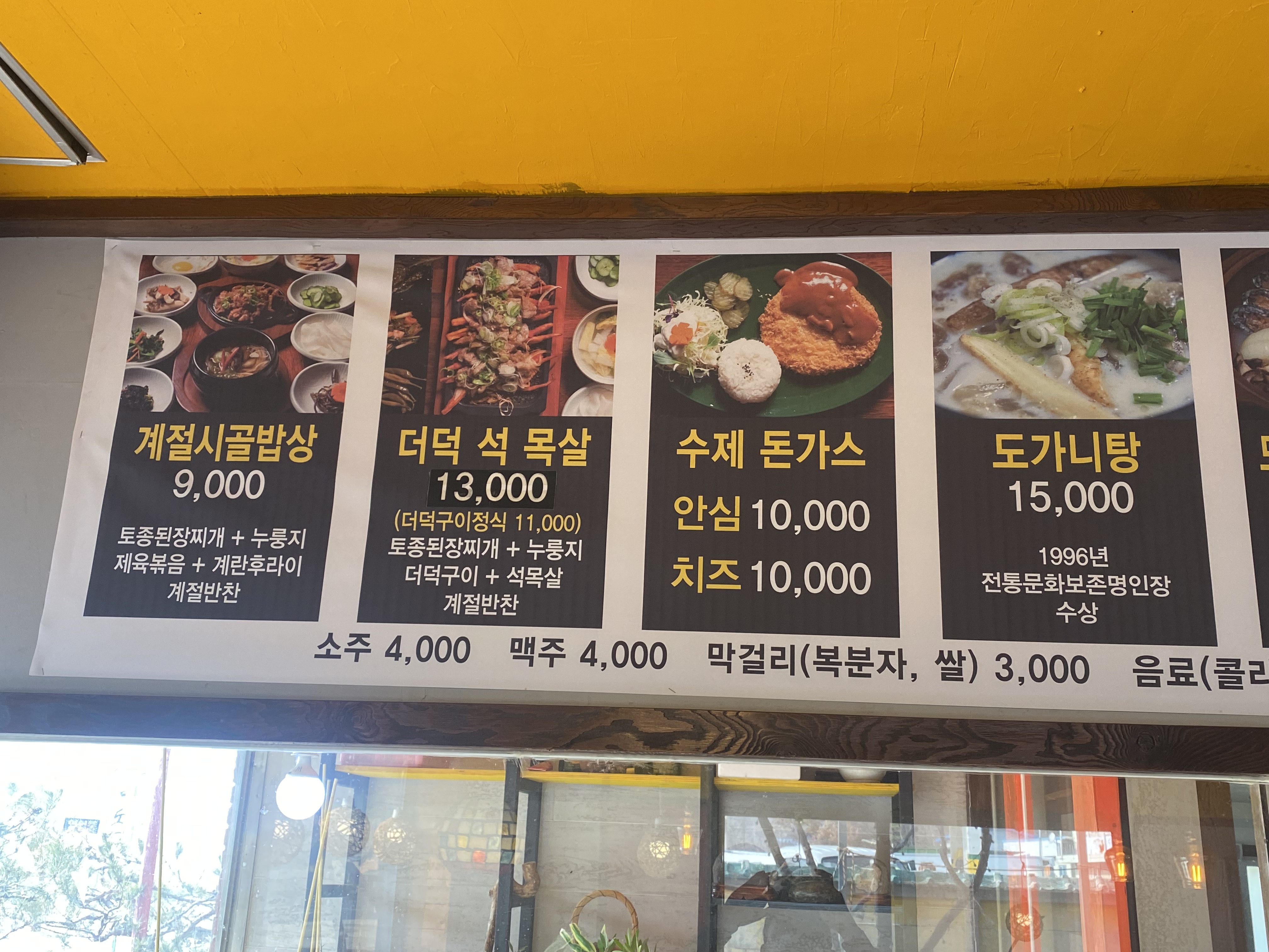 메뉴판은 그냥 식당 벽면에 있는 걸로 보고 선택을 해야 하는데 6살 아들 입맛에 맞는 음식을 찾다가 더덕 석 목살 메뉴를 2인분 시켰습니다. 원래는 계절 시골밥상이 아들과 같이 먹기에 딱일 거 같아서 갔었는데 사장님 왈 아기가 먹기엔 더덕 석 목살을 강추 하시더라고요.