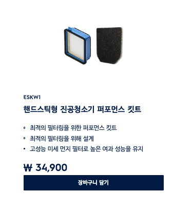 집에서나 학원에서나 기본 25분 정도 작동으로 모든 공간을 다 커버하는 제품인데요, 문제는 청소 흡입력을 유지시켜주는 가장 중요한 헤파필터가 작아서 그런지 일주일 정도만 지나면 항상 물 세척을 해서 깨끗하게 해줘야 청소기 성능을 꾸준하게 유지할 수 있다는 겁니다. 소형 무선 청소기의 한계가 아닐까 싶은데요, 할 수 없이 추가로 헤파필터를 구입하기 위해 일렉 홈페이지에 방문을 해봤더니 글쎄~ 스펀지와 필터를 키트로 묶어서 34,900원에 팔고 있는 거 아니겠습니까?