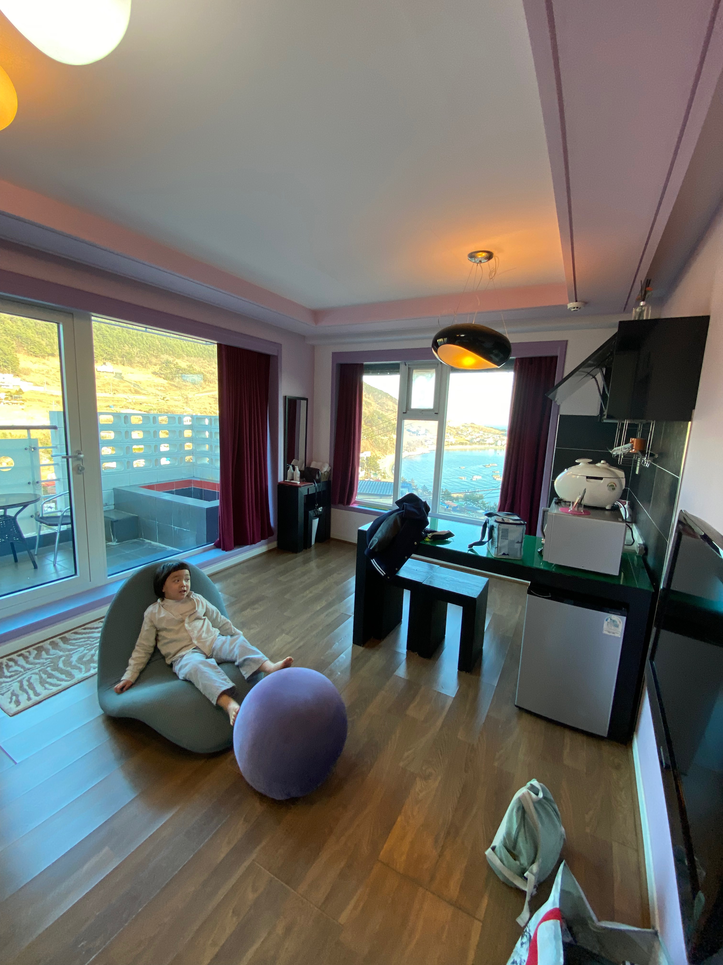 입구 올라가는 길이 초보 운전자라면 좀 불안불안~ 주차까지도 불안불안~ 할듯합니다. 원룸 스타일로 들어가면 양 90도 벽을 타고 탁 트인 창이 있습니다. 개방감은 좋아요^^ 그리고 화장실도 따로 분리되어 있고 야외 베란다에서 바비큐를 할 수 있는 장비가 세팅되어 있으며 1인용 노천탕을 즐길 수 있는 욕조도 마련되어 있는데...... 바비큐를 이용할 수 있게 만든 게 이곳 최대의 실수가 아닐까.... 타일 바닥이며 욕조까지 이어지는 전체가 대략 난감입니다. 저흰 과감히 그냥 포기하고 만원 사용료를 내고 자이글 빌려서 실내 고기파티를 했었답니다^^