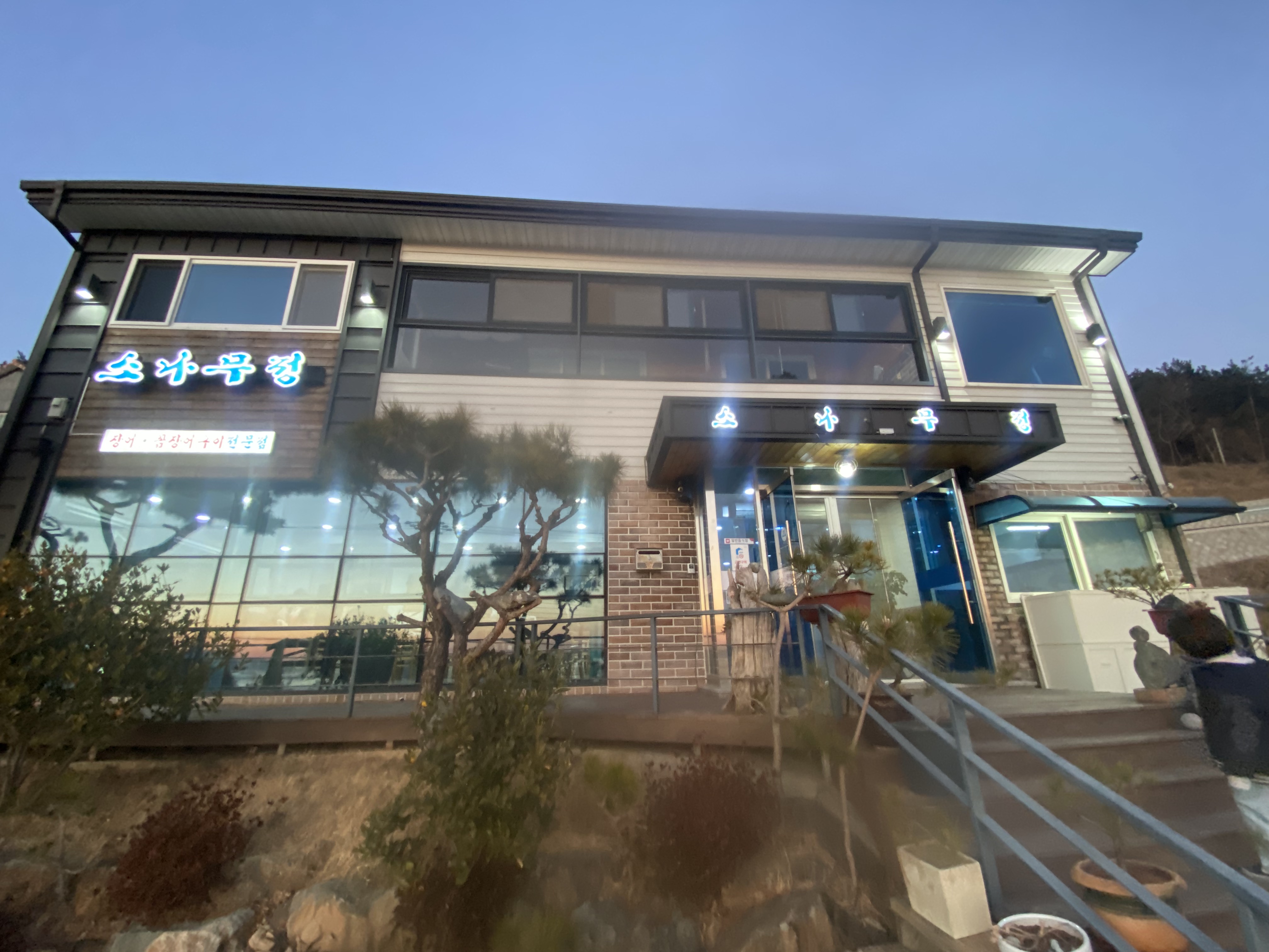 남해 여행 첫날 엘니도 펜션에서 체크인을 하고 저녁을 뭘 먹을까 이래저래 알아보다가 숙소 위치가 남해에서도 제법 외지인데다 주변 편의시설이 없어서 제일 가까운 곳으로 알아보고 정했답니다. 식당 이름은 '소나무정'이고 장어, 곰장어 구이 전문집인데 저희는 7살 아들 때문에 갈치조림으로 주문을 했지요. 방문 당일 외지인들이 제법 방문해서 곰장어 구이를 드시고 계시더군요. 사진은 최대한 사람들이 안 나오게 급히 각도를 조절해 촬영을 했습니다.
