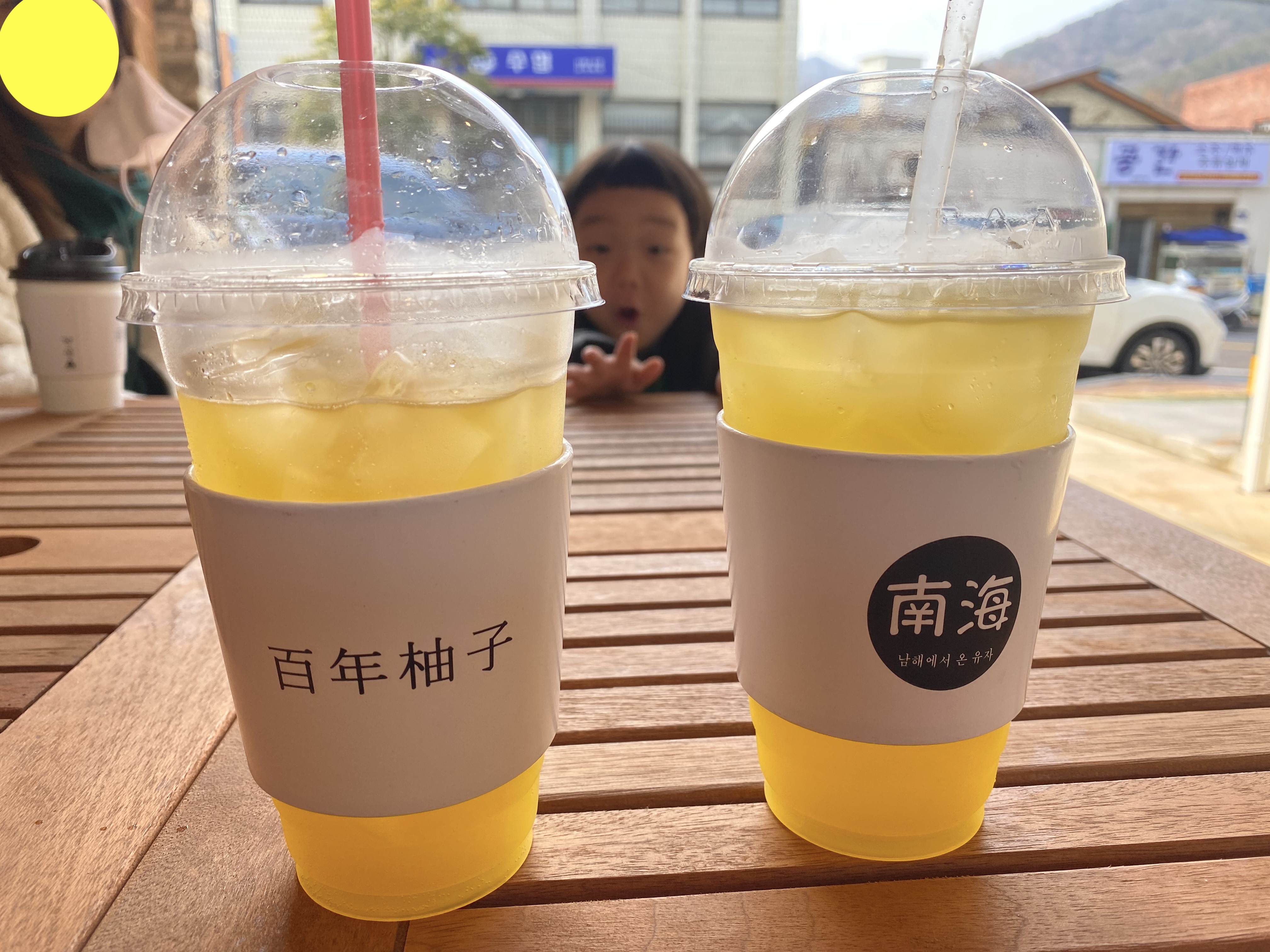 아들을 위해 바깥 테이블에서 잠시 음료를 즐기는 시간을 가졌는데요, 유자쥬스는 원액에 물만, 유자에이드는 원액에 탄산수를~ 톡 쏘는 맛이 일품입니다^^
